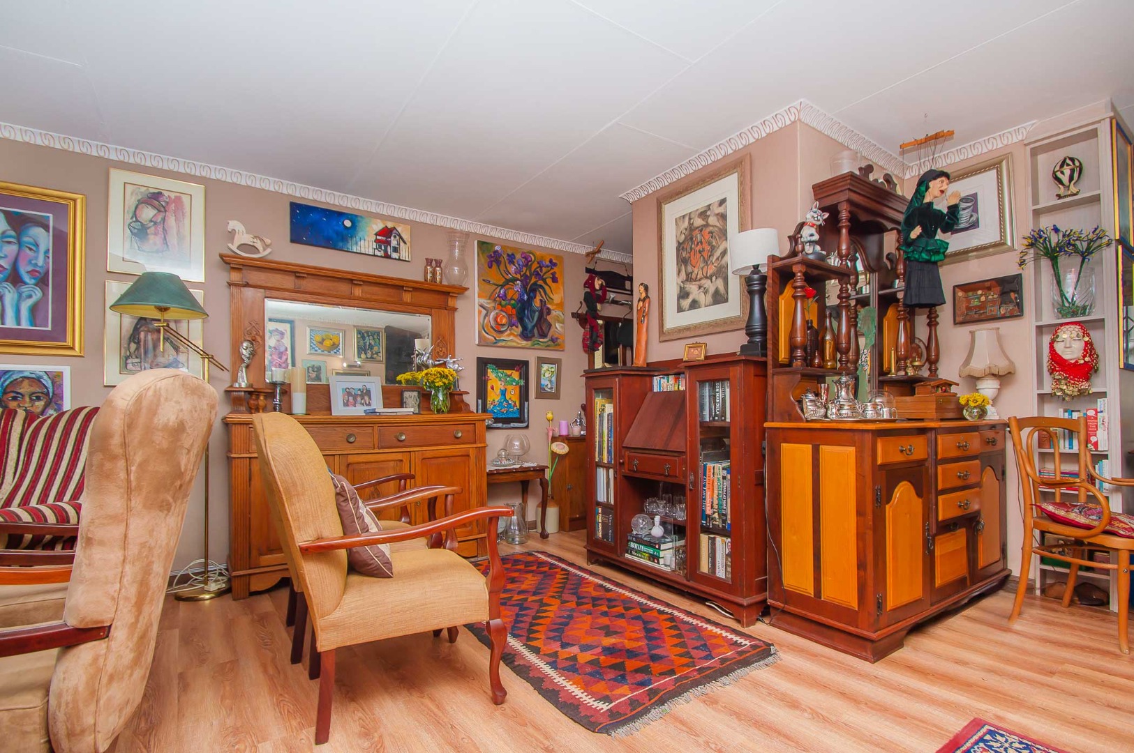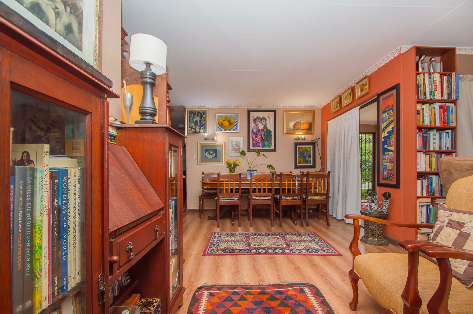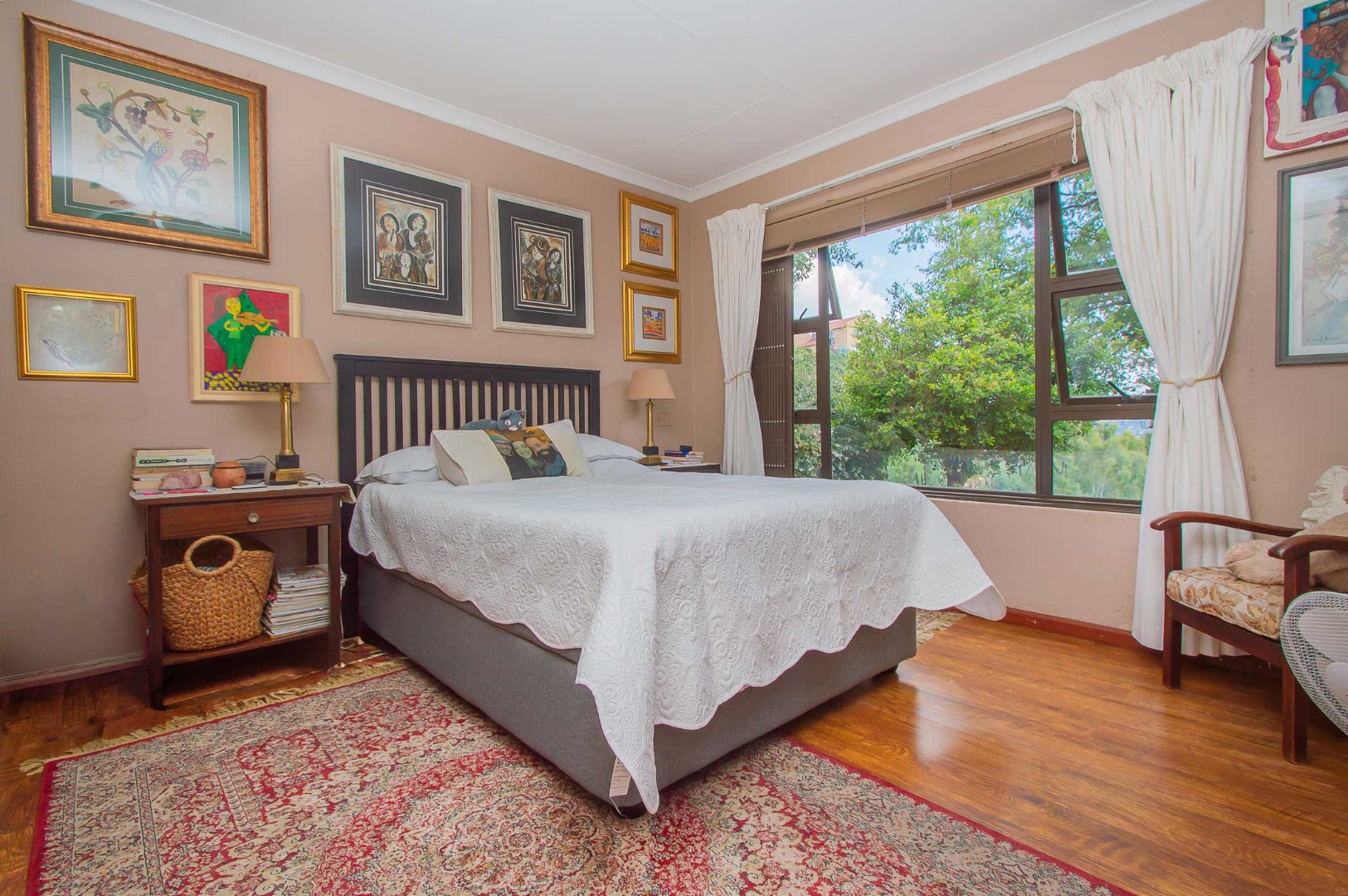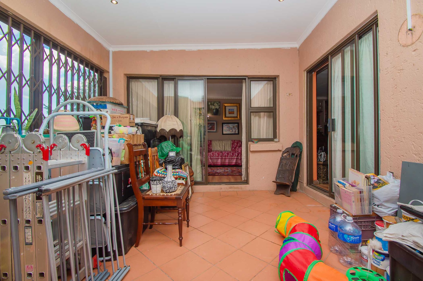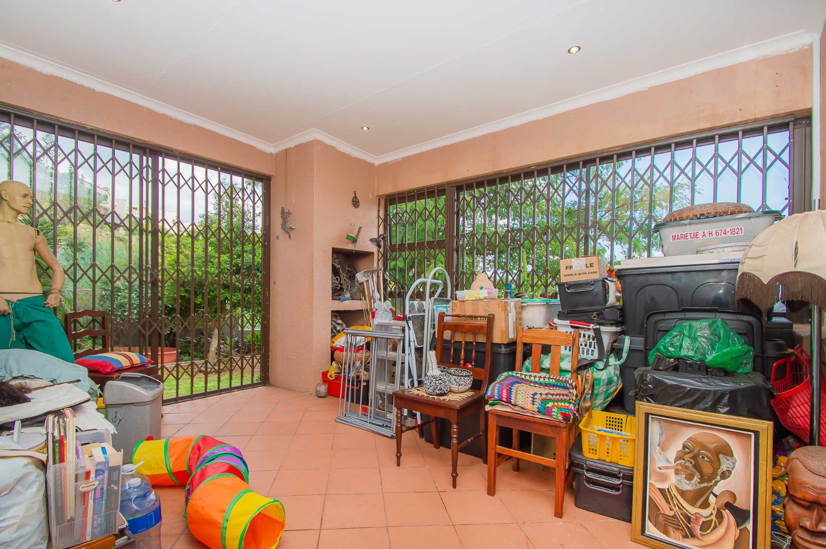 The main bedroom is double volume in size, is filled with natural light, has built-in cupboards, laminate flooring and an en-suite bathroom that has a bathtub, toilet, b-day and a vanity – the bathroom is tiled to the roof. The second bedroom has built-in cupboards, and third bedroom is spacious and used as an office. The second and third bedrooms are complimented by the second bathroom that has a toilet basin and shower and is tiled to the roof.