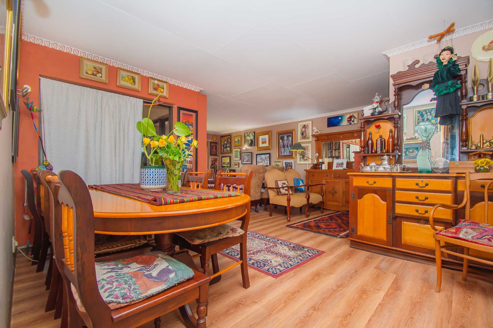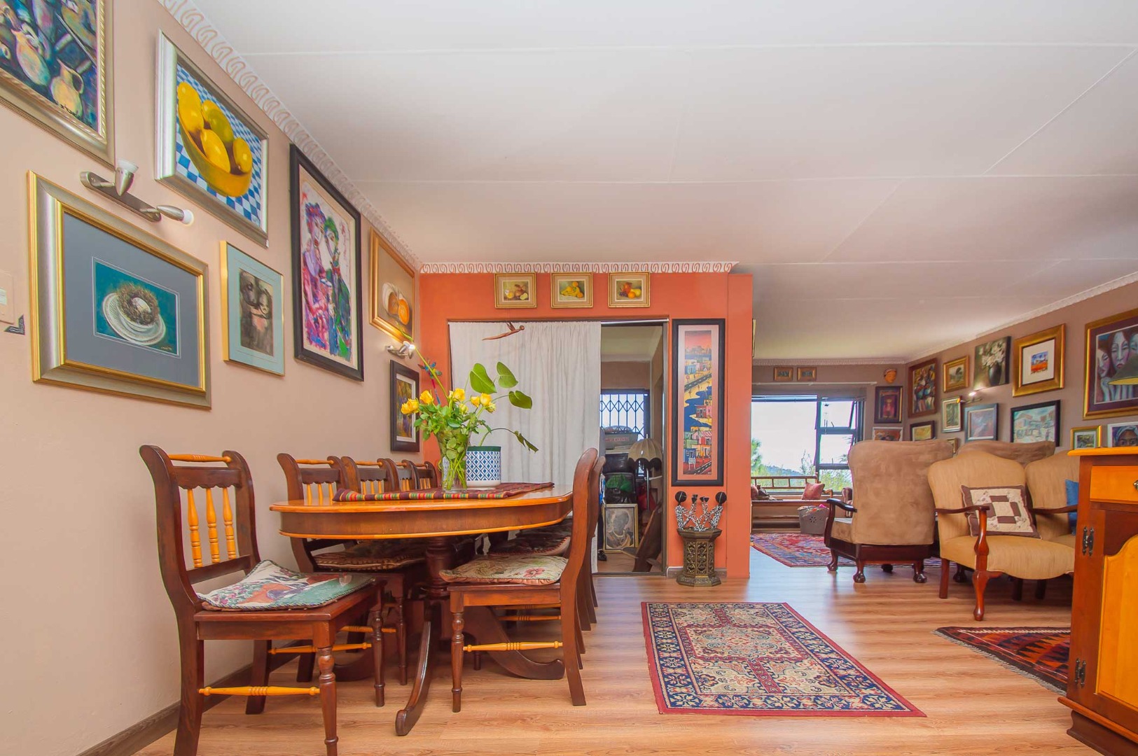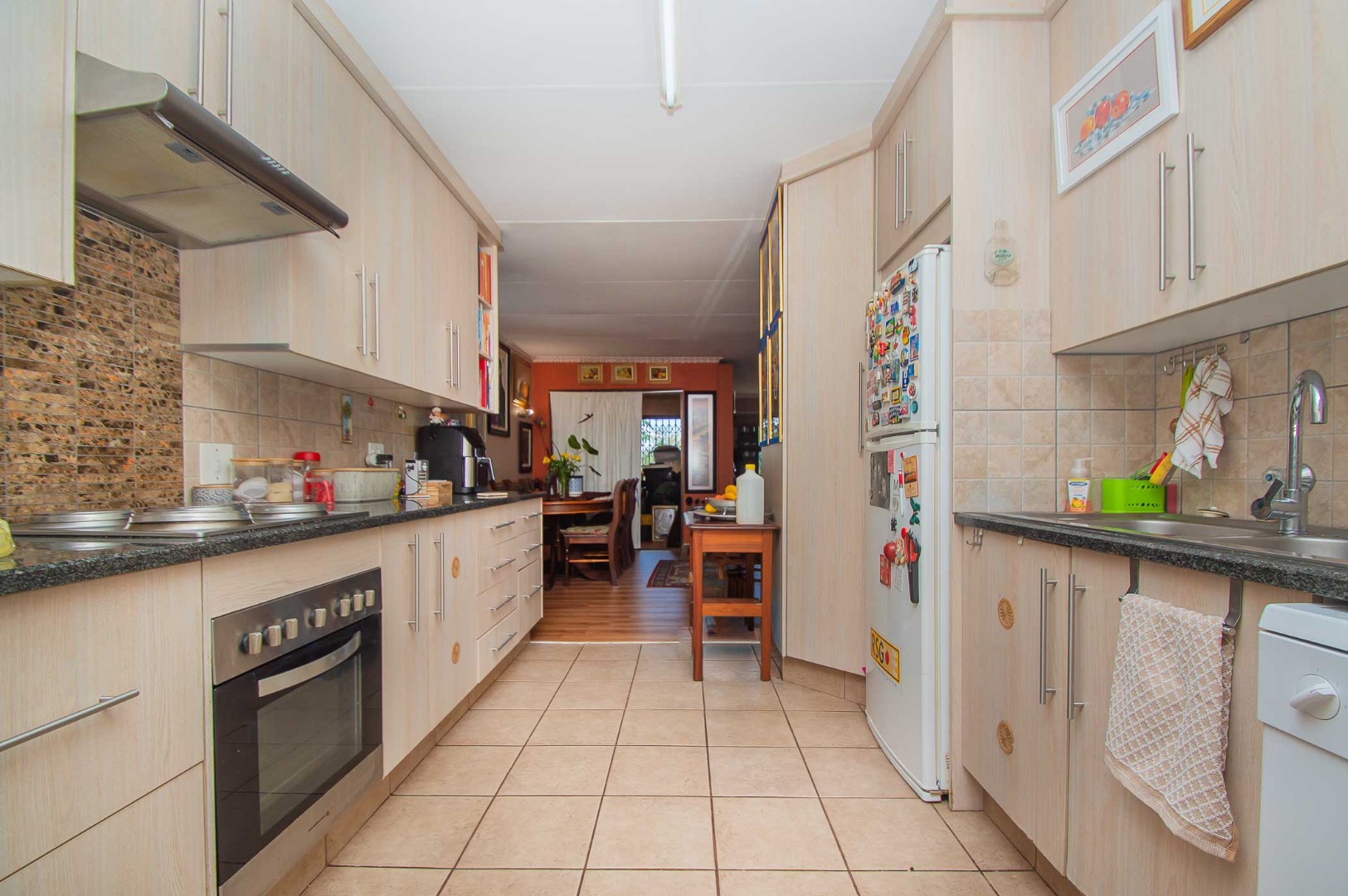 Upon entrance you are welcomed by open plan living areas and an enclosed patio with a built-in braai. Spacious kitchen with ample cupboards, granite counter tops, an oven and hob with a backsplash, a pantry, space for a fridge and 3x appliances. The kitchen flows directly into the large open plan dining area and lounge that have laminate flooring. This leads into the enclosed patio for entertaining.