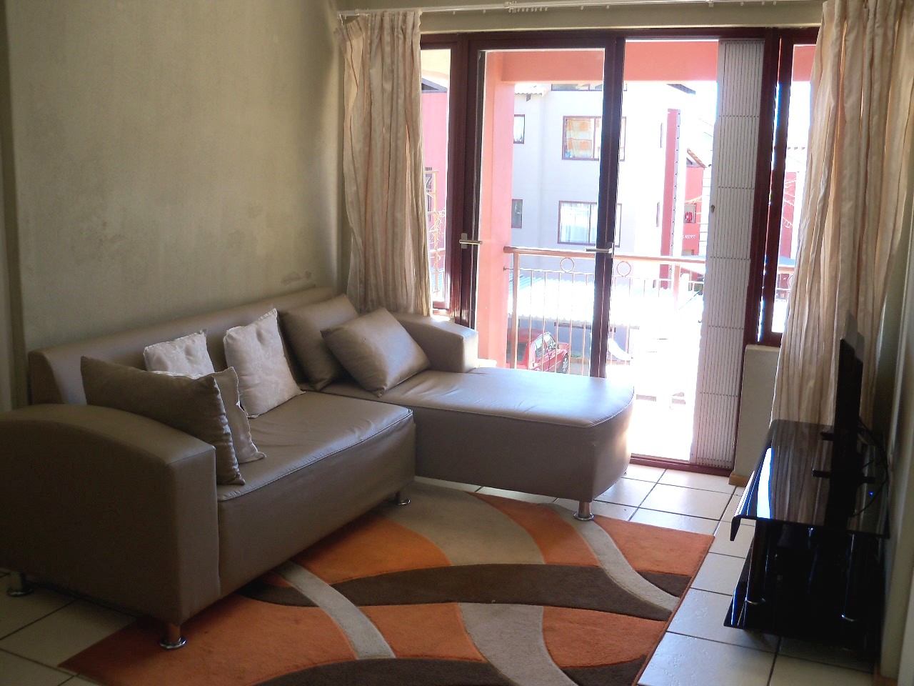 Open-plan kitchen leading onto small lounge area, leading onto a small covered balcony