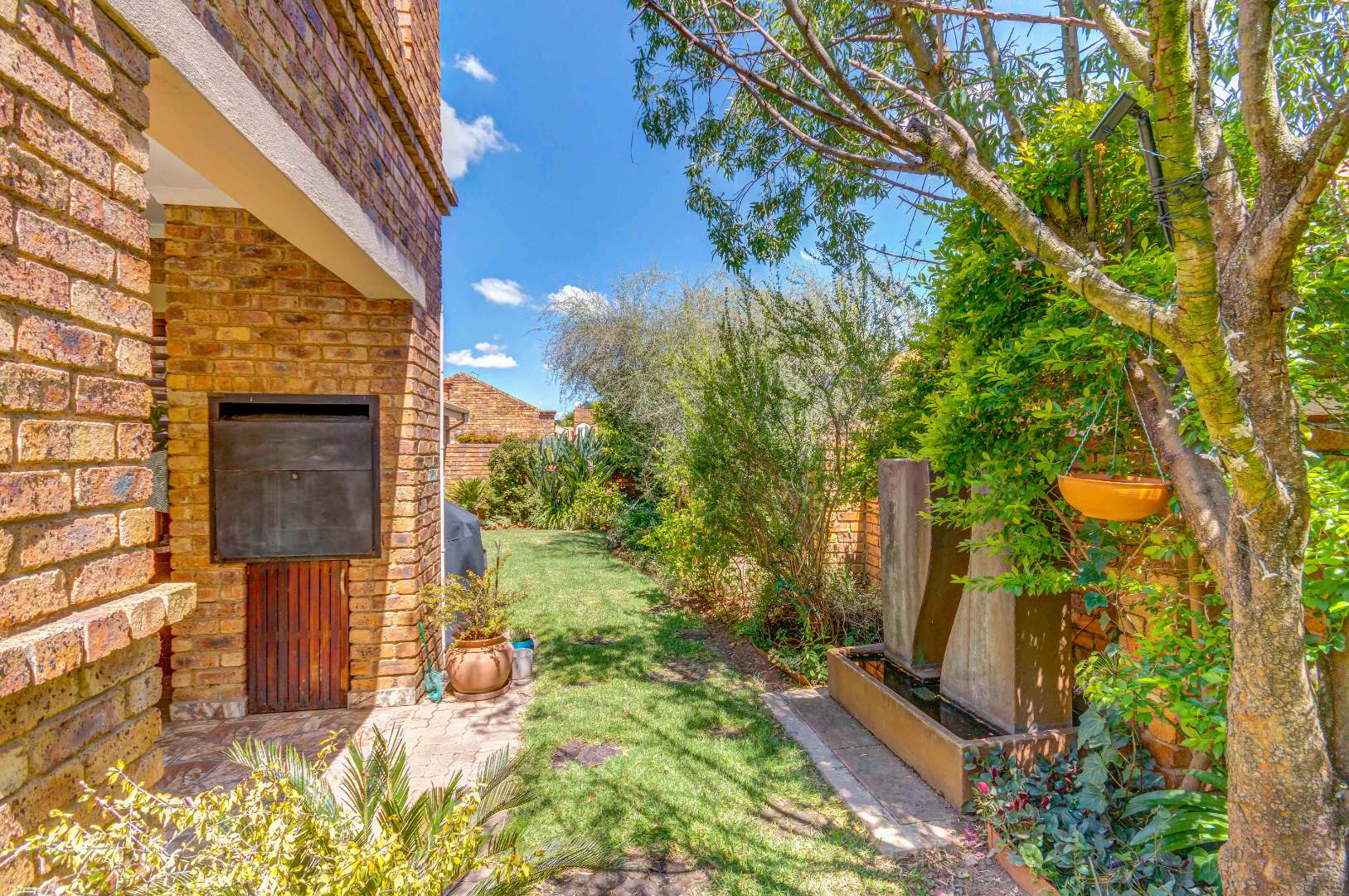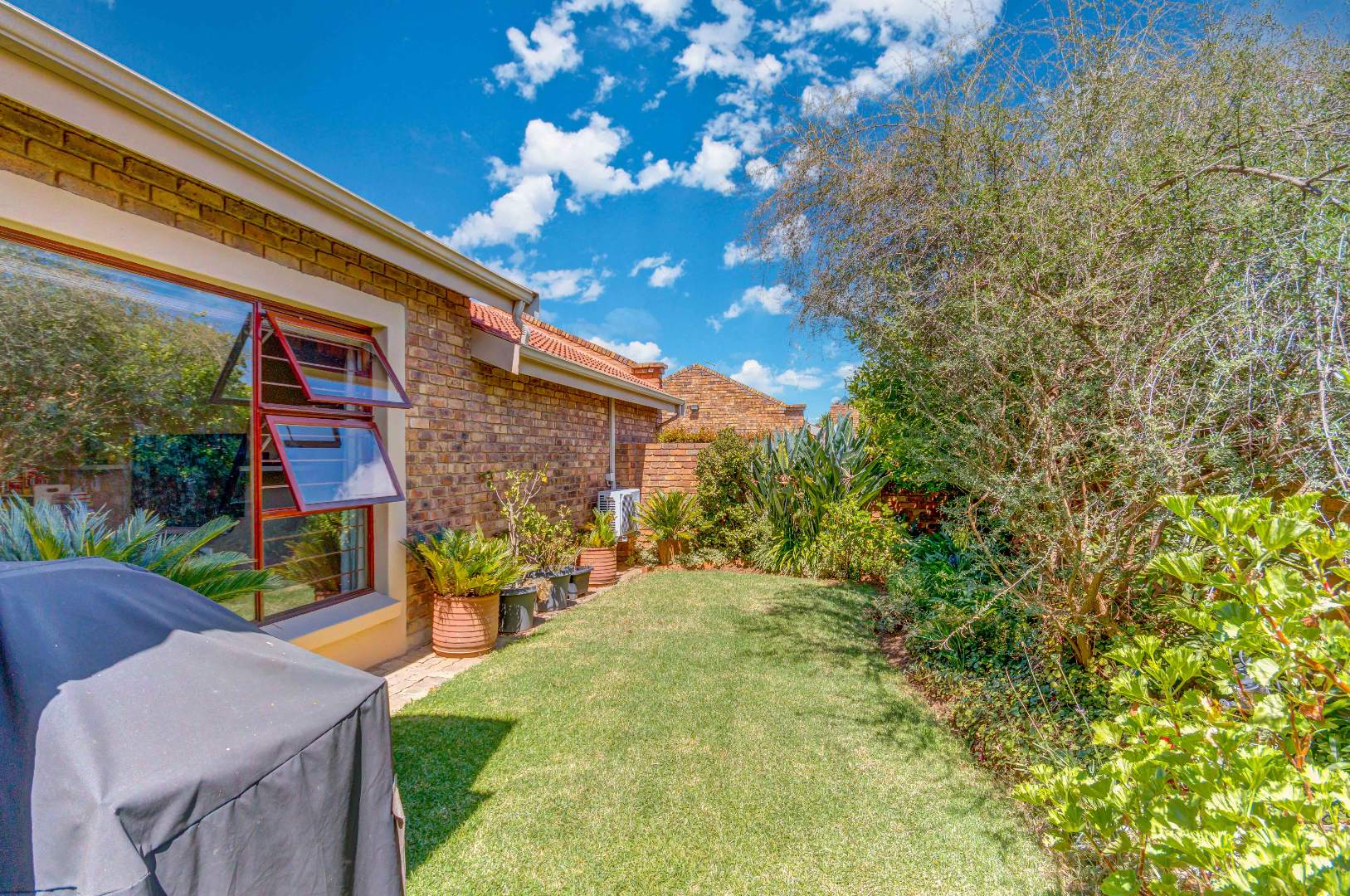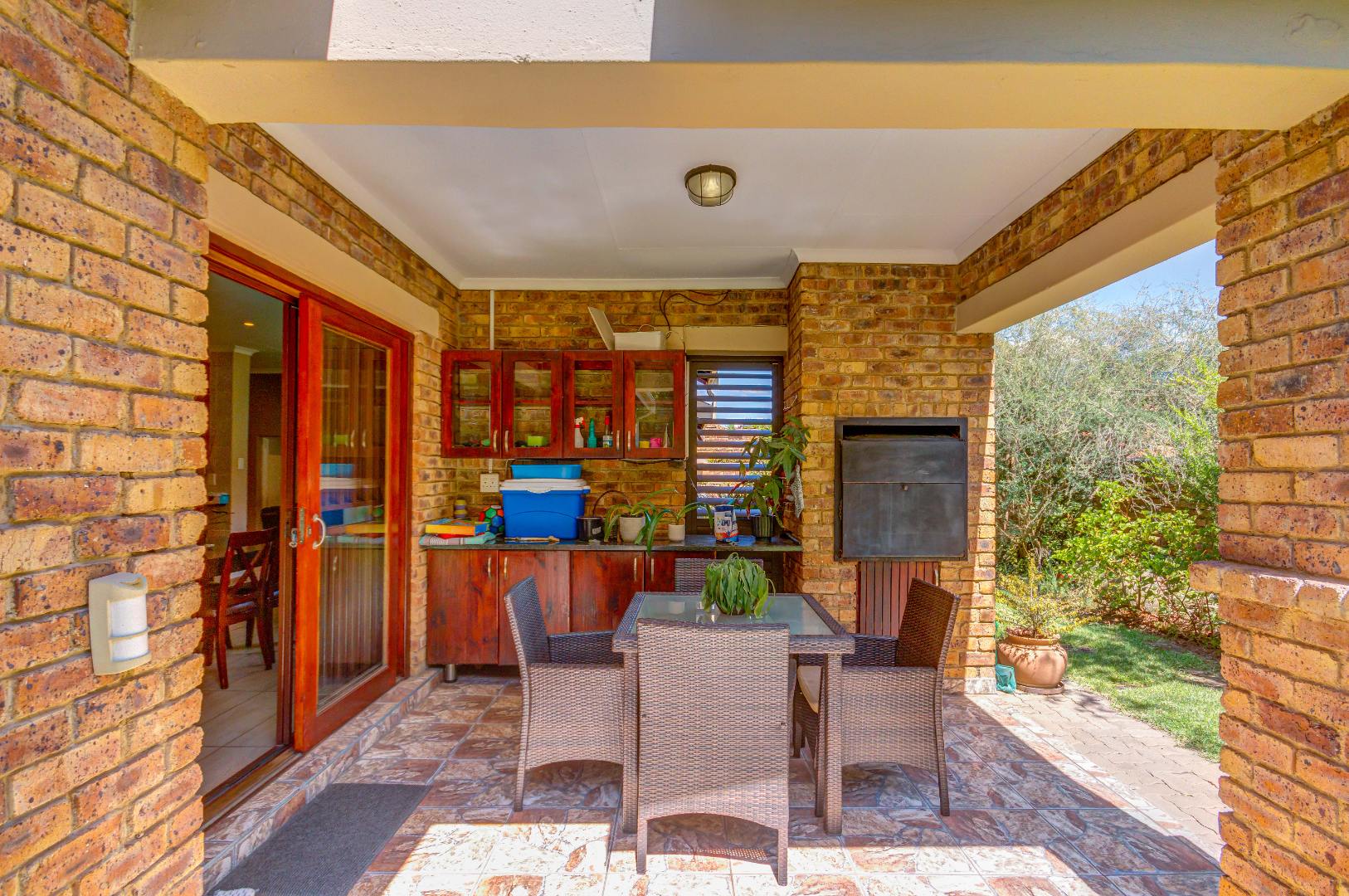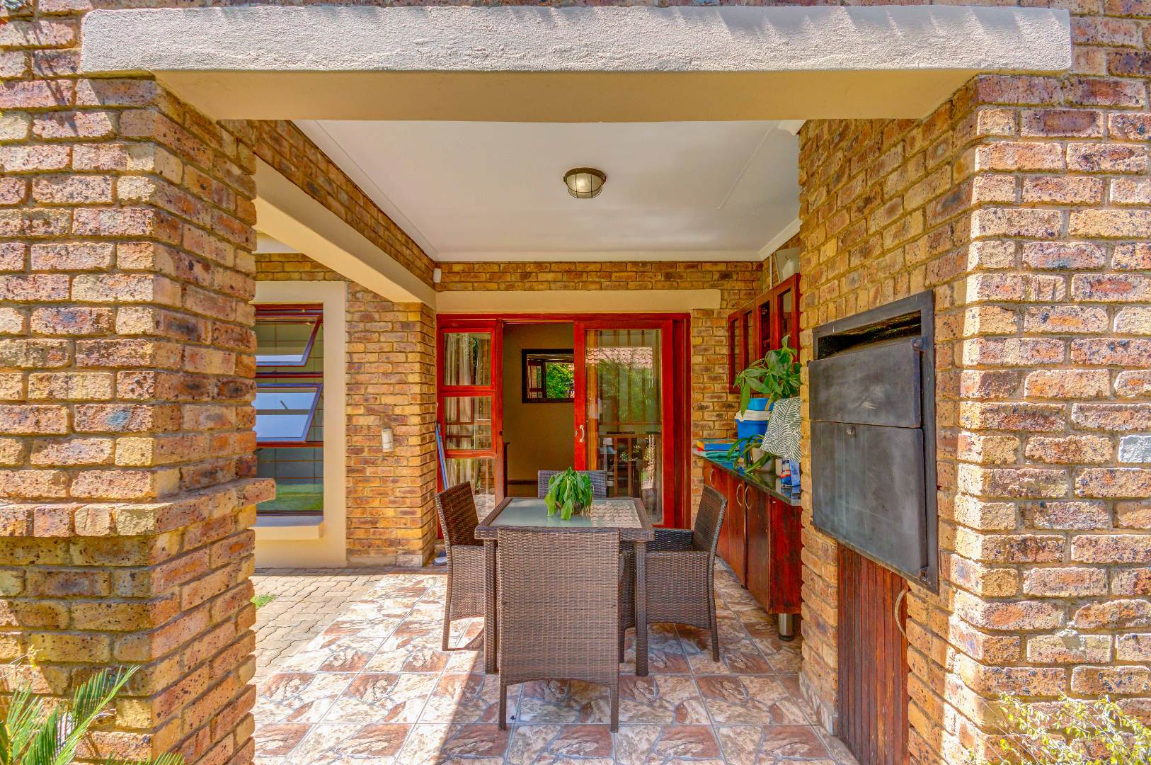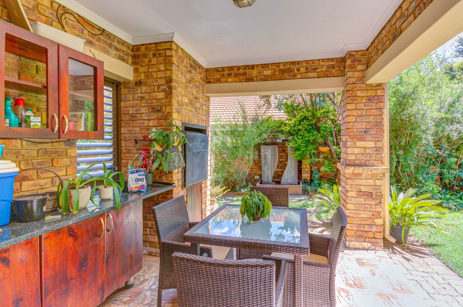 French doors from the dining area lead out to a lovely covered patio with a built-in braai and counter space — ideal for entertaining family and friends. The gorgeous wrap-around garden is beautifully maintained and fitted with an irrigation system, making it both attractive and easy to care for.