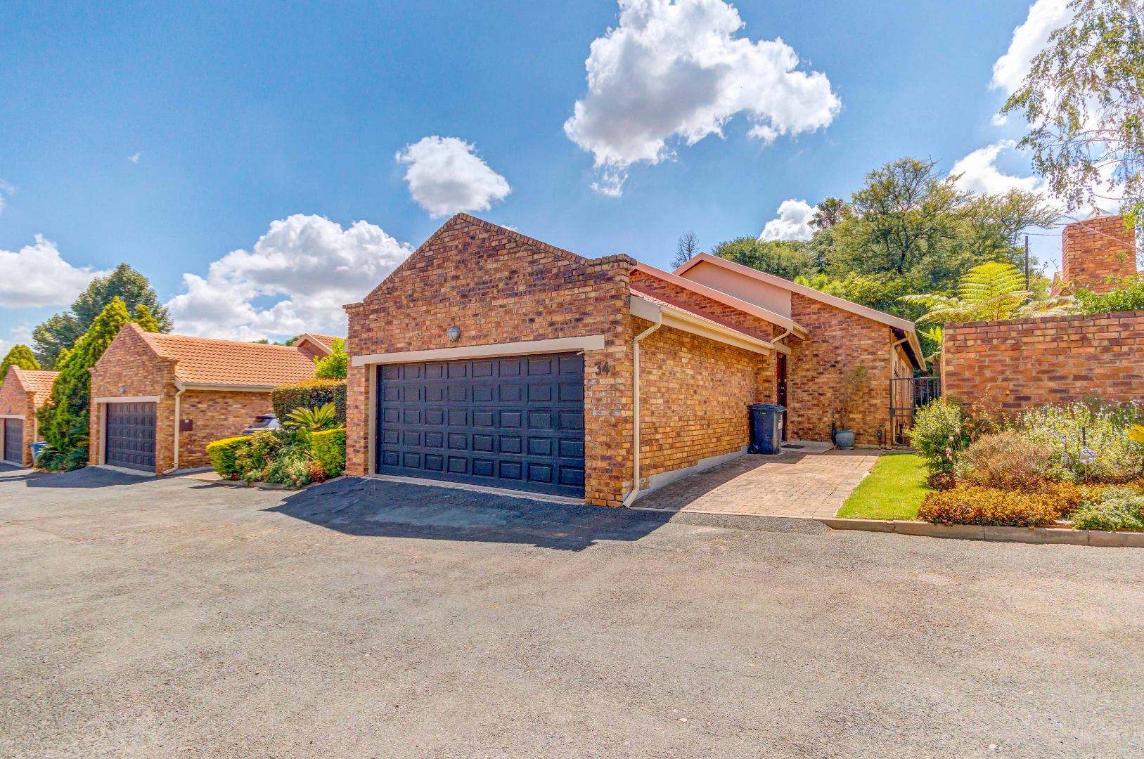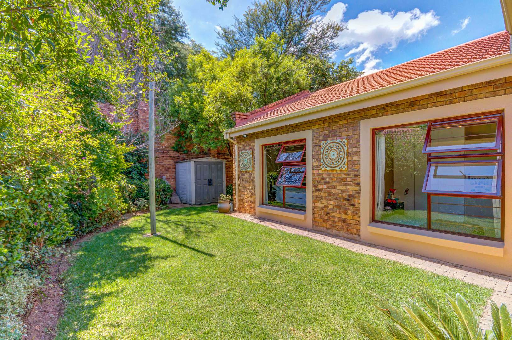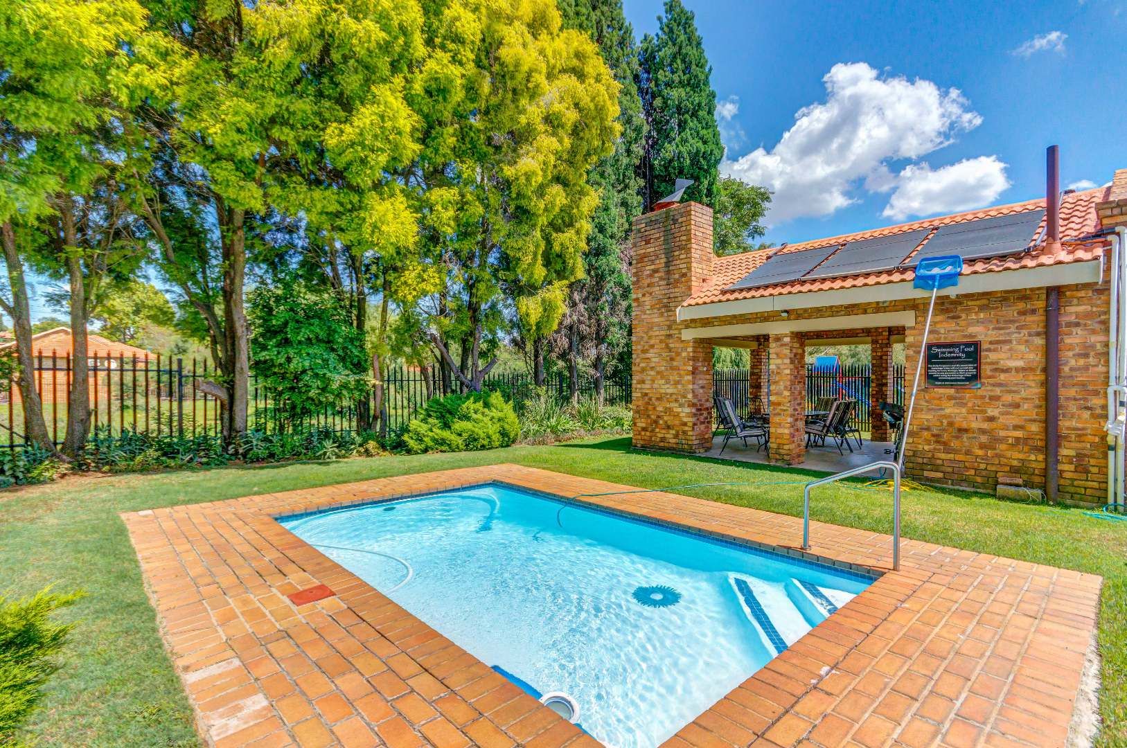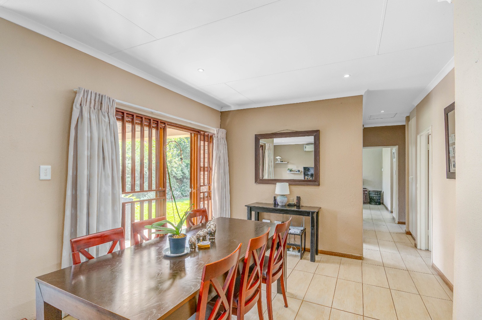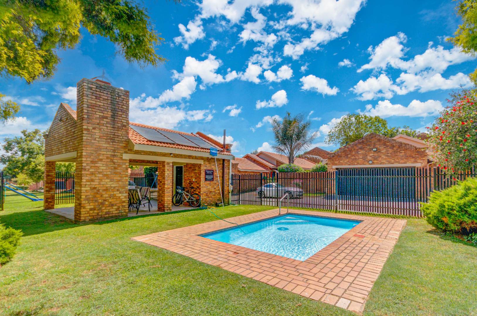 French doors from the dining area lead out to a lovely covered patio with a built-in braai and counter space — ideal for entertaining family and friends. The gorgeous wrap-around garden is beautifully maintained and fitted with an irrigation system, making it both attractive and easy to care for.