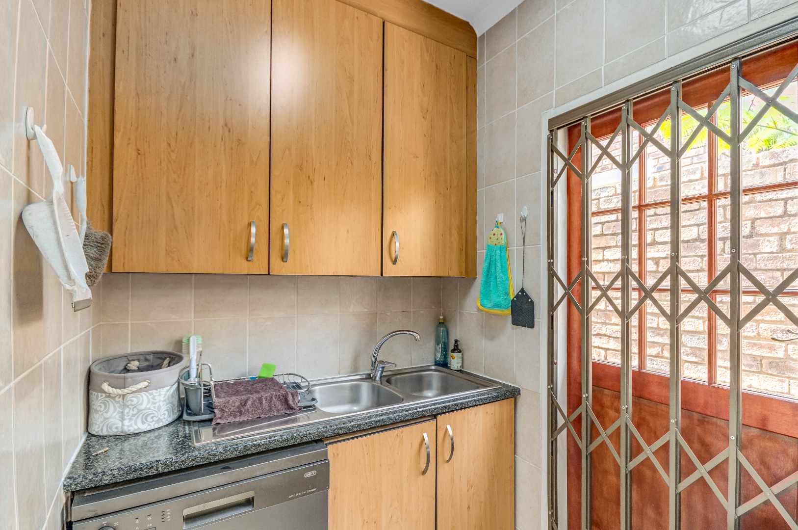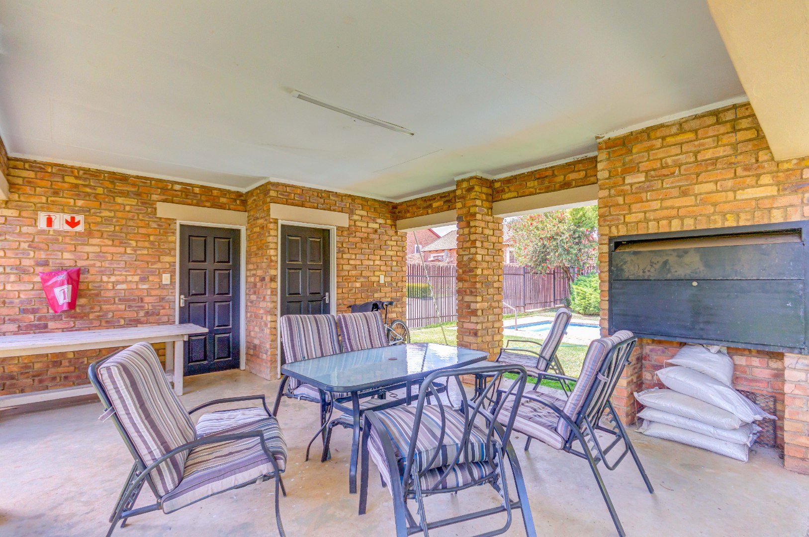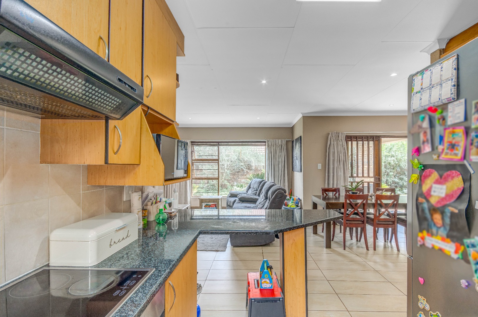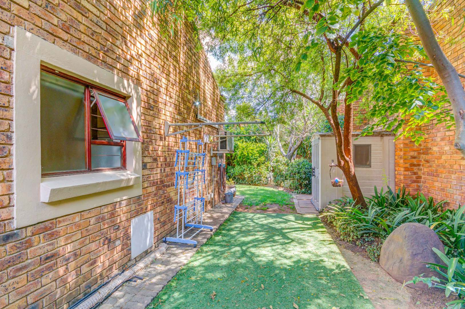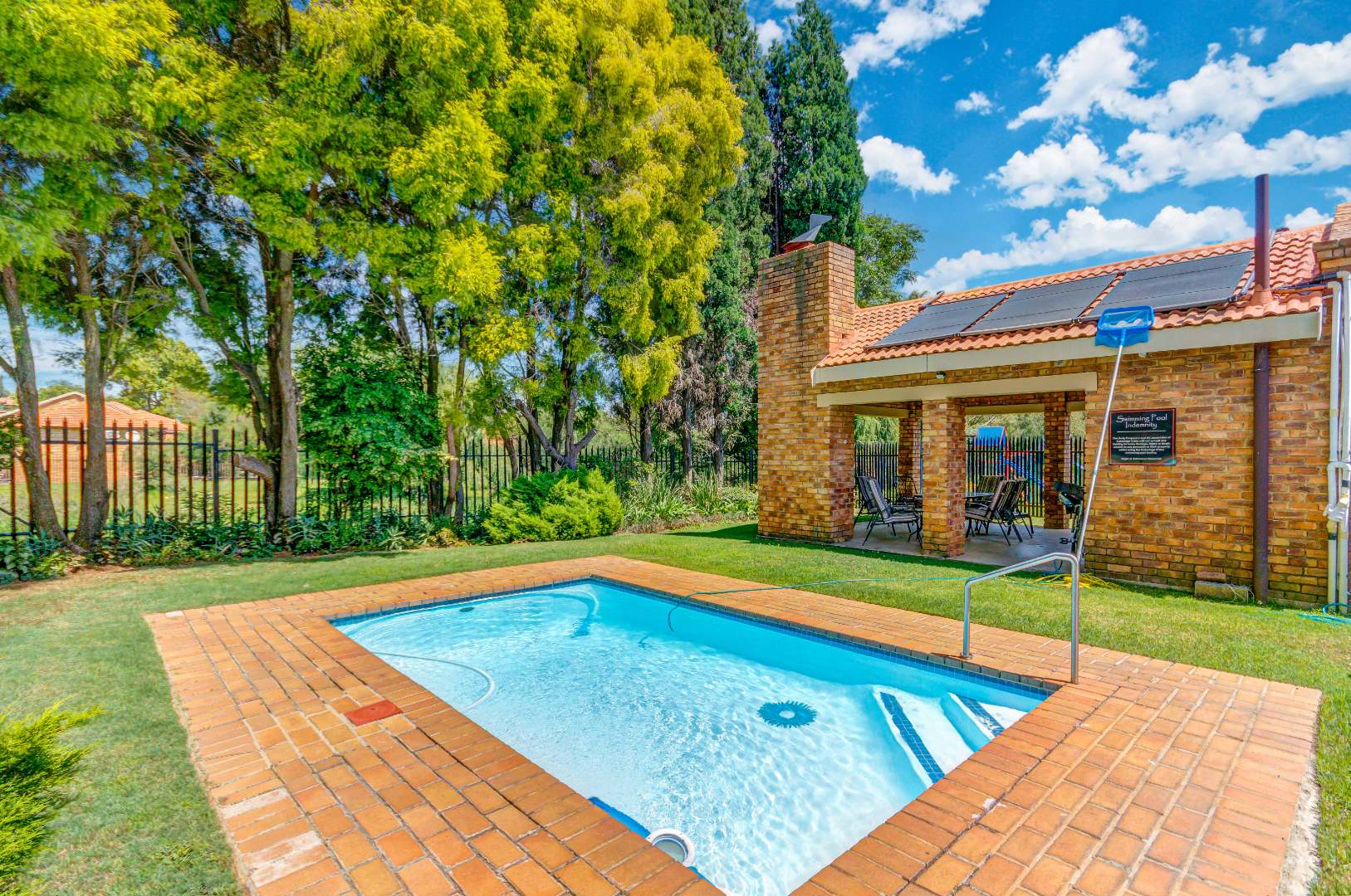 French doors from the dining area lead out to a lovely covered patio with a built-in braai and counter space — ideal for entertaining family and friends. The gorgeous wrap-around garden is beautifully maintained and fitted with an irrigation system, making it both attractive and easy to care for.