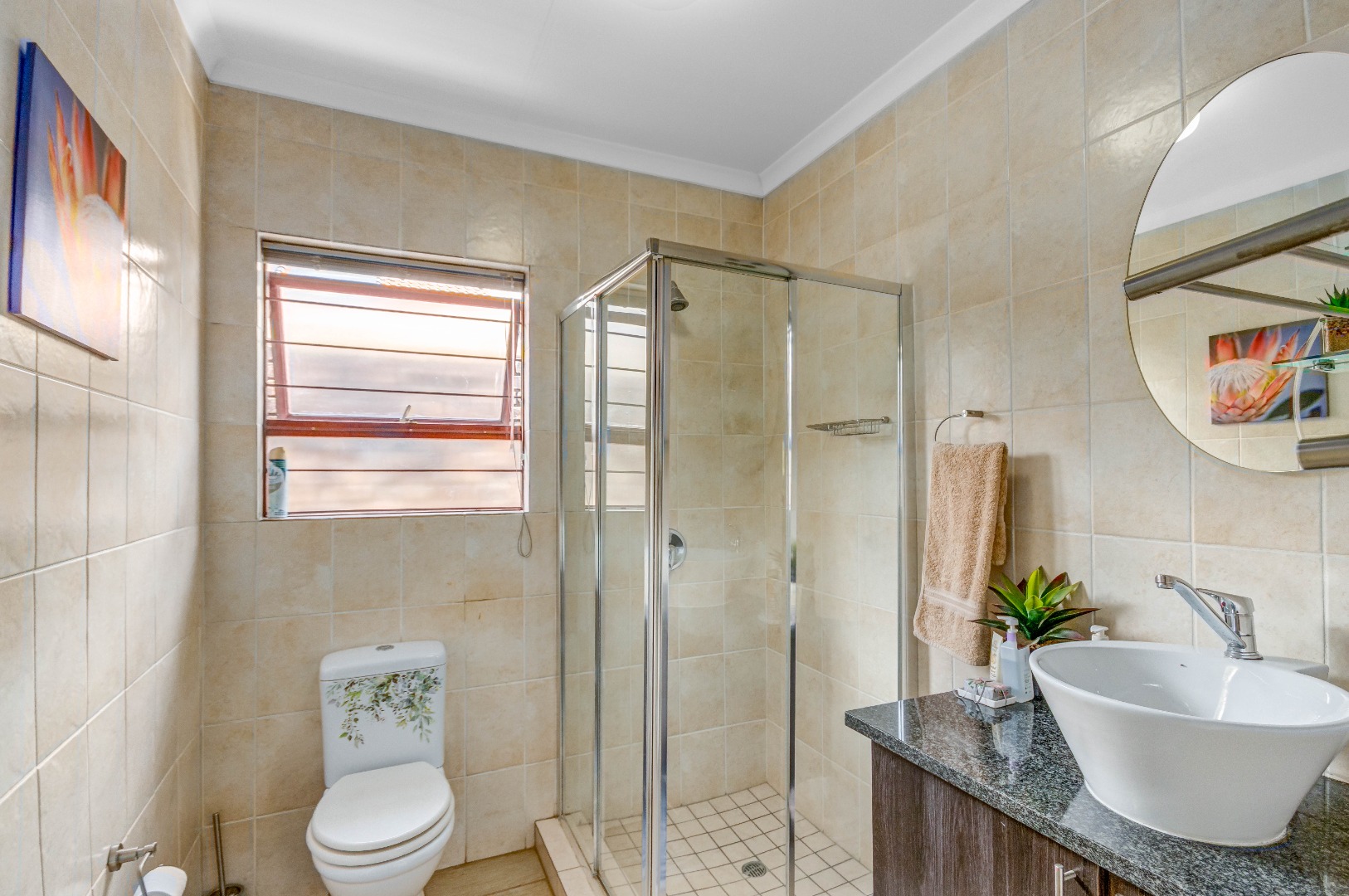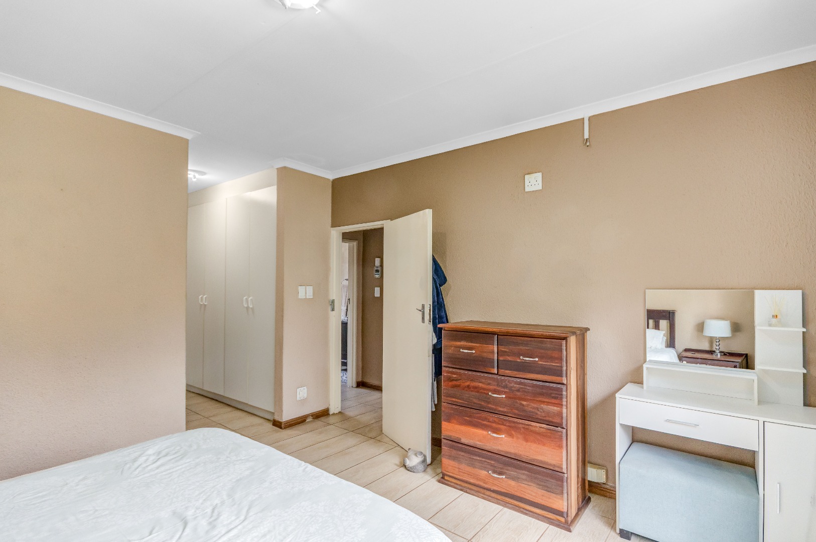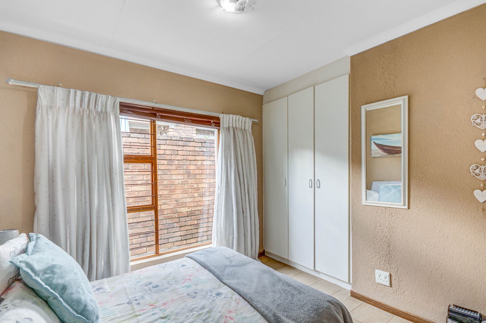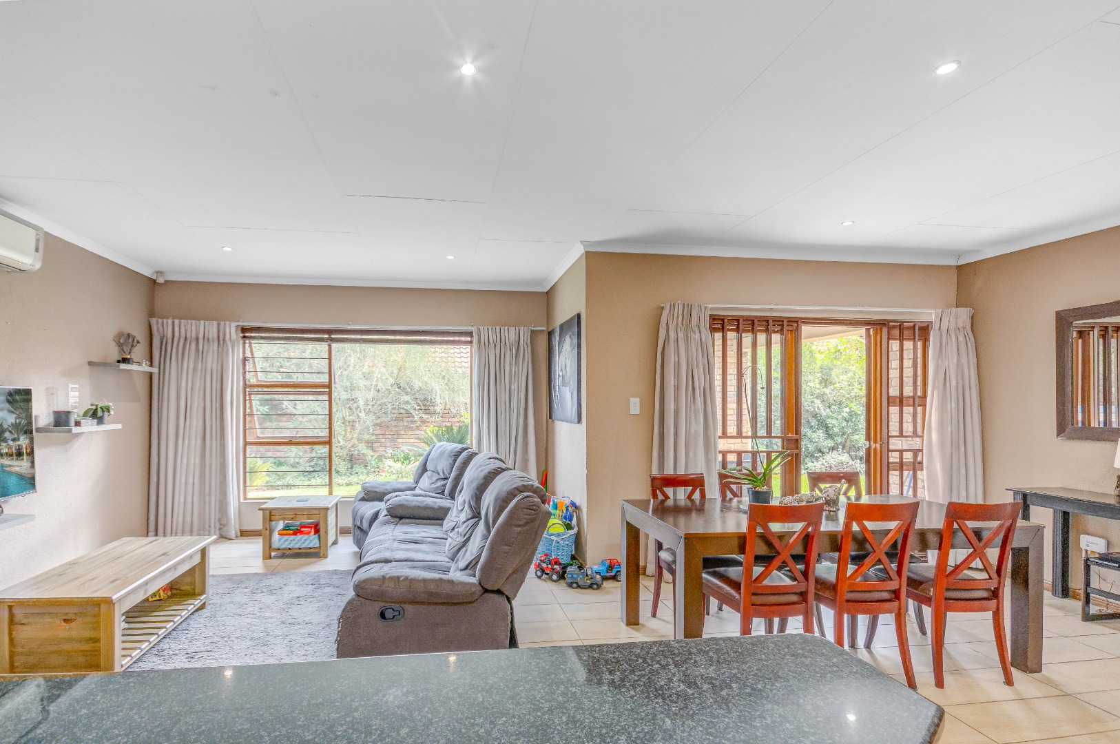 The property boasts three well-sized bedrooms, all with built-in cupboards and an abundance of natural light. The main bedroom is a private retreat, complete with air-conditioning and a full en-suite bathroom. The second bathroom is fitted with a shower, conveniently serving the remaining bedrooms.