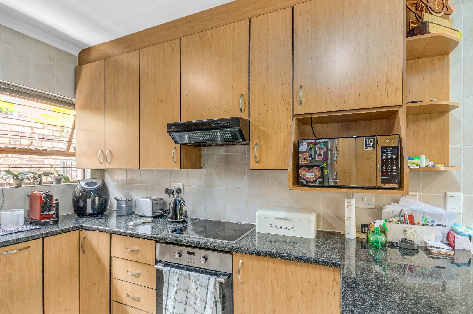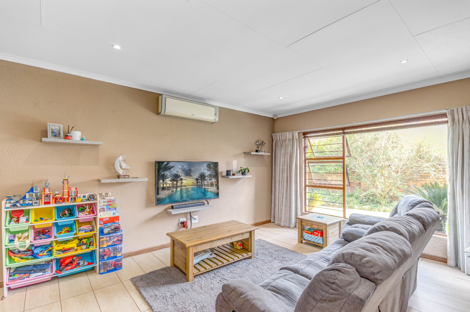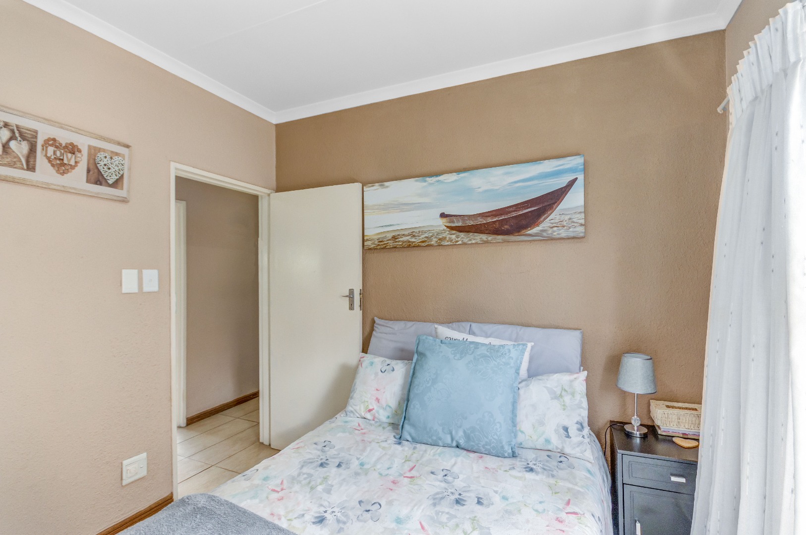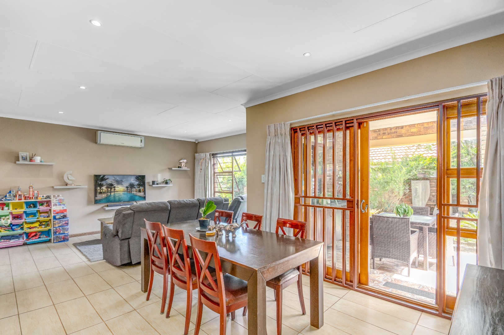 The property boasts three well-sized bedrooms, all with built-in cupboards and an abundance of natural light. The main bedroom is a private retreat, complete with air-conditioning and a full en-suite bathroom. The second bathroom is fitted with a shower, conveniently serving the remaining bedrooms.