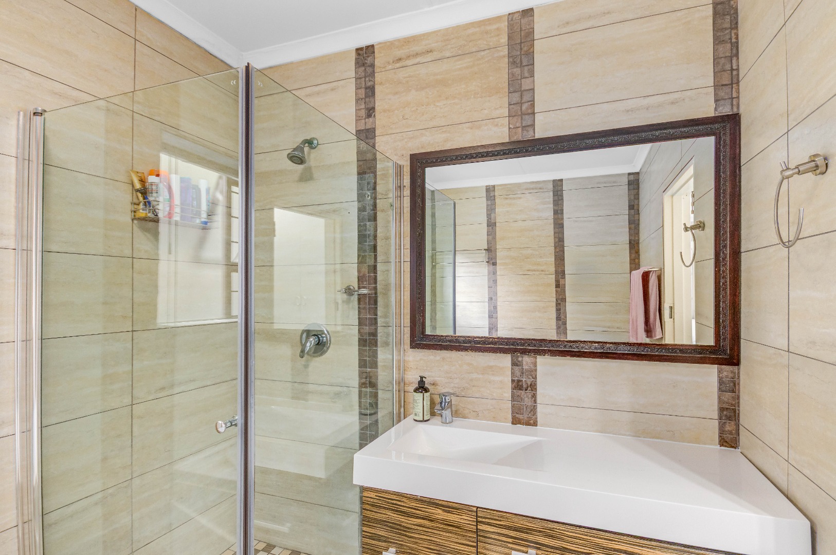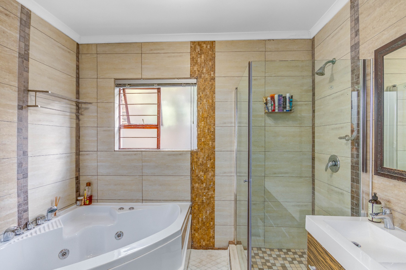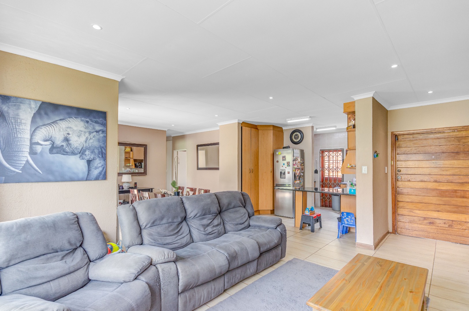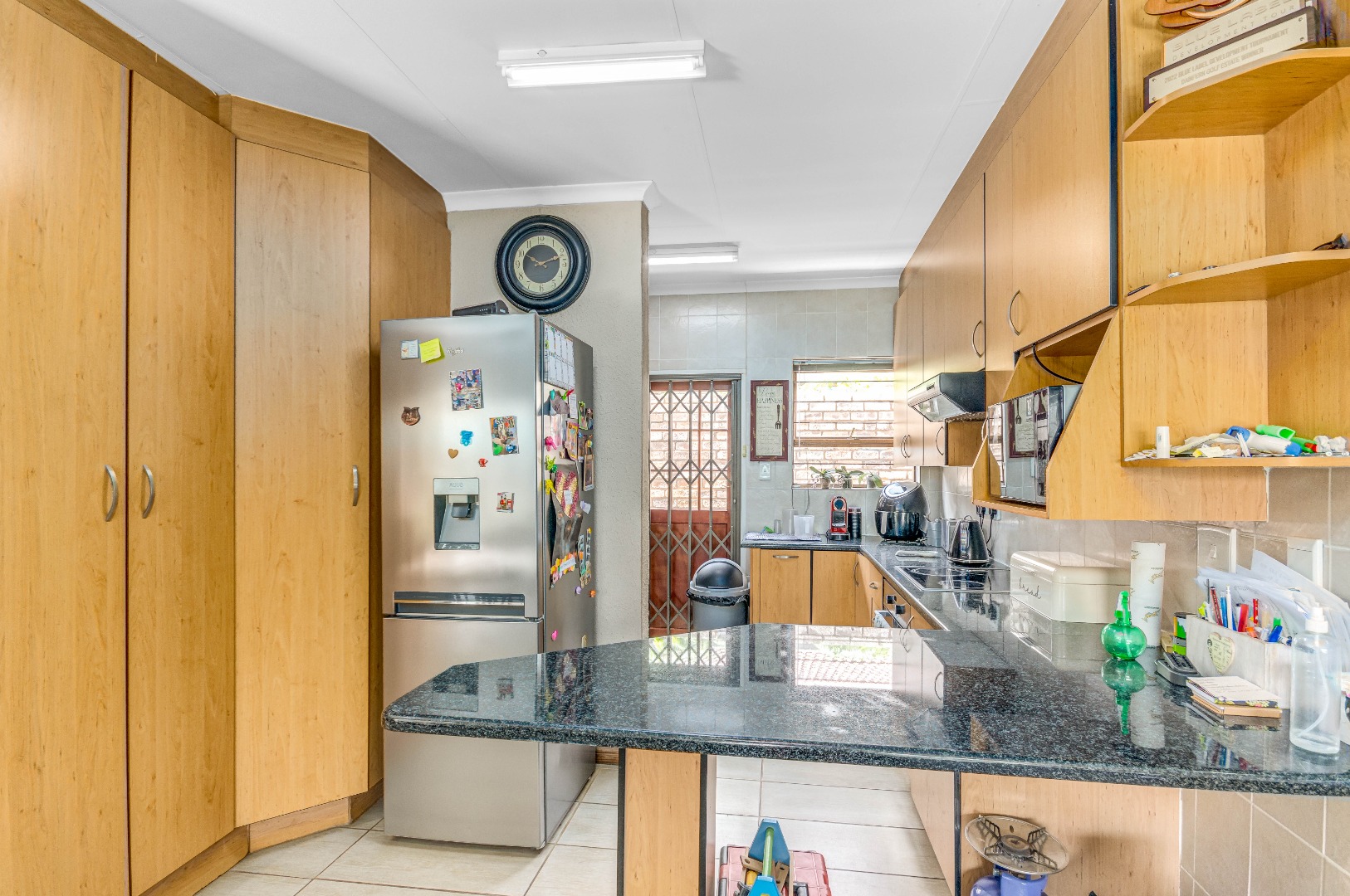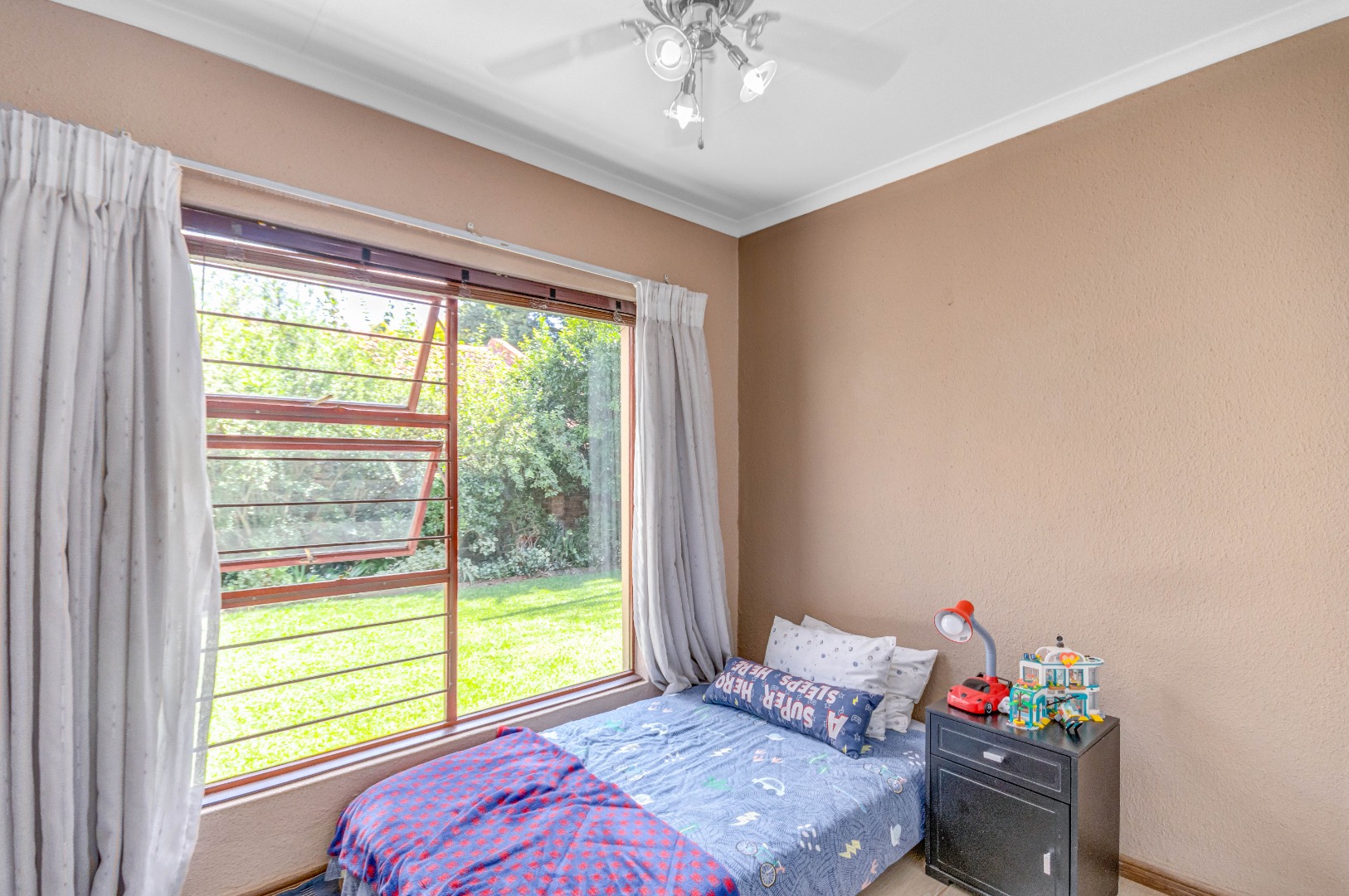 The property boasts three well-sized bedrooms, all with built-in cupboards and an abundance of natural light. The main bedroom is a private retreat, complete with air-conditioning and a full en-suite bathroom. The second bathroom is fitted with a shower, conveniently serving the remaining bedrooms.