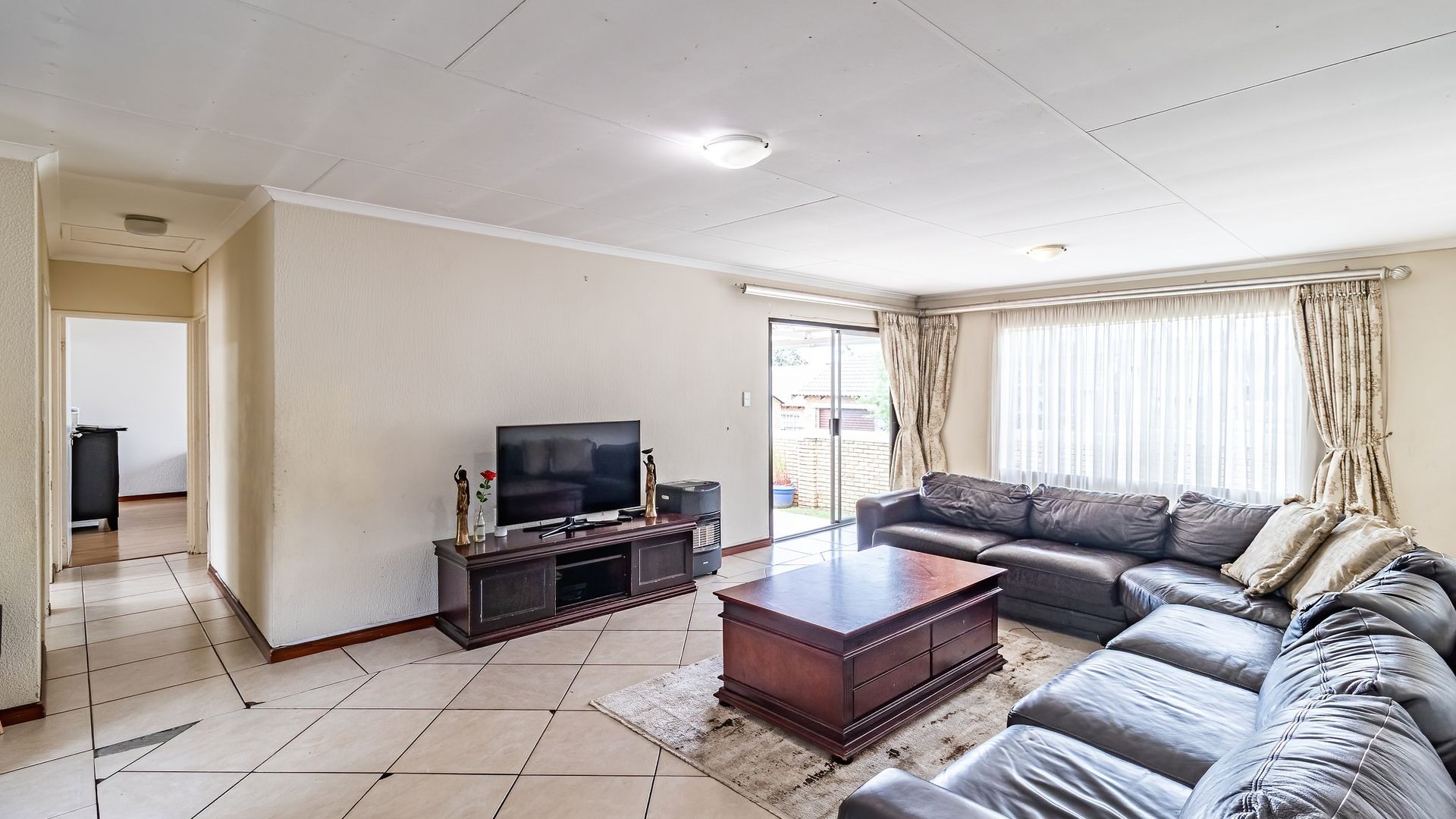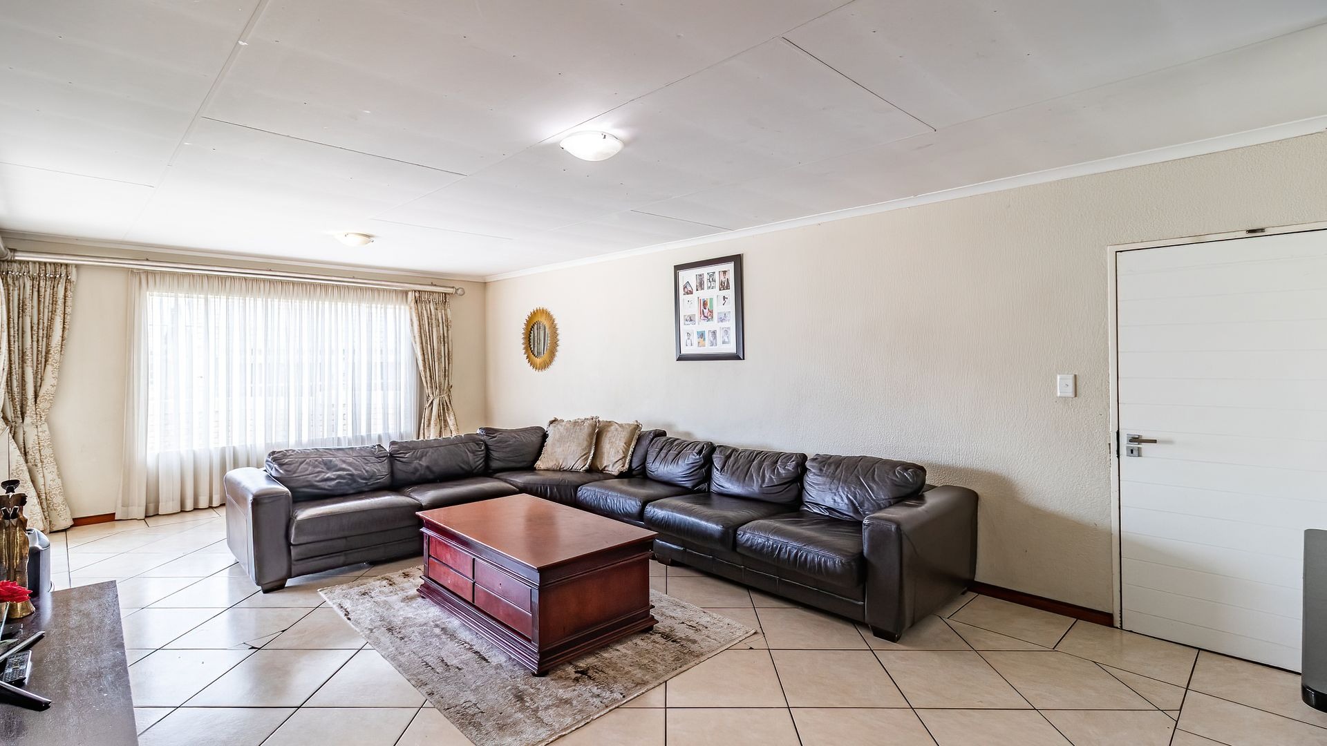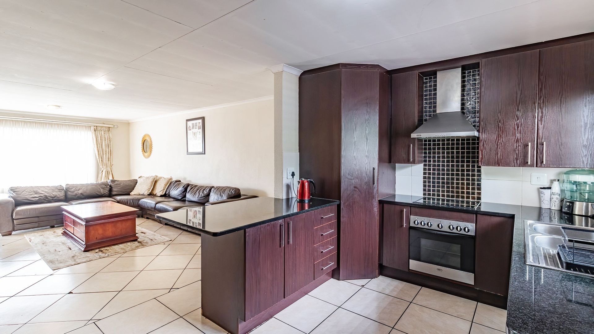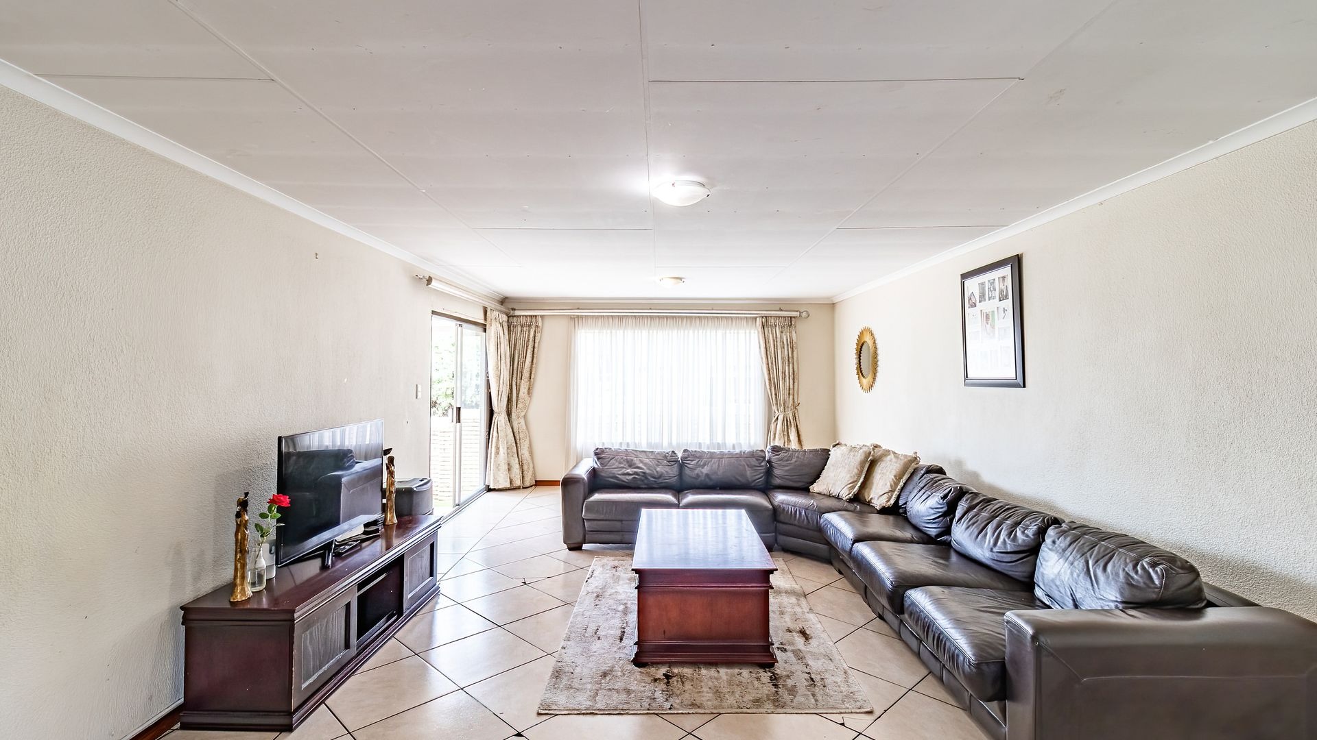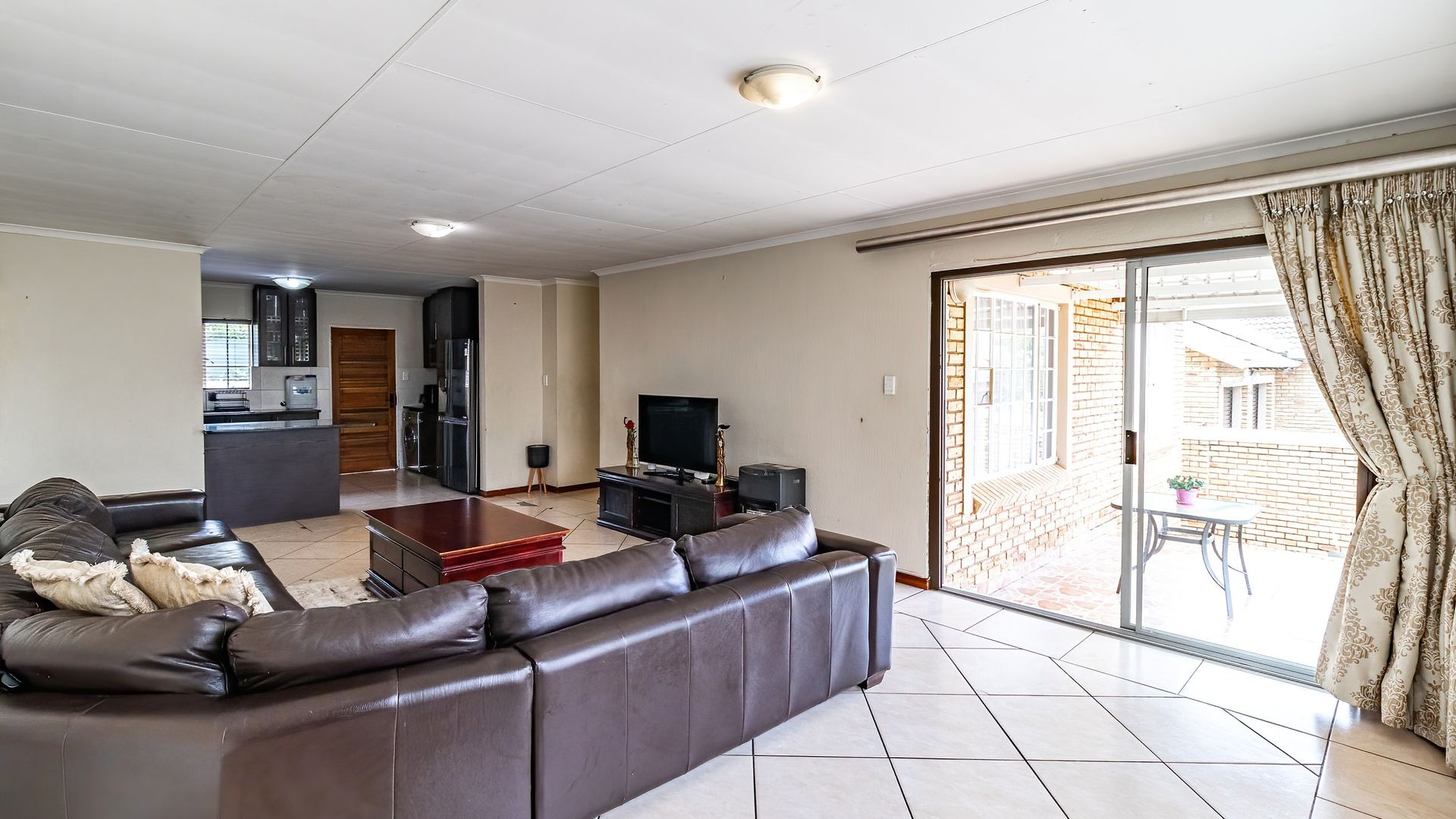 Upon entering the home, you are welcomed by a generous open-plan living area featuring a comfortable lounge and ample space for a 6-seater dining table, perfect for family living and entertaining.
