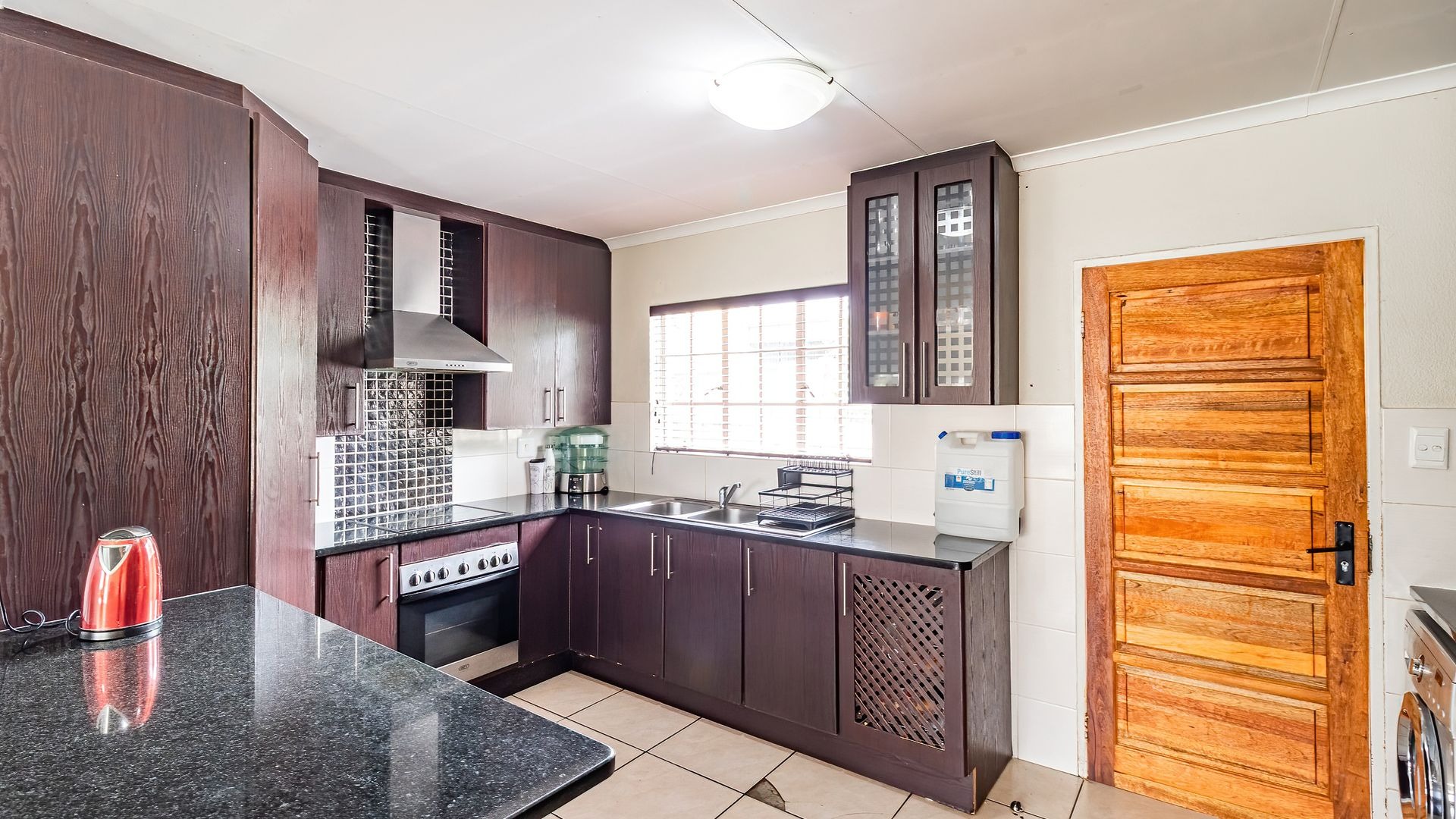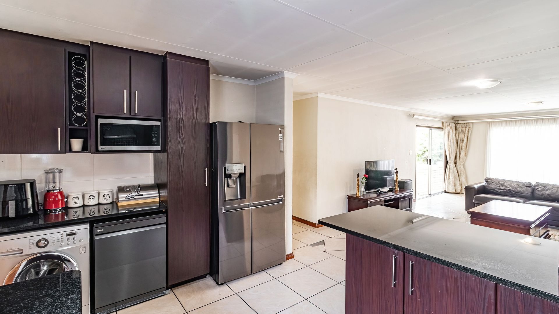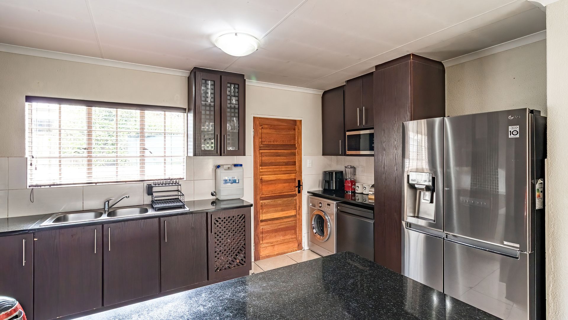 The large kitchen offers plenty of cupboard space, room for a double-door fridge, and space for three under-counter appliances, making it both practical and functional.