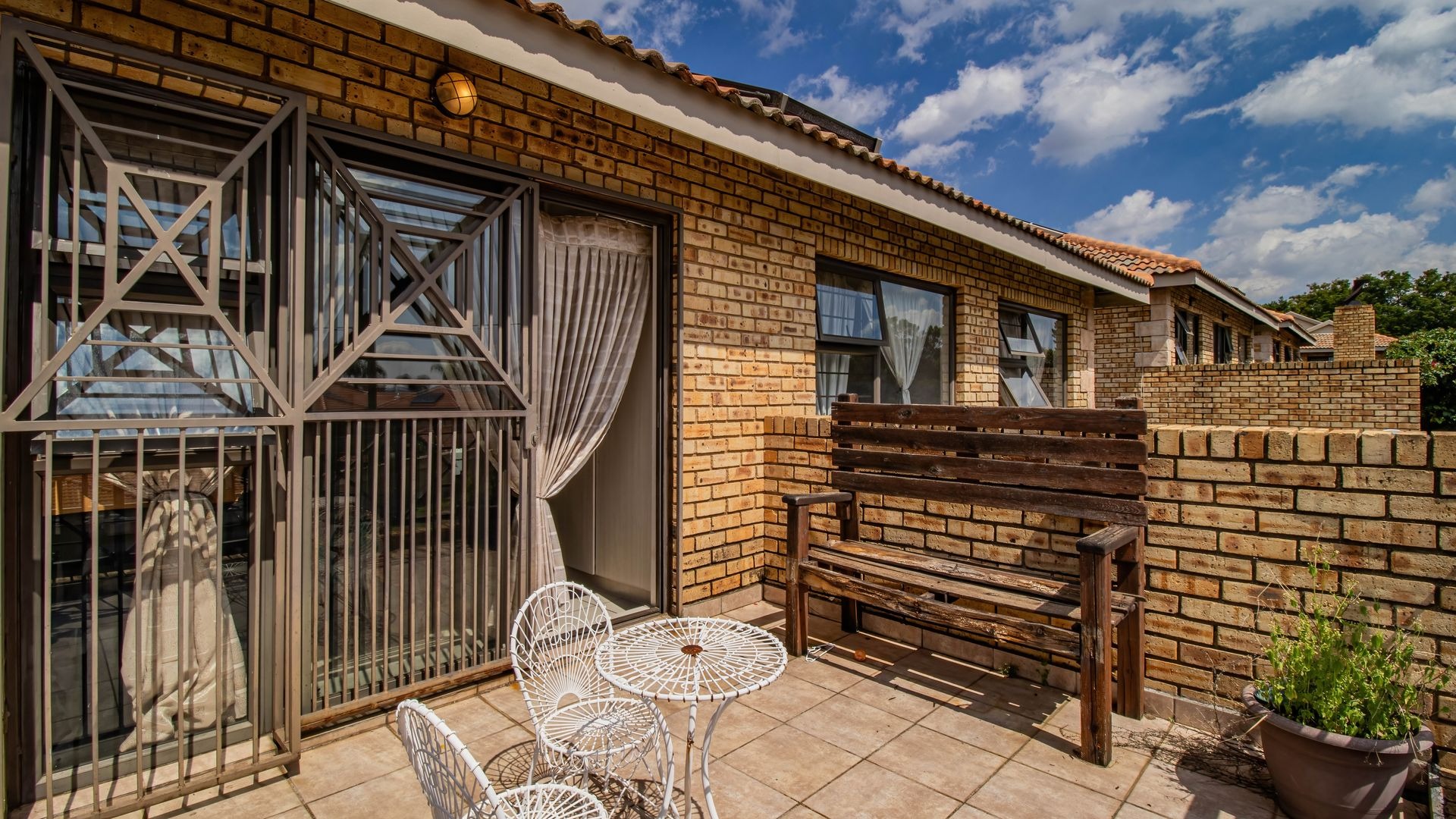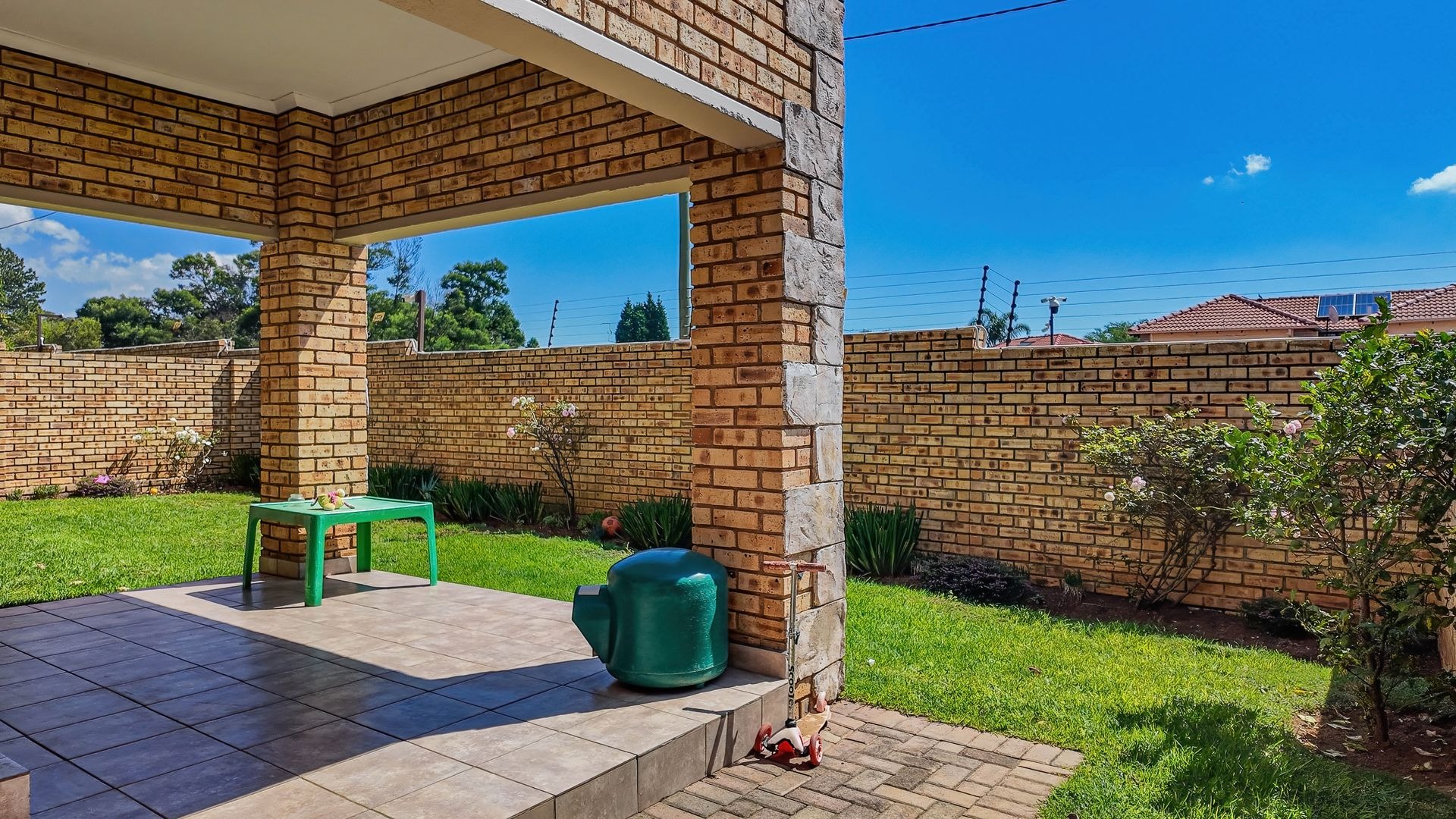 From the lounge, you step out onto a private patio overlooking a spacious garden, perfect for outdoor entertaining or enjoying quiet evenings.