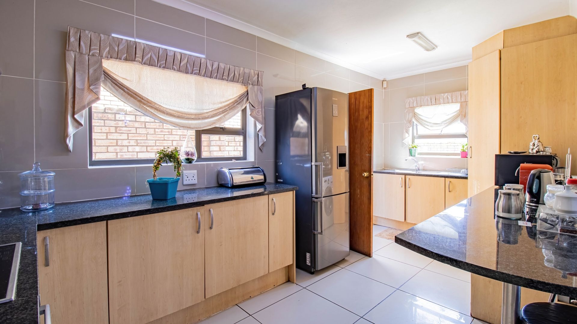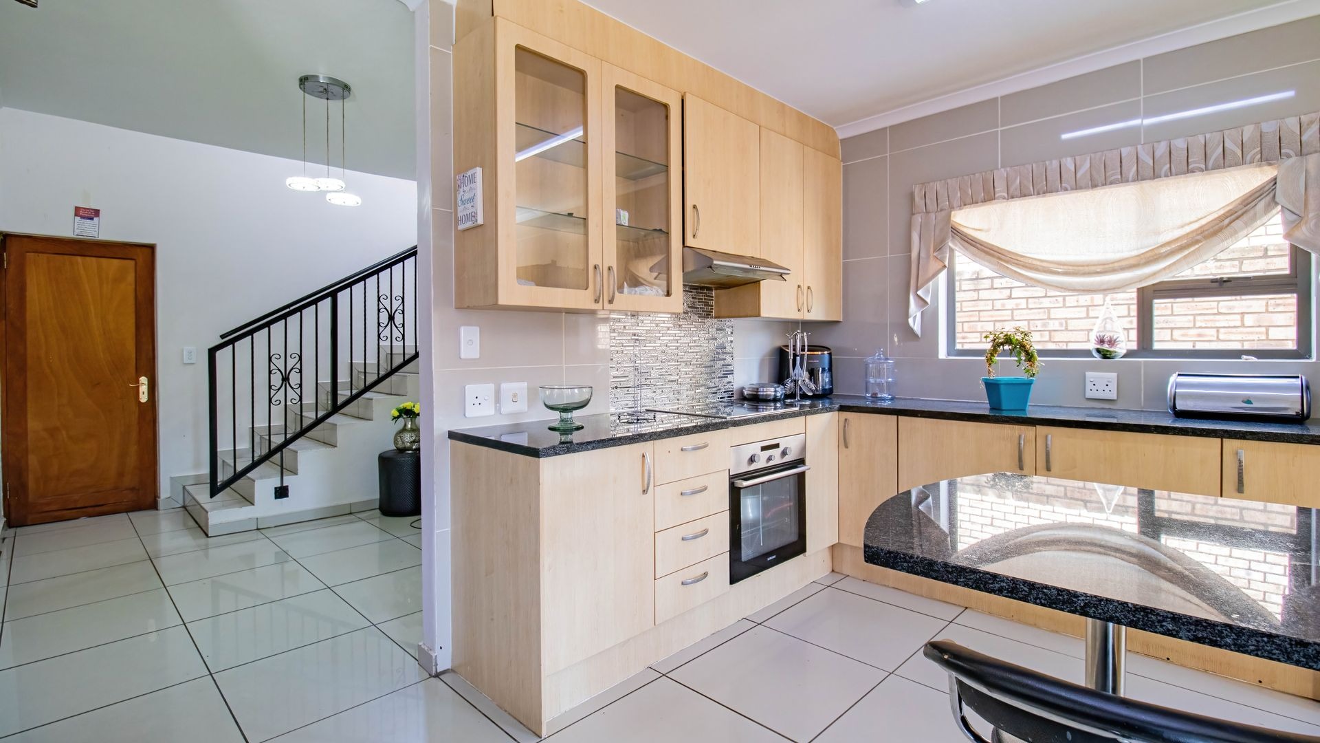 The kitchen is well-sized and functional, featuring granite countertops, space for three under-counter appliances, and a fridge, making it ideal for everyday living and entertaining. A guest toilet is conveniently located downstairs.