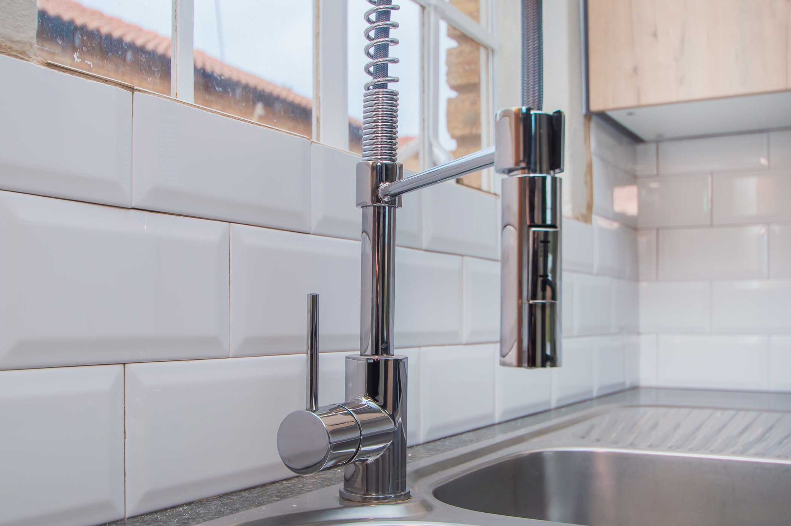 Step inside to an open-plan living and kitchen area, designed for modern comfort and seamless flow. The interior boasts neutral tiled flooring throughout, creating a clean and versatile canvas. The contemporary kitchen features stylish two-tone cabinetry, elegant granite countertops, and a crisp white subway tile backsplash, all illuminated by ample natural light. An accent wall adds a touch of character to the living space.
