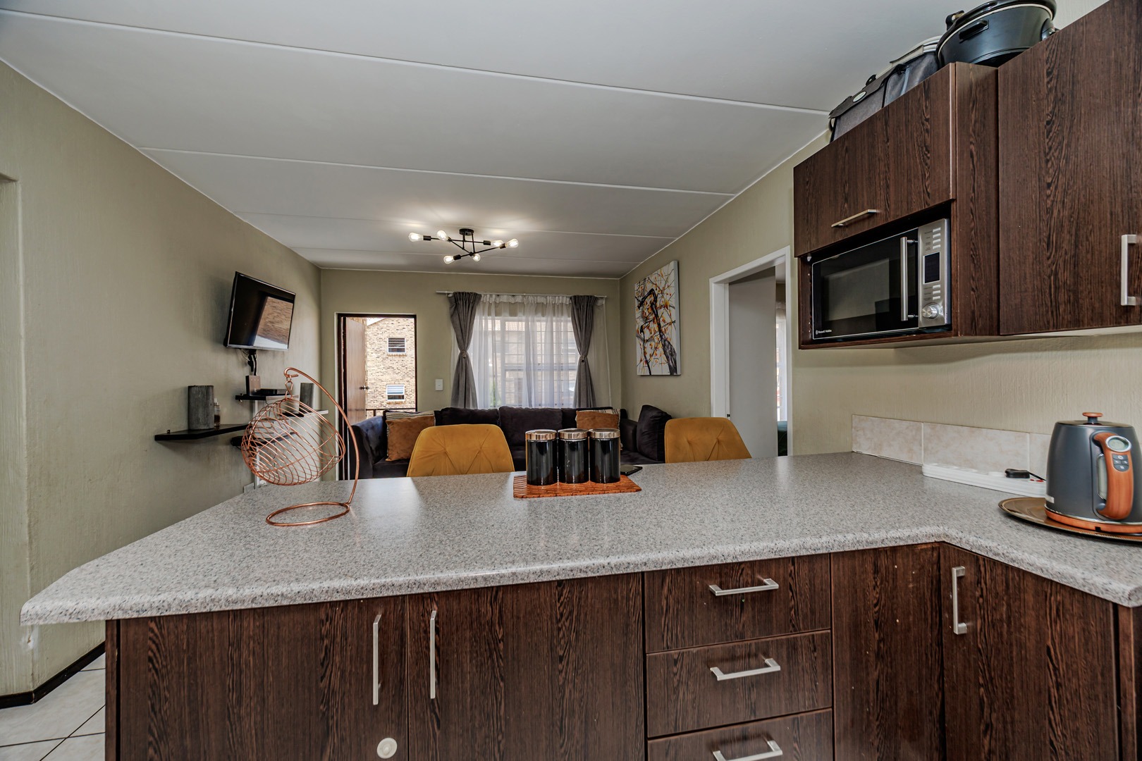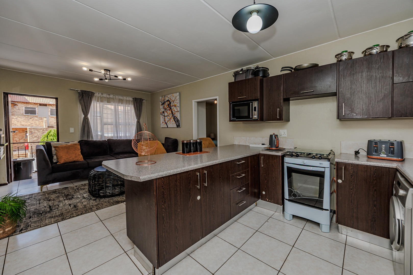 The kitchen is a real highlight with its modern dark wood-grain cabinets, speckled countertops, and a handy breakfast bar – plus, it comes with a built-in microwave and space for your washing machine and fridge. Tiled flooring throughout means easy cleaning and a fresh feel.