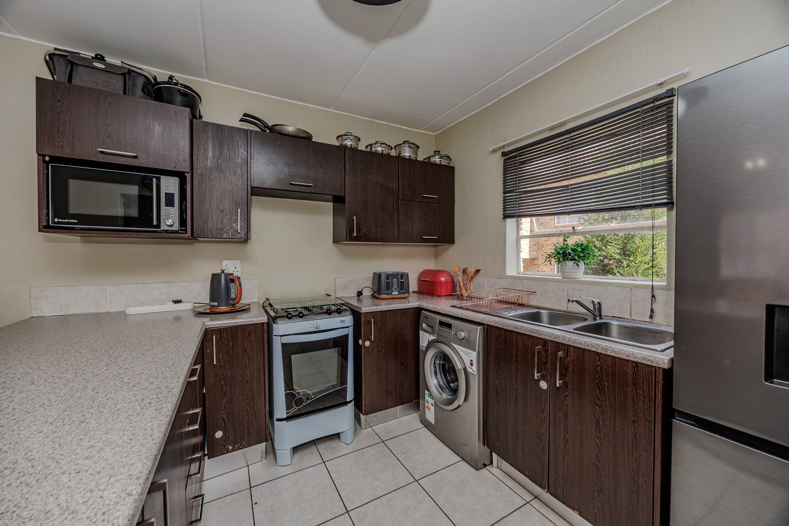 The kitchen is a real highlight with its modern dark wood-grain cabinets, speckled countertops, and a handy breakfast bar – plus, it comes with a built-in microwave and space for your washing machine and fridge. Tiled flooring throughout means easy cleaning and a fresh feel.