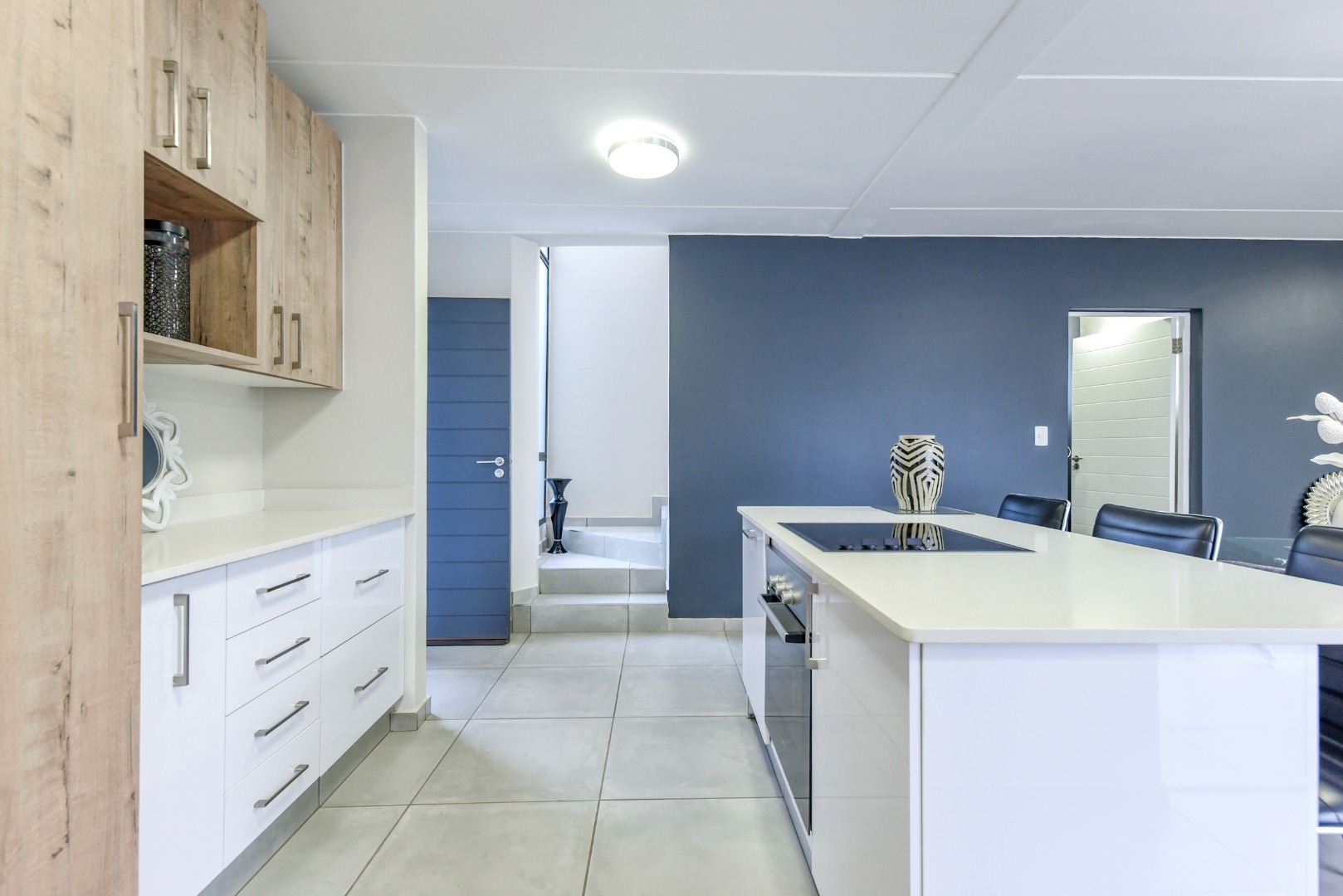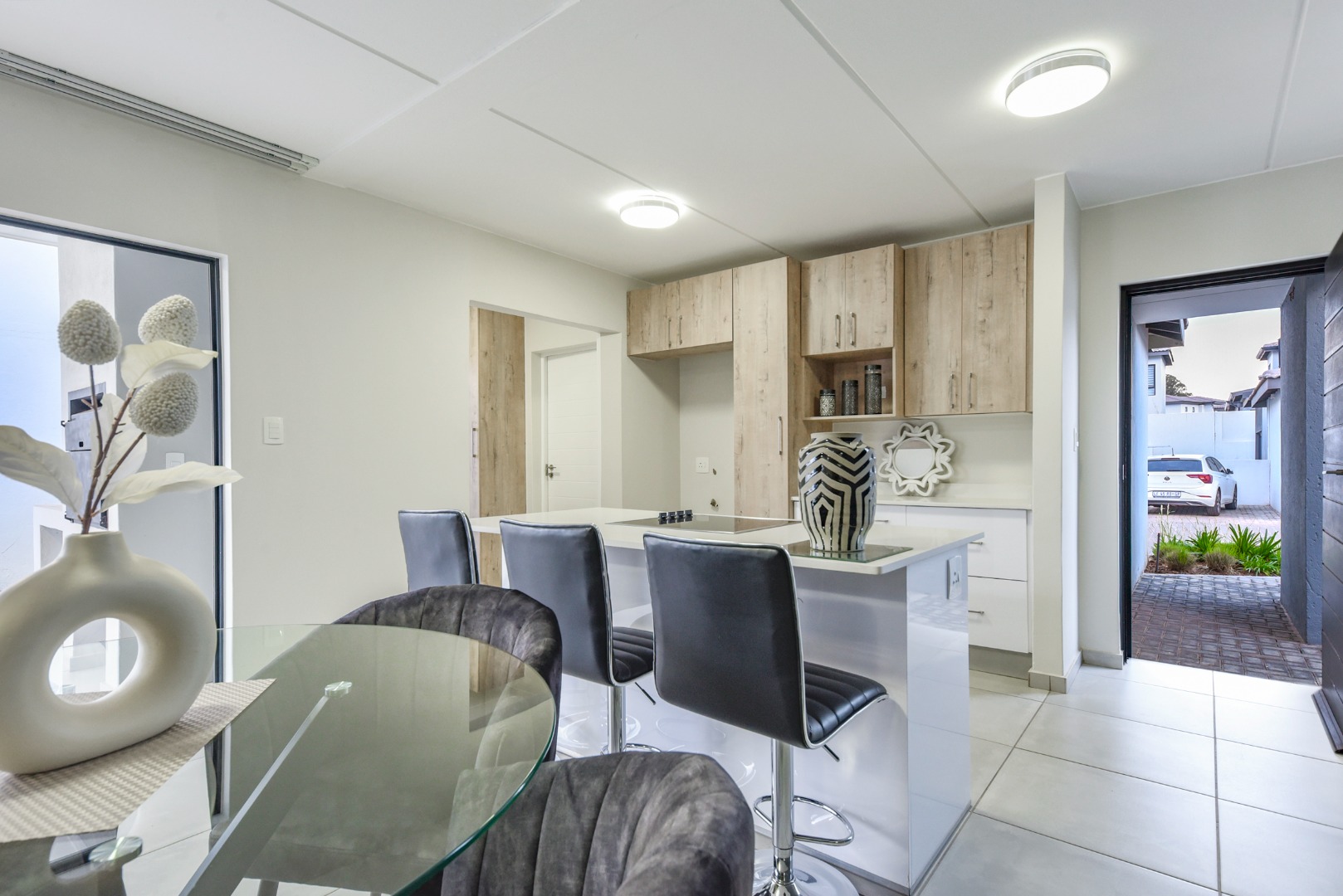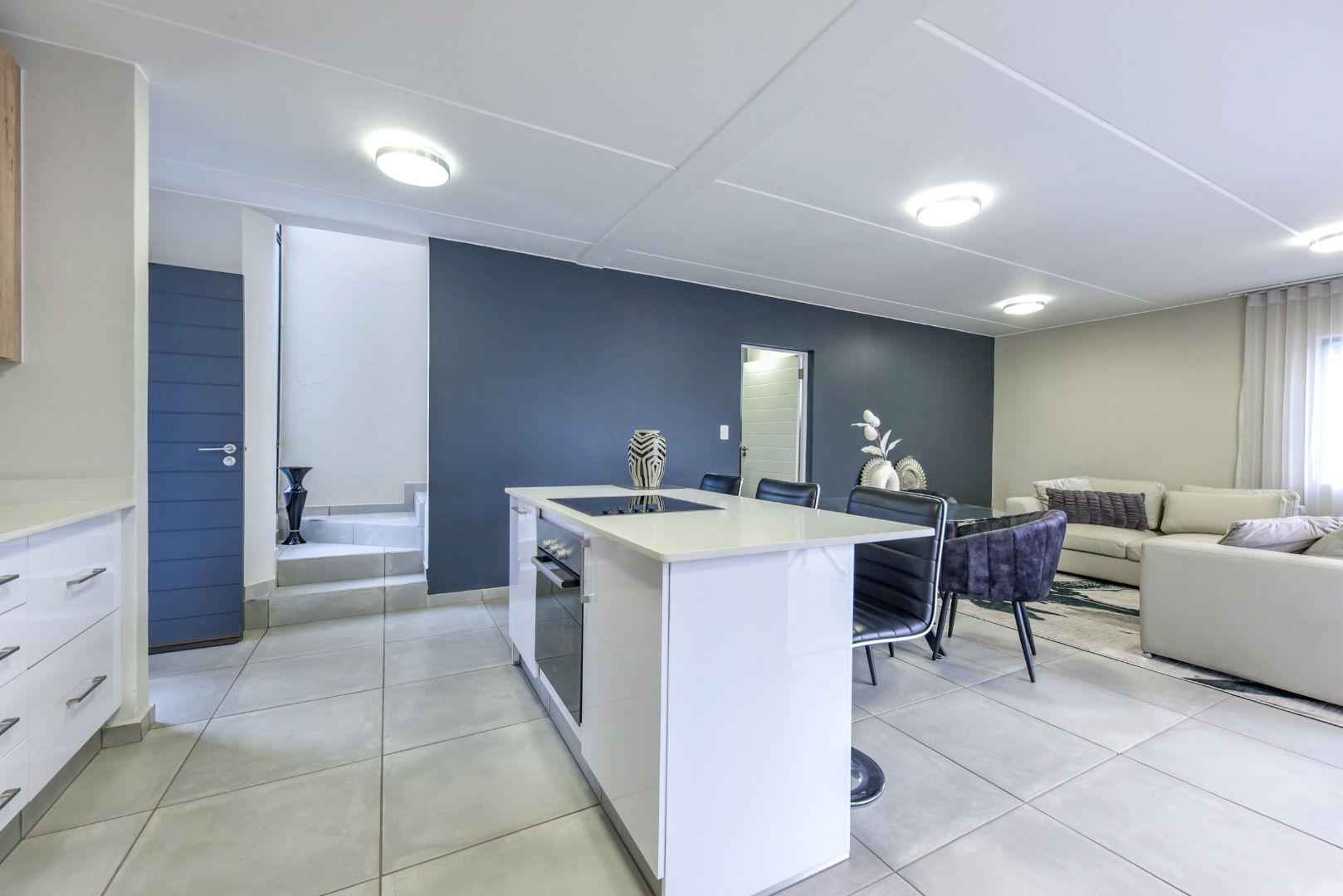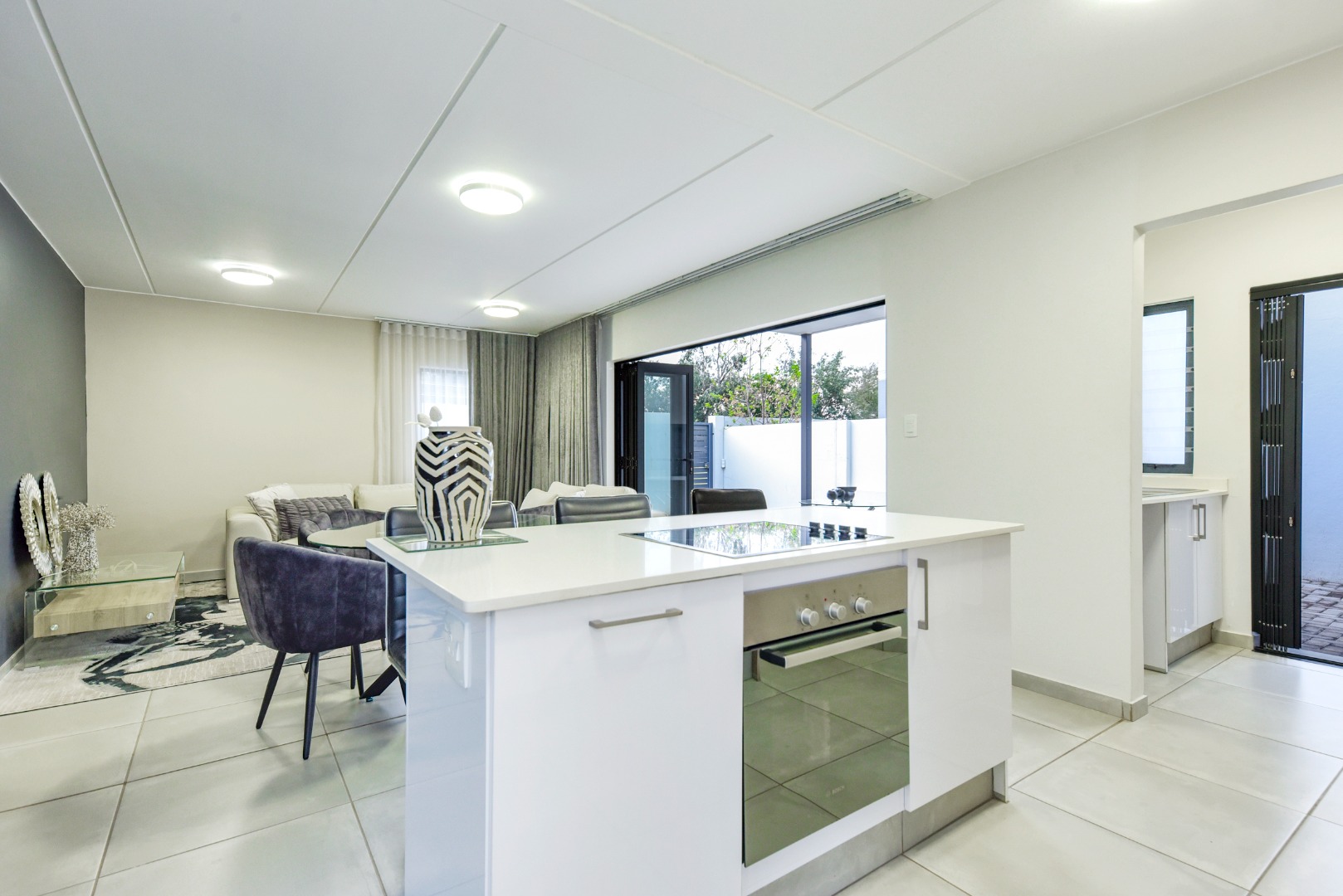 Step inside and experience seamless open-plan living, designed with effortless flow and modern flair. The designer kitchen features sleek two-tone cabinetry, white quartz countertops, a central island with built-in hob and oven, and a separate scullery. Direct access from the double garage adds convenience, while a downstairs guest bathroom enhances practicality.