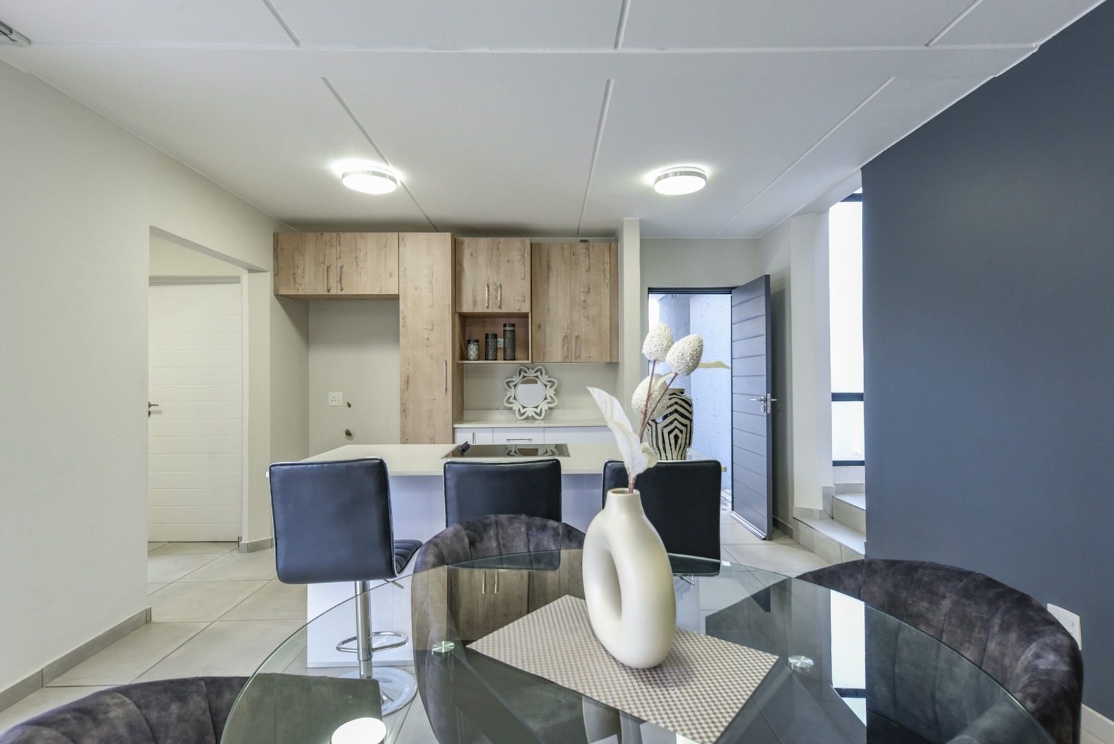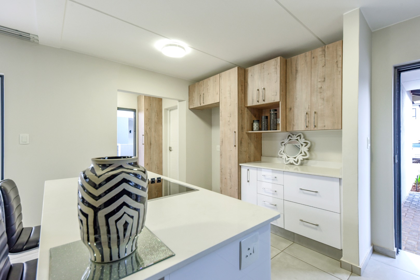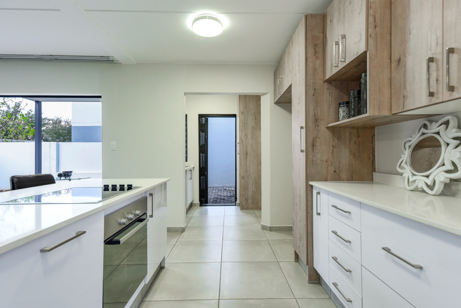 Step inside and experience seamless open-plan living, designed with effortless flow and modern flair. The designer kitchen features sleek two-tone cabinetry, white quartz countertops, a central island with built-in hob and oven, and a separate scullery. Direct access from the double garage adds convenience, while a downstairs guest bathroom enhances practicality.
