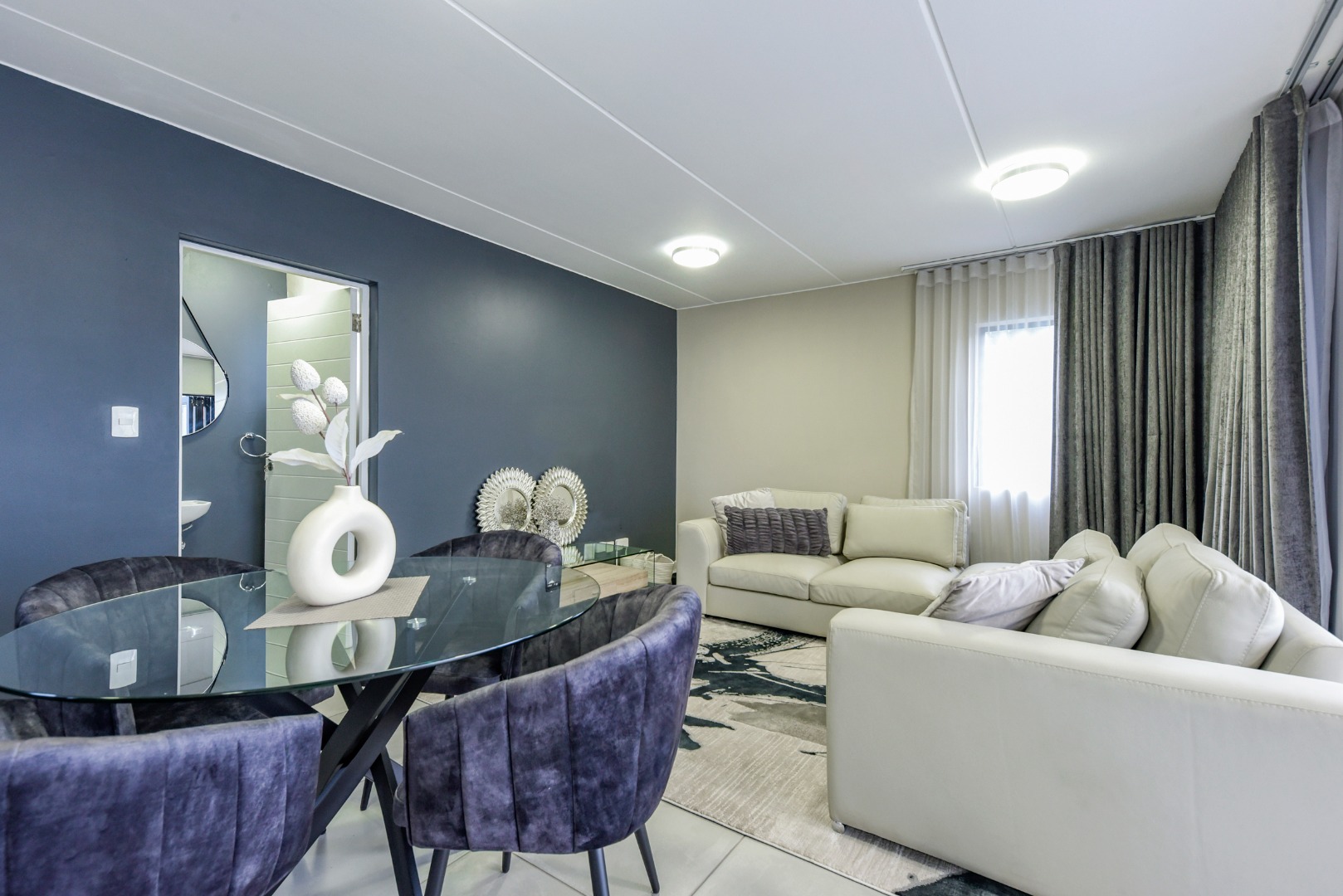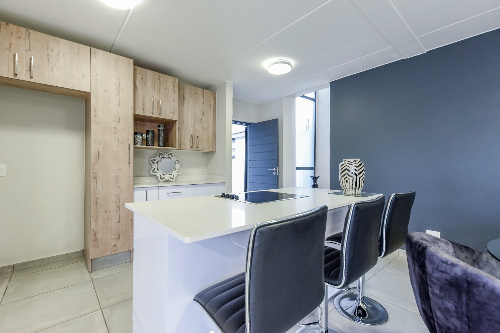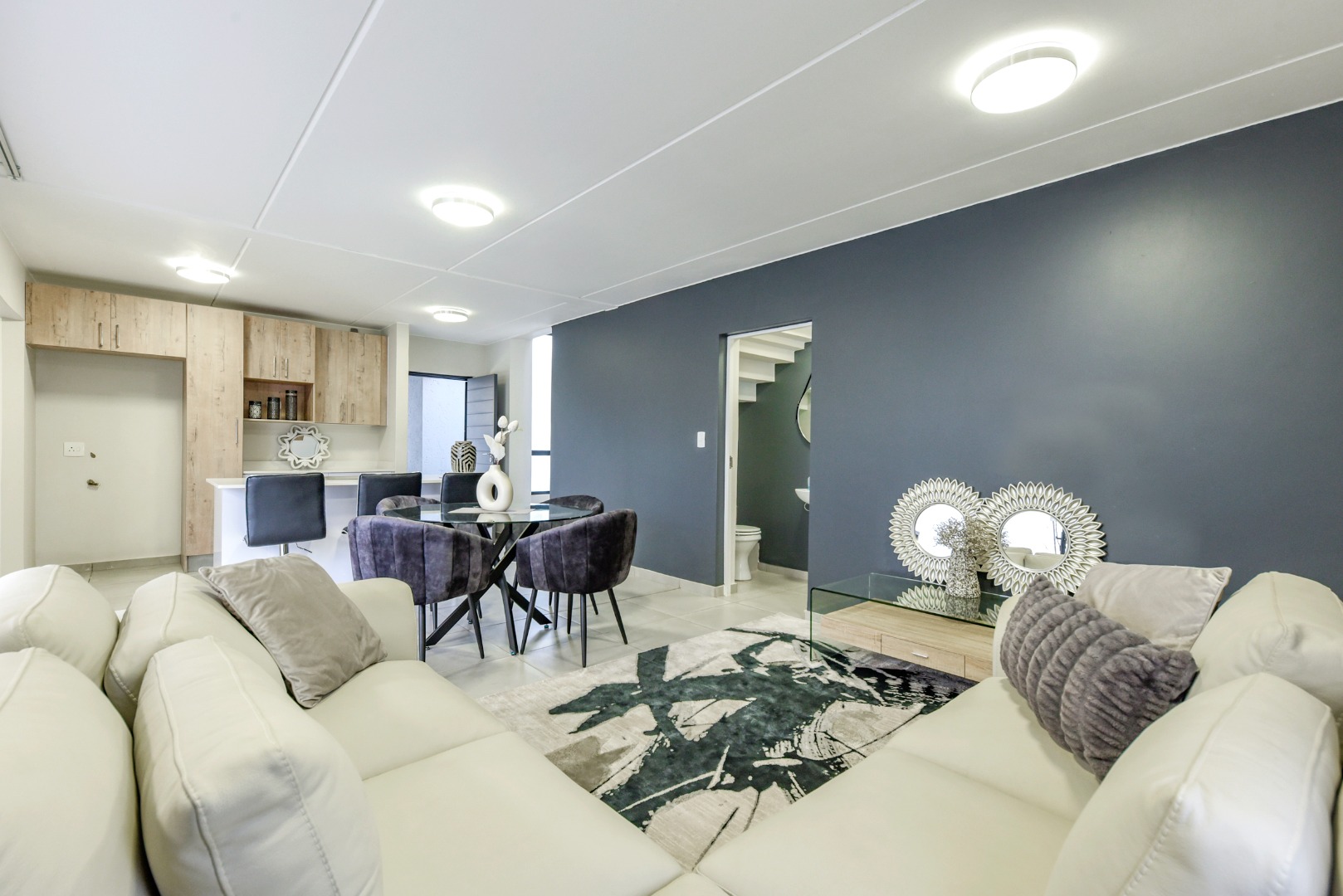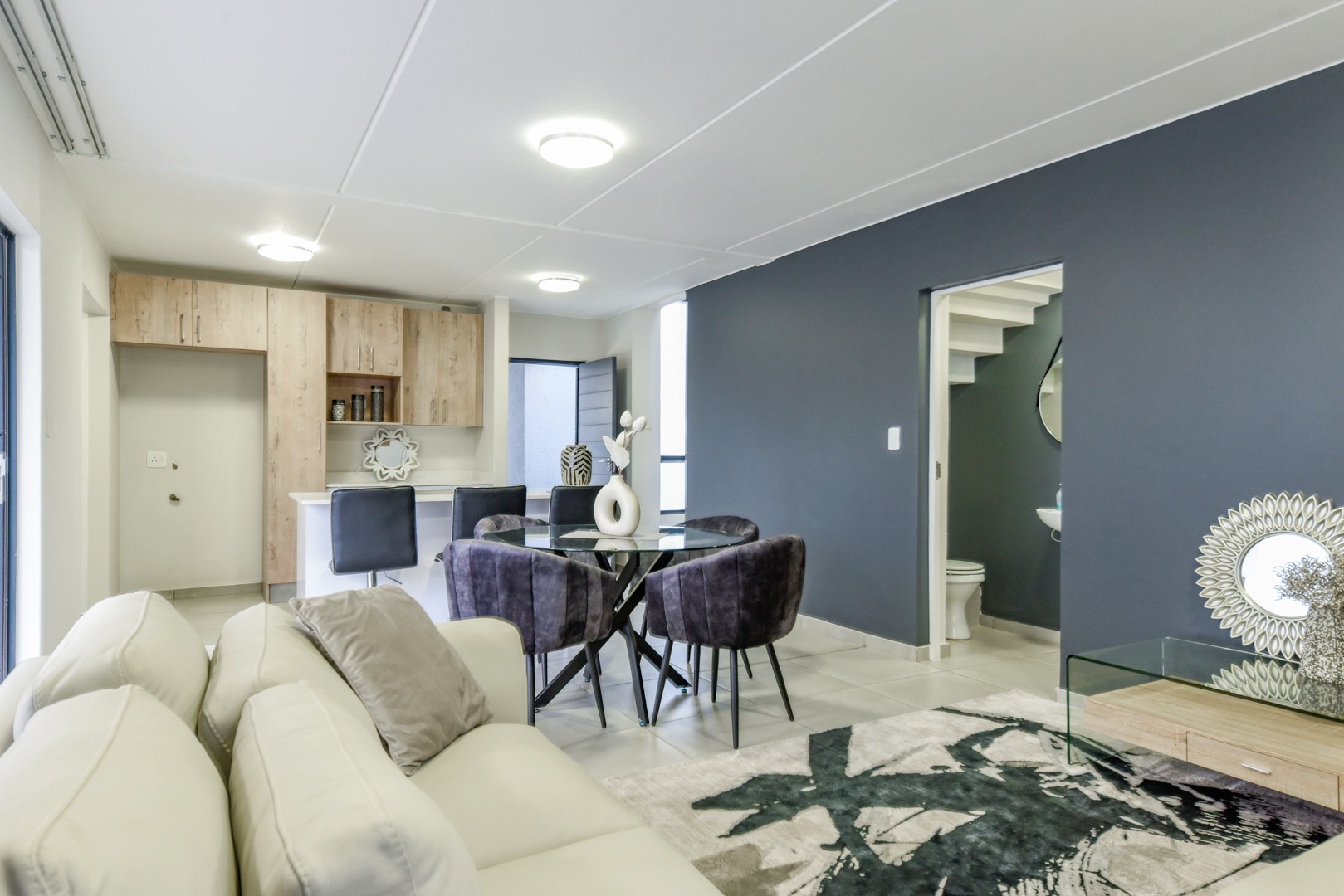 Step inside and experience seamless open-plan living, designed with effortless flow and modern flair. The designer kitchen features sleek two-tone cabinetry, white quartz countertops, a central island with built-in hob and oven, and a separate scullery. Direct access from the double garage adds convenience, while a downstairs guest bathroom enhances practicality.