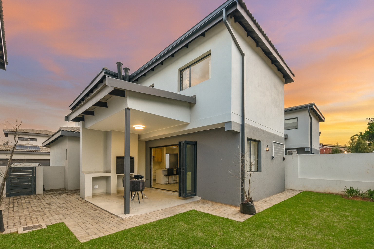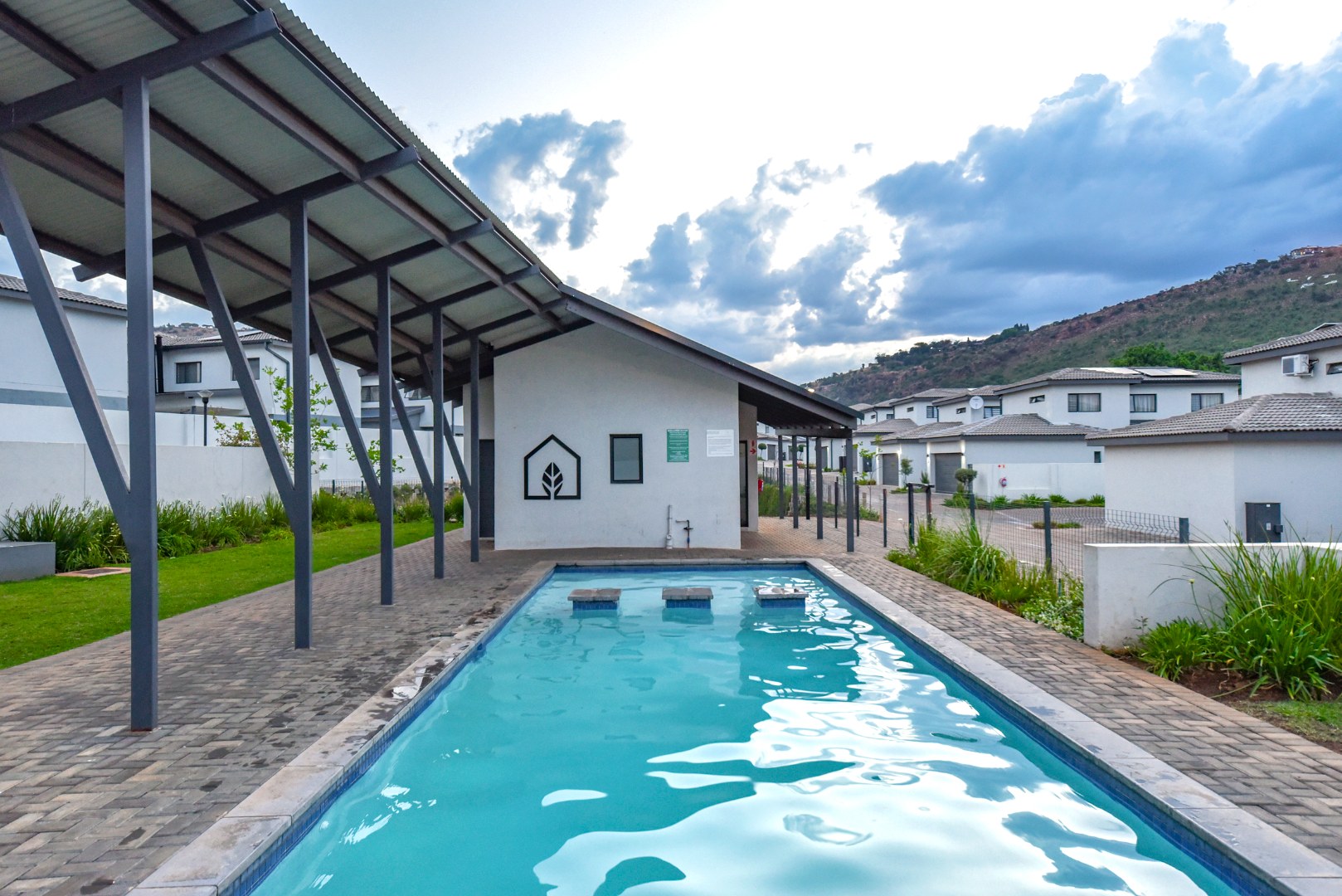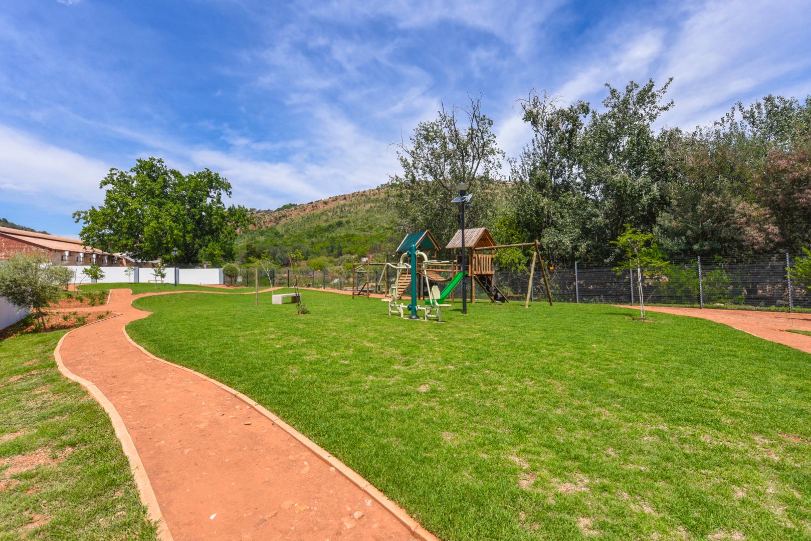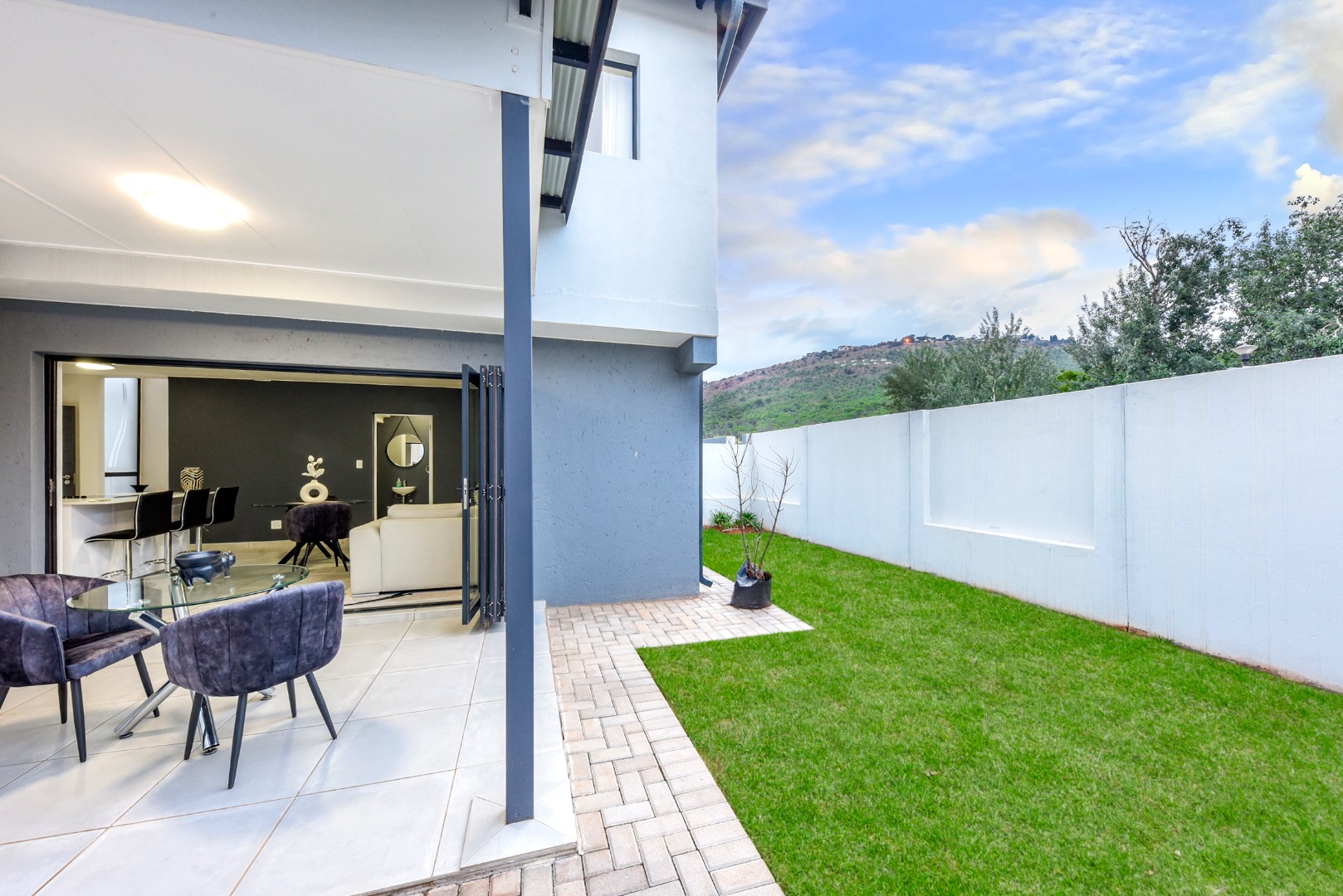 The lounge exudes sophistication with automatic curtain rails, adding a modern touch to the space. Large glass doors open to a covered patio with built-in braai — perfect for everyday dining or relaxed Sunday lunches with family and friends. The home is ideally located on the border of the park, allowing little ones to play safely and freely, while beautiful mountain views create a tranquil backdrop right at your doorstep.