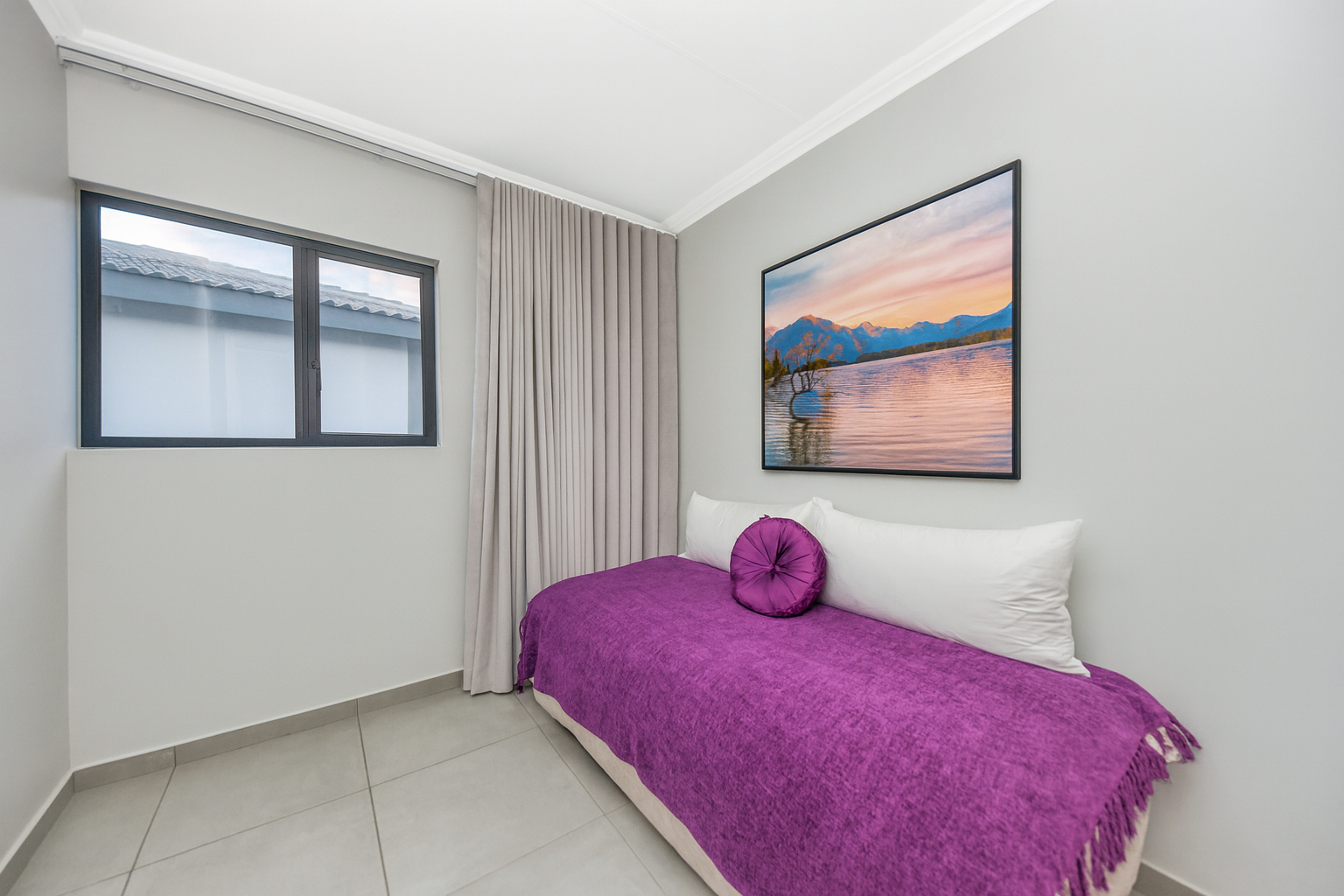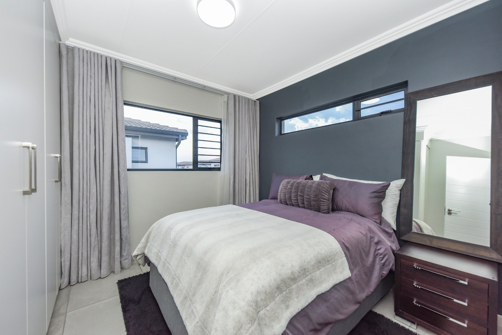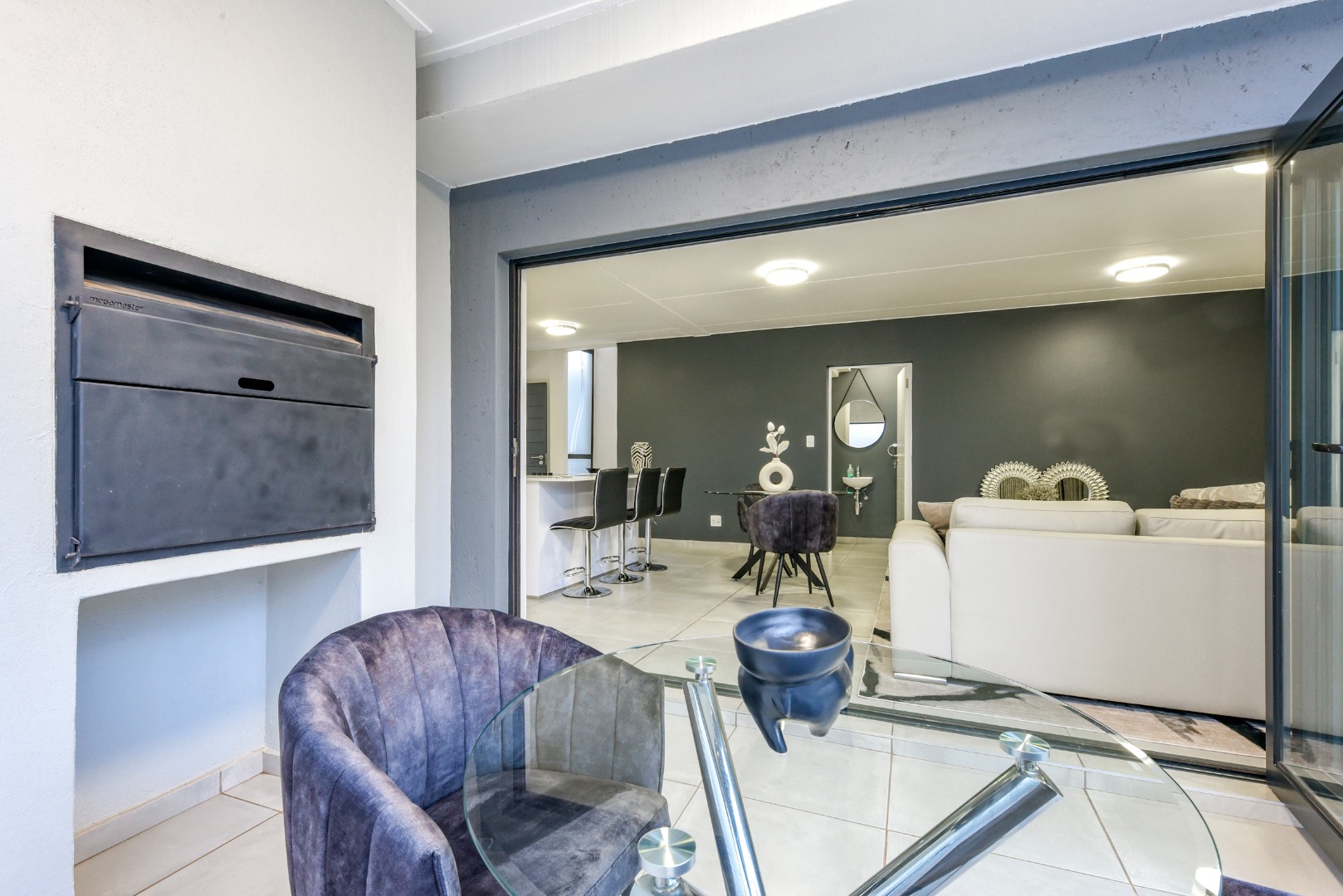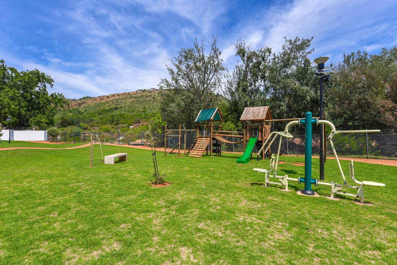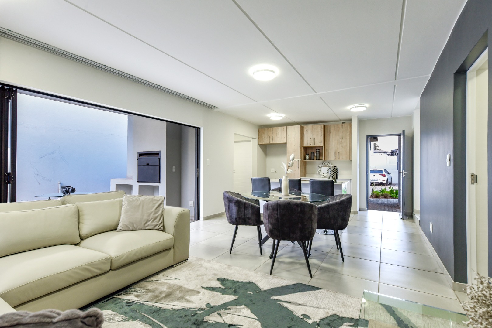 The lounge exudes sophistication with automatic curtain rails, adding a modern touch to the space. Large glass doors open to a covered patio with built-in braai — perfect for everyday dining or relaxed Sunday lunches with family and friends. The home is ideally located on the border of the park, allowing little ones to play safely and freely, while beautiful mountain views create a tranquil backdrop right at your doorstep.