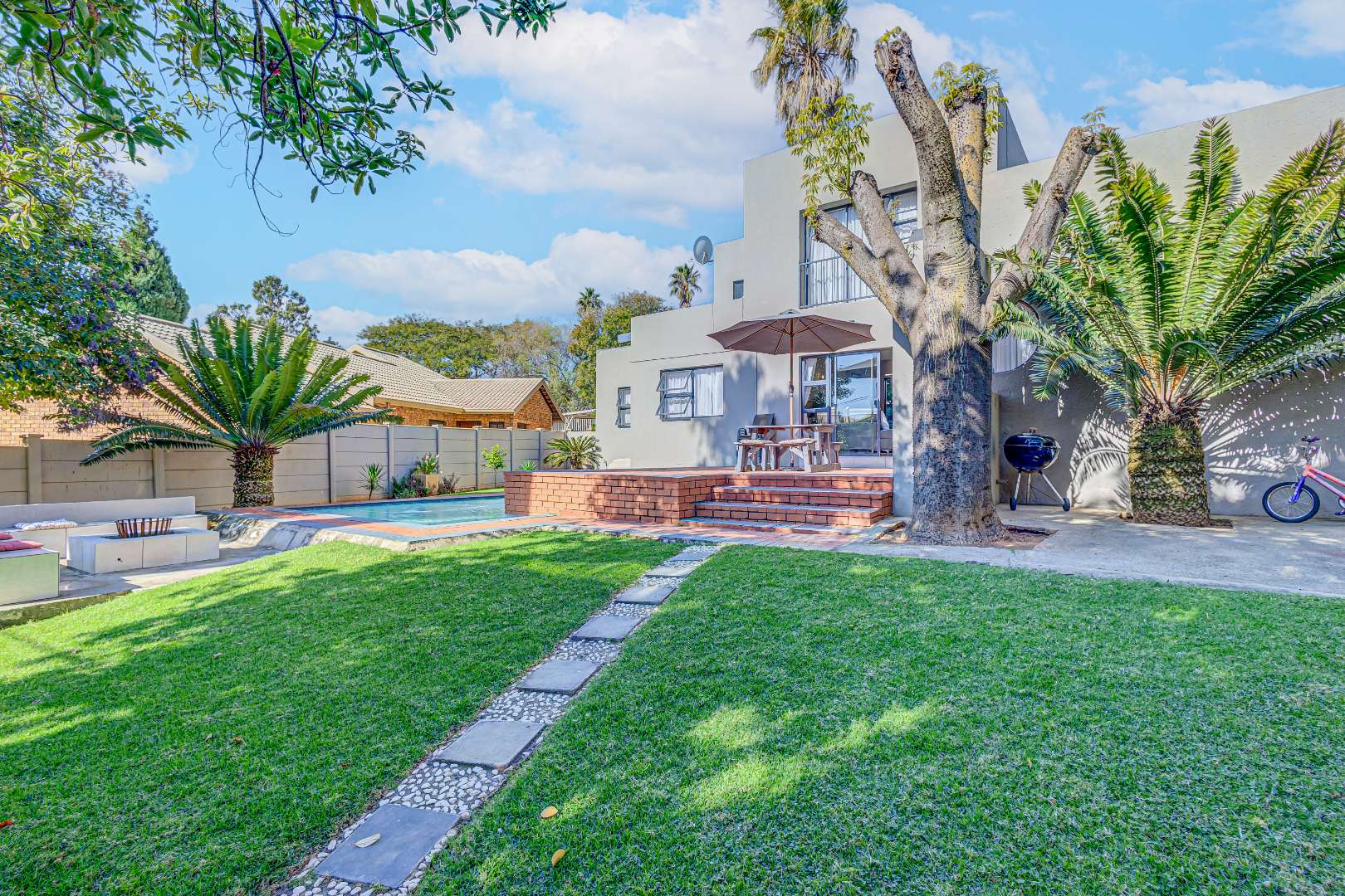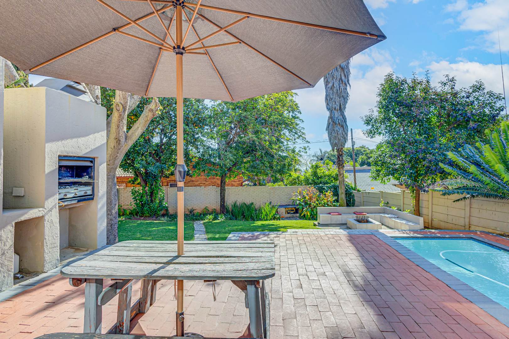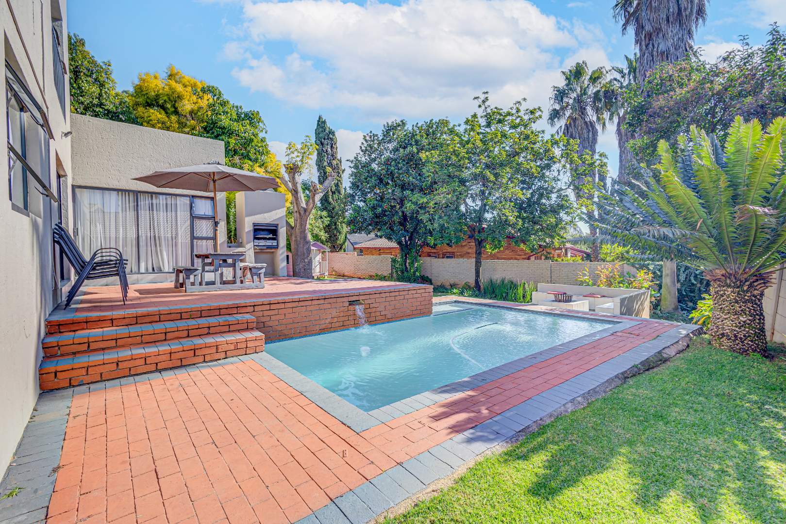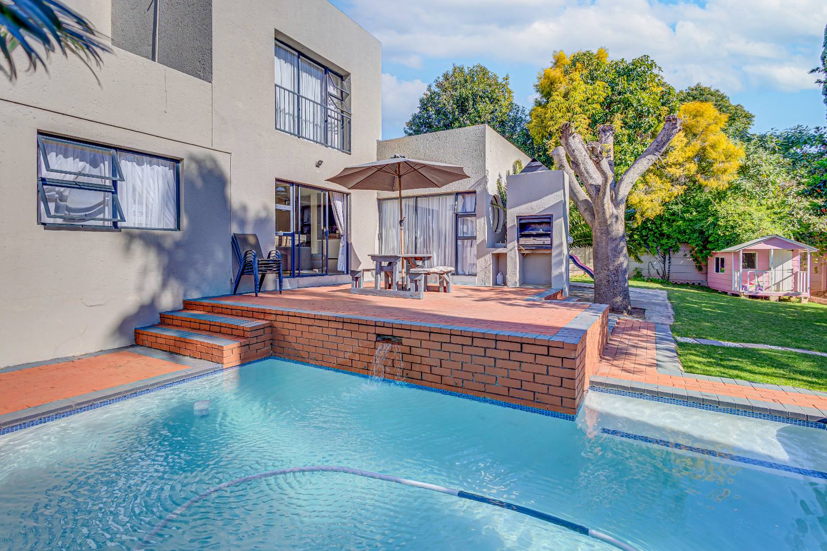 The home features two living spaces , one of which is bright and airy TV lounge that opens out onto a beautifully finished open patio — perfect for hosting friends and family. The built-in braai area overlooks a sparkling swimming pool, framed by a lush, wrap-around garden that offers privacy, space for kids to play, and a peaceful atmosphere.
