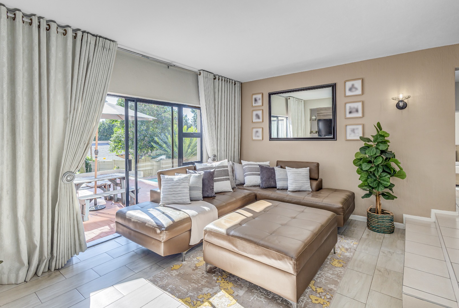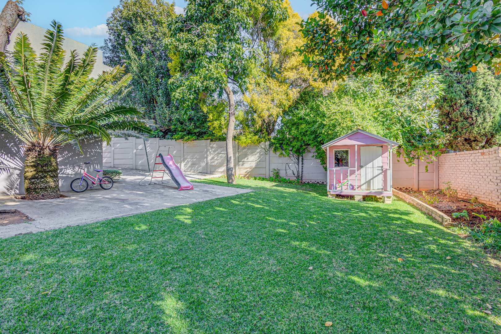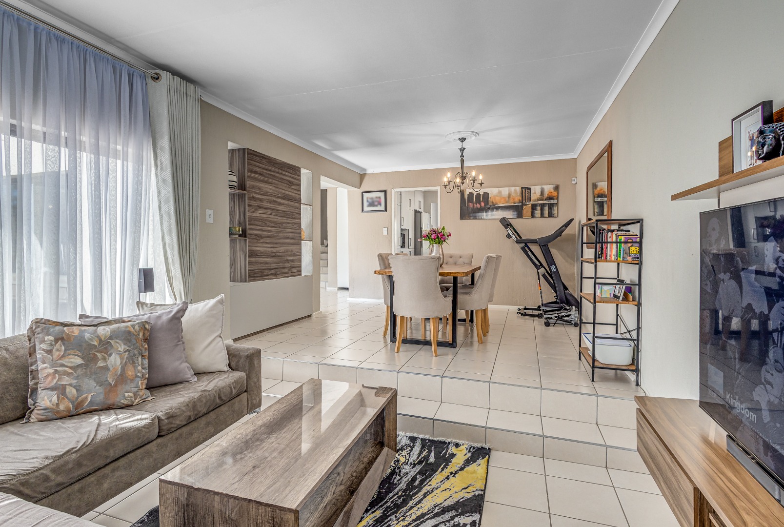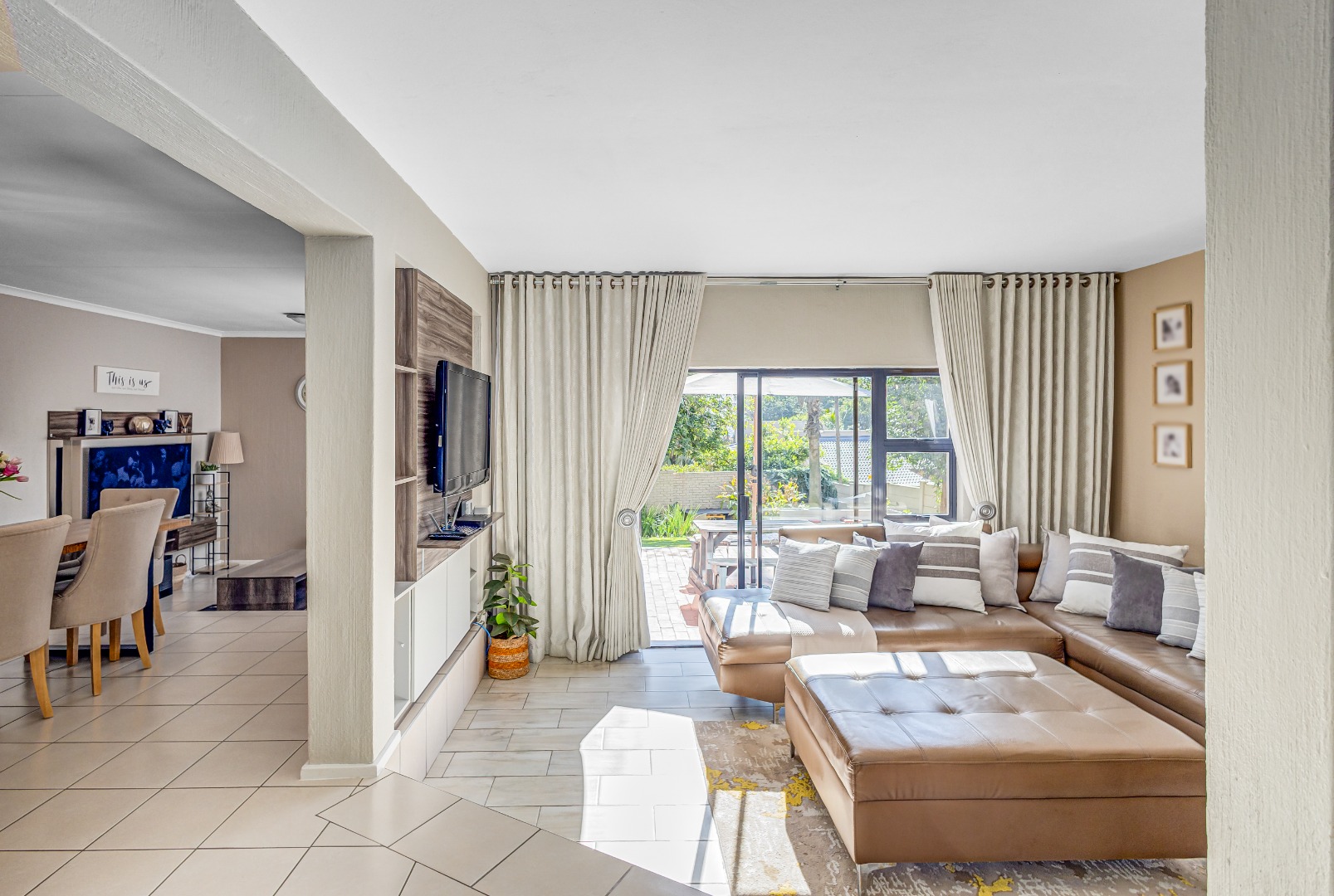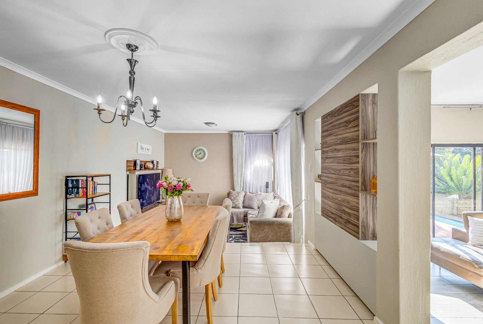 The home features two living spaces , one of which is bright and airy TV lounge that opens out onto a beautifully finished open patio — perfect for hosting friends and family. The built-in braai area overlooks a sparkling swimming pool, framed by a lush, wrap-around garden that offers privacy, space for kids to play, and a peaceful atmosphere.