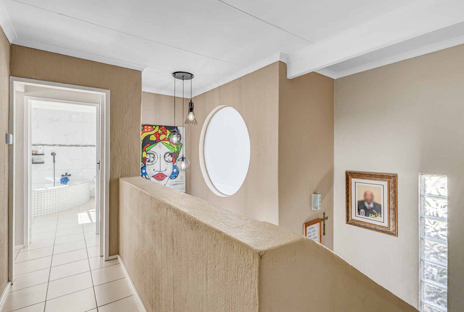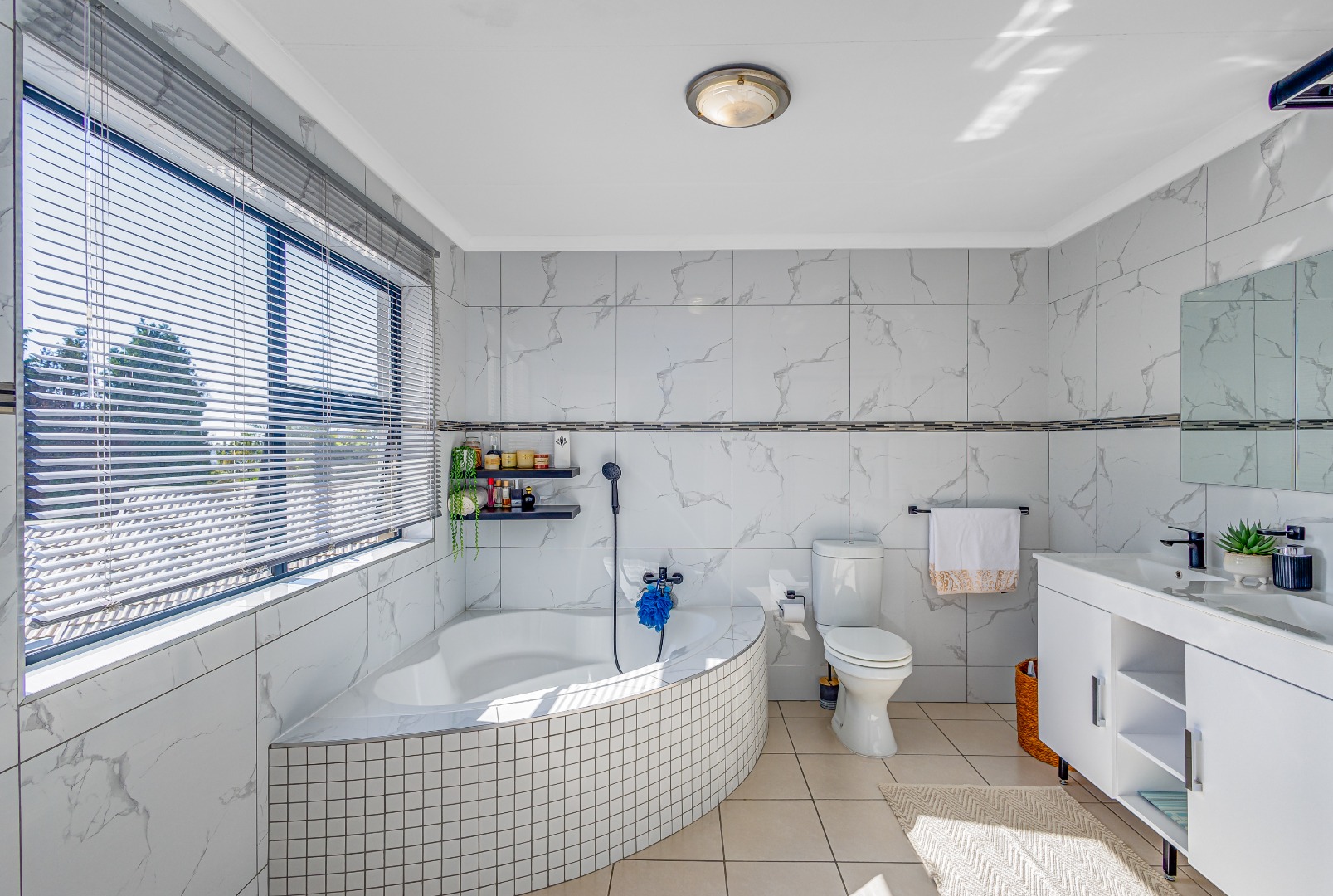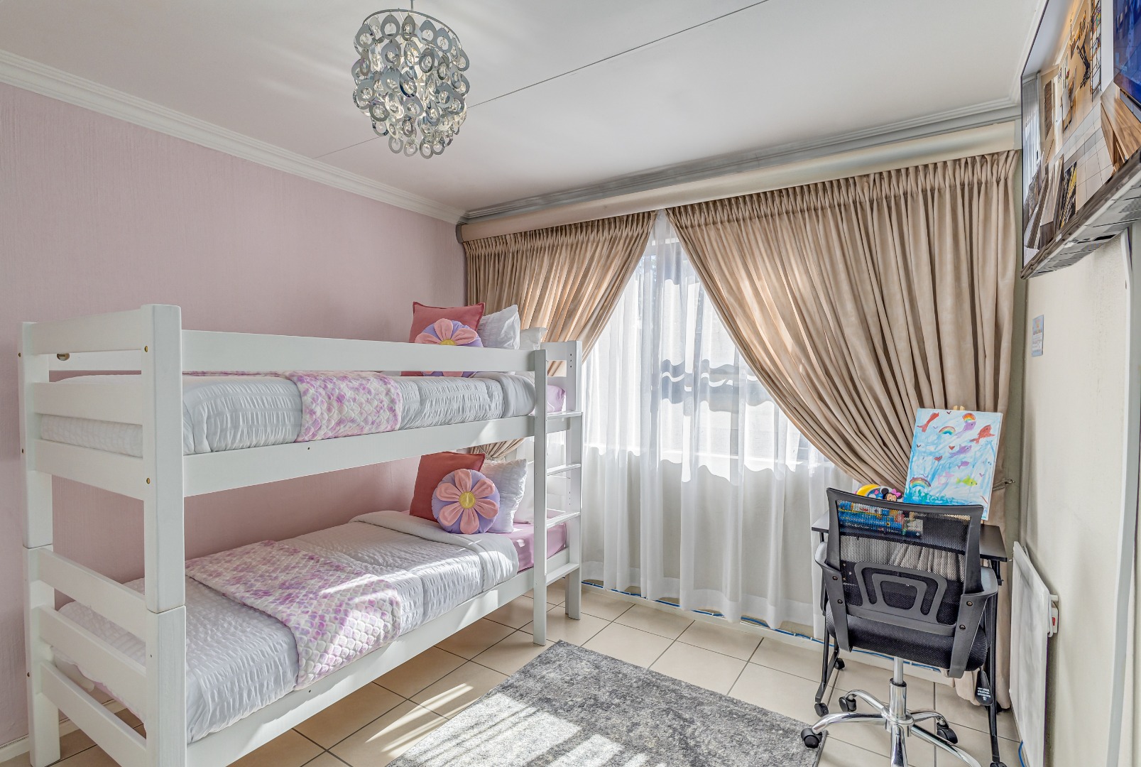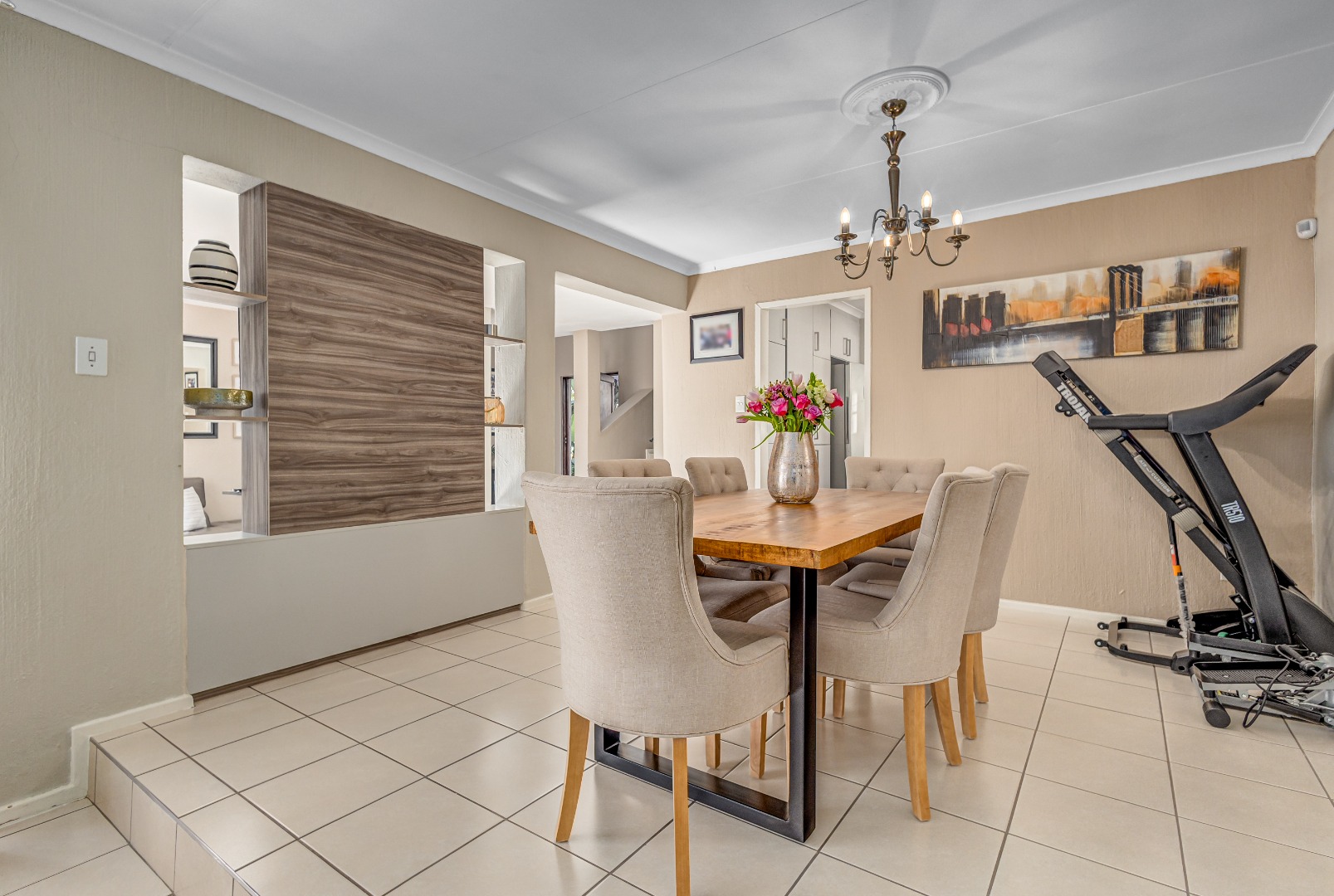 The home features two living spaces , one of which is bright and airy TV lounge that opens out onto a beautifully finished open patio — perfect for hosting friends and family. The built-in braai area overlooks a sparkling swimming pool, framed by a lush, wrap-around garden that offers privacy, space for kids to play, and a peaceful atmosphere.