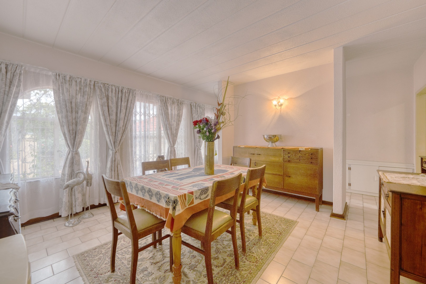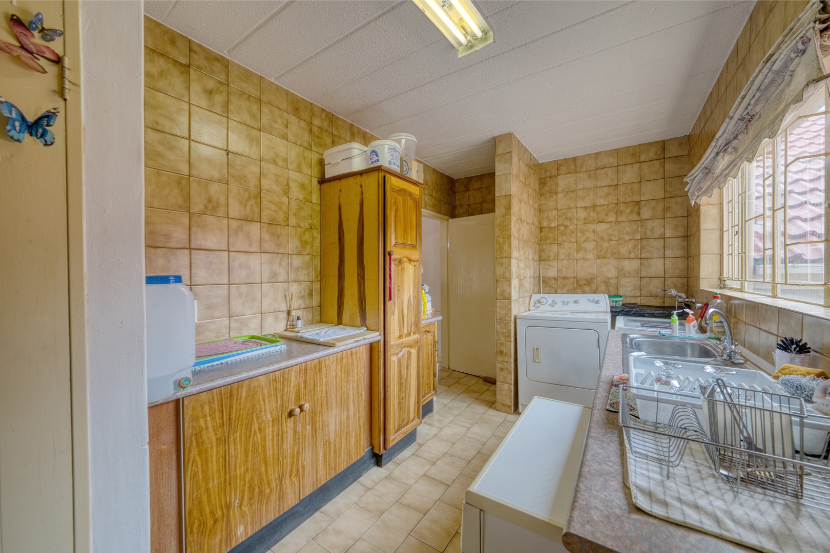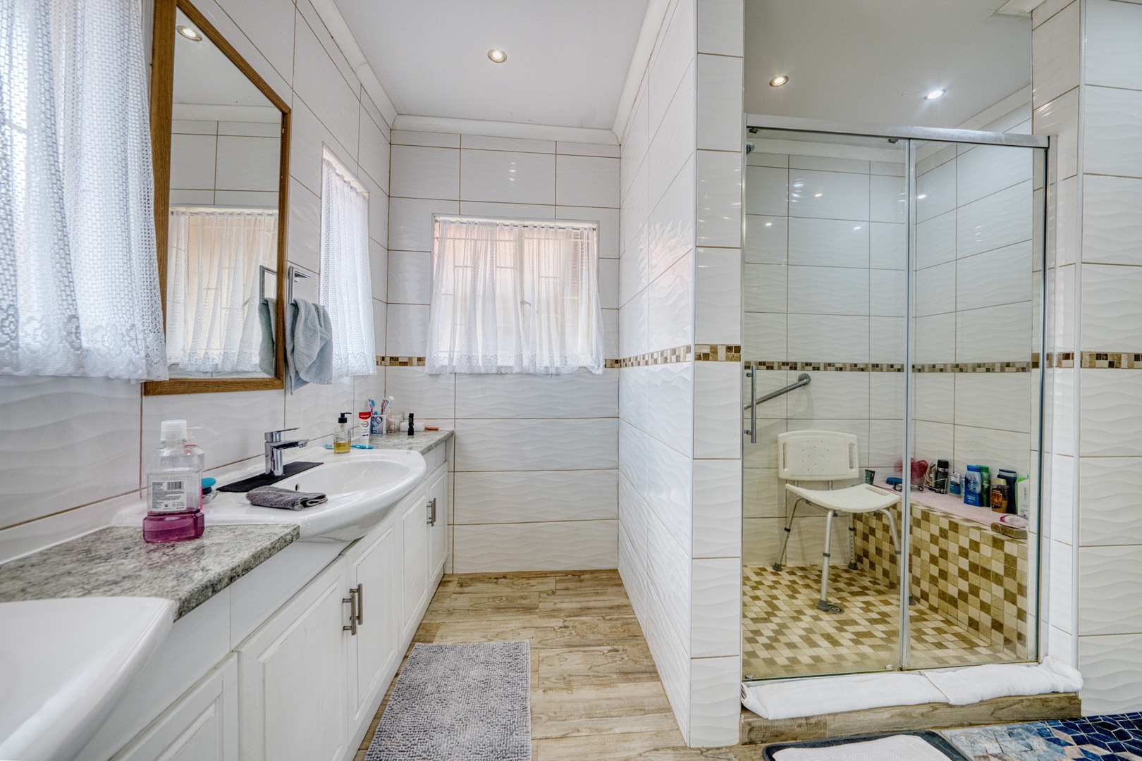 Accommodation comprises four well-proportioned bedrooms, with one en-suite bathroom, a second full bathroom, and a convenient guest toilet. The property is equipped with robust security features, including an alarm system, CCTV, an access gate, a fence, and burglar bars, ensuring peace of mind. Modern conveniences include fibre connectivity and water tanks, enhancing sustainability.