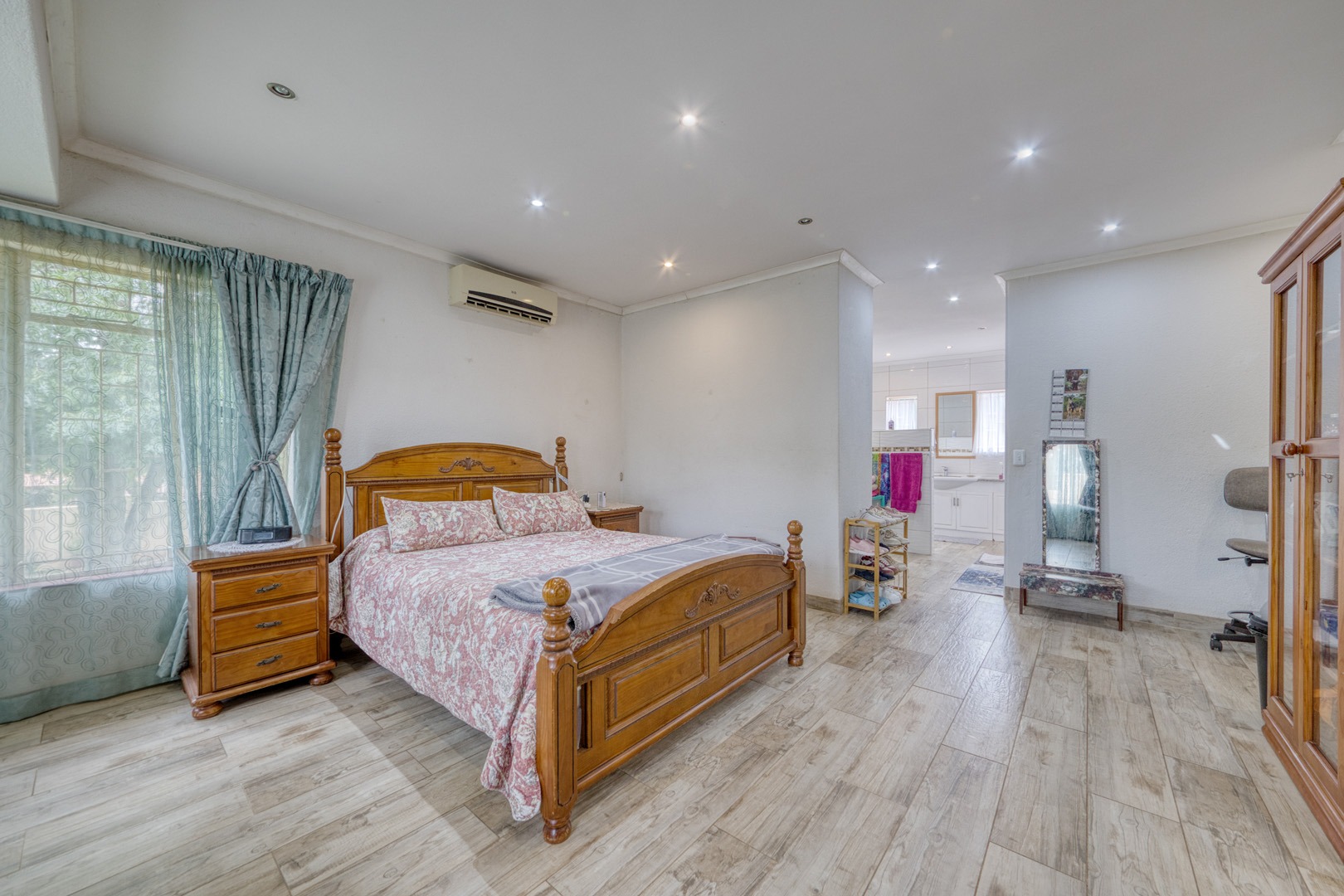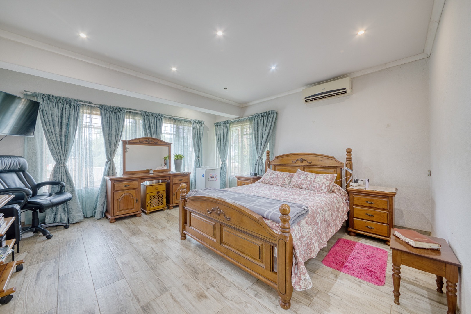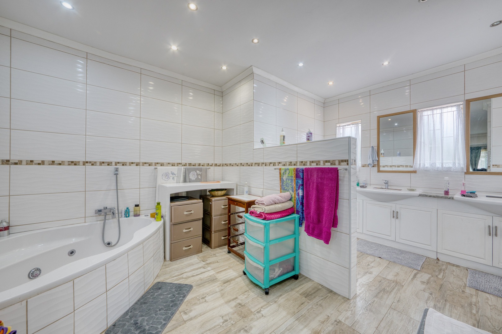 Accommodation comprises four well-proportioned bedrooms, with one en-suite bathroom, a second full bathroom, and a convenient guest toilet. The property is equipped with robust security features, including an alarm system, CCTV, an access gate, a fence, and burglar bars, ensuring peace of mind. Modern conveniences include fibre connectivity and water tanks, enhancing sustainability.