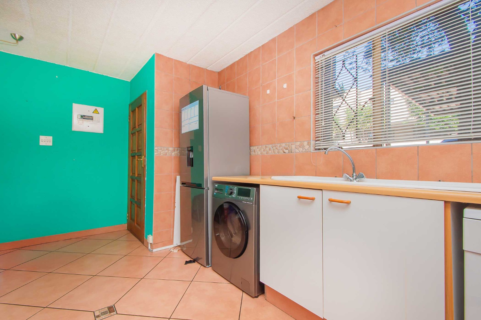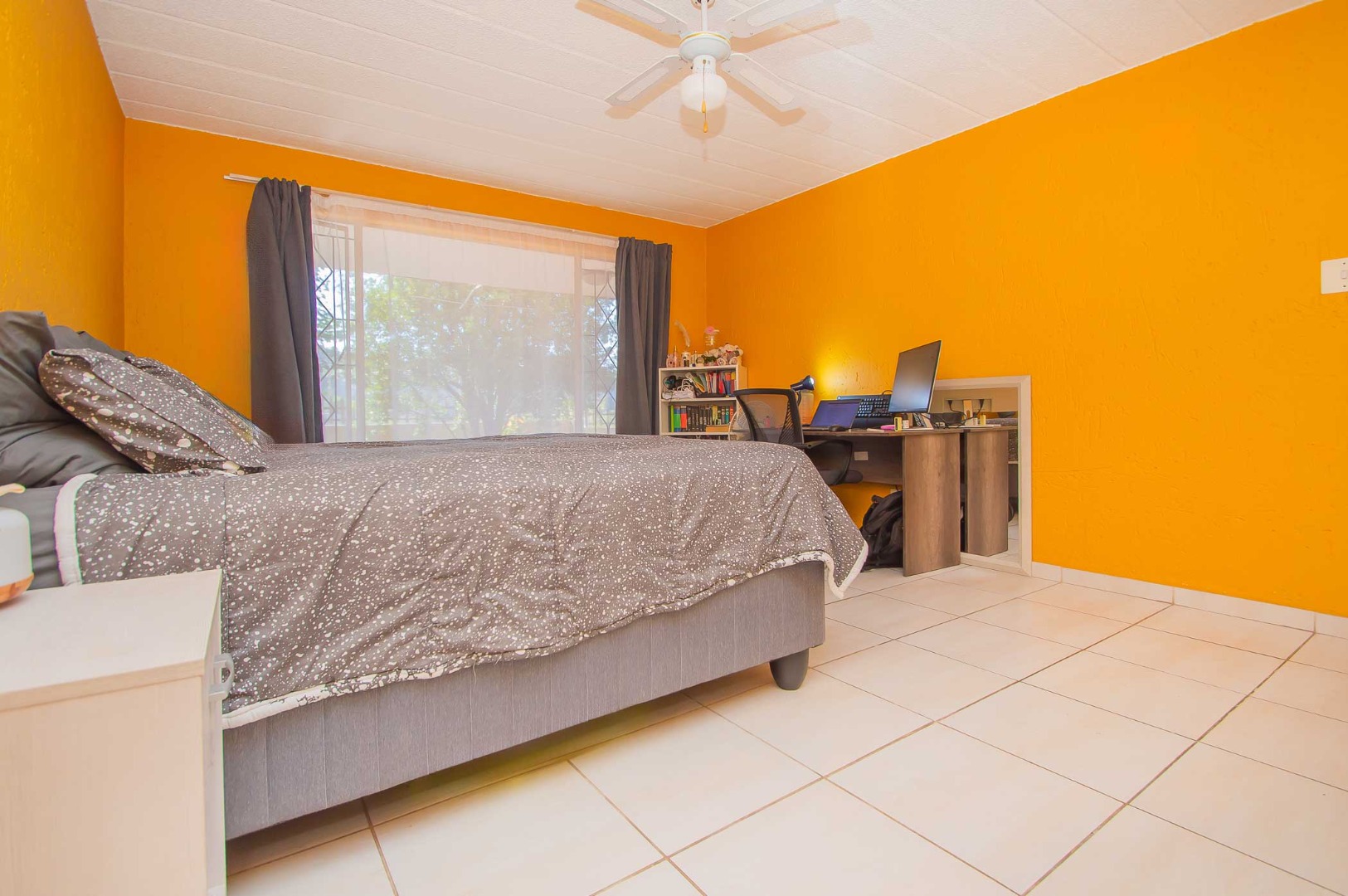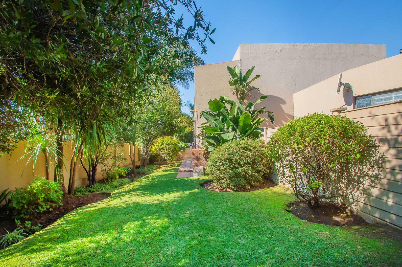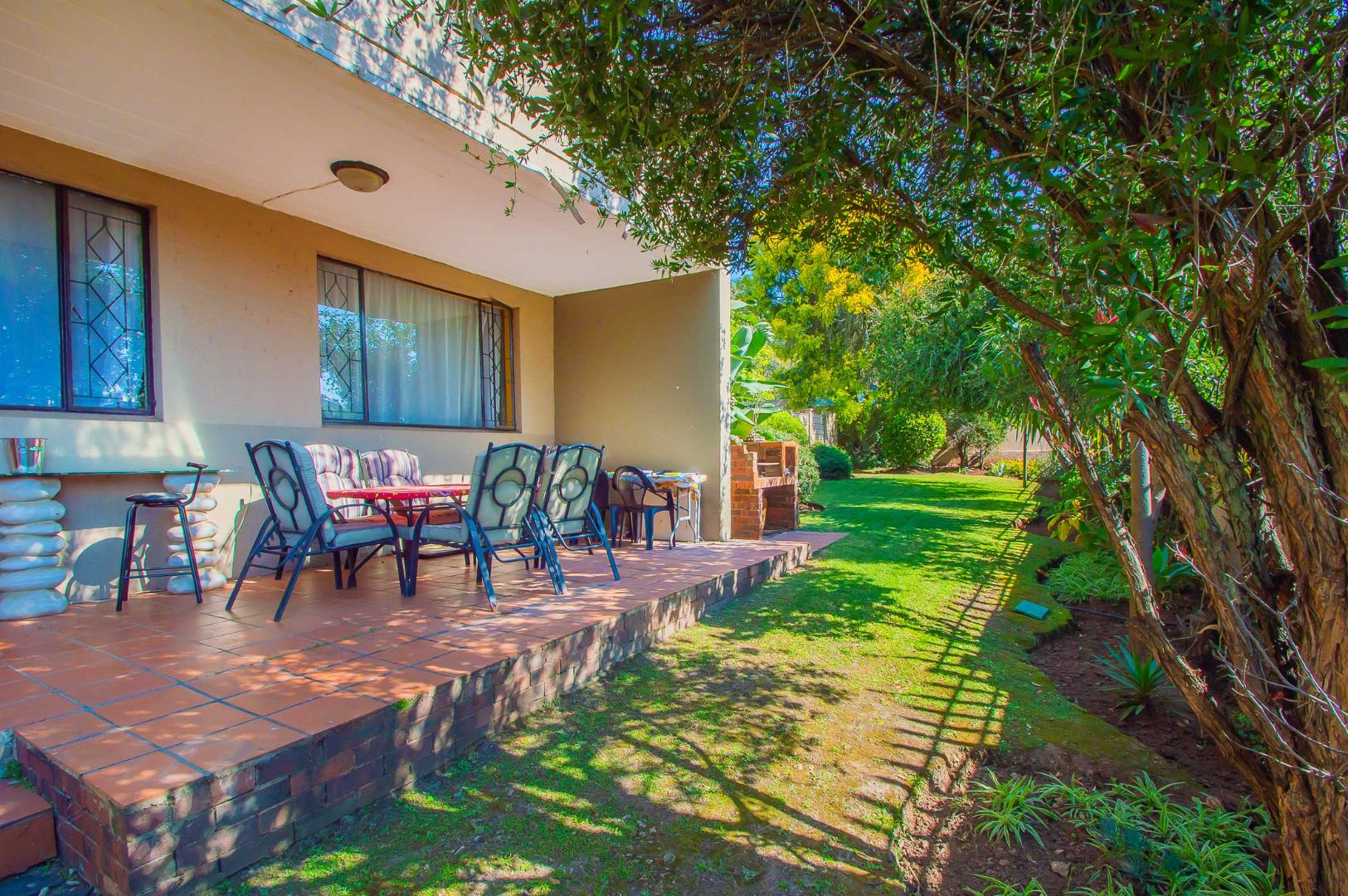 Enjoy the outdoors from the covered patio, which overlooks a vast, private garden. This spacious area is perfect for entertaining with a built-in braai, making it an entertainer's paradise.