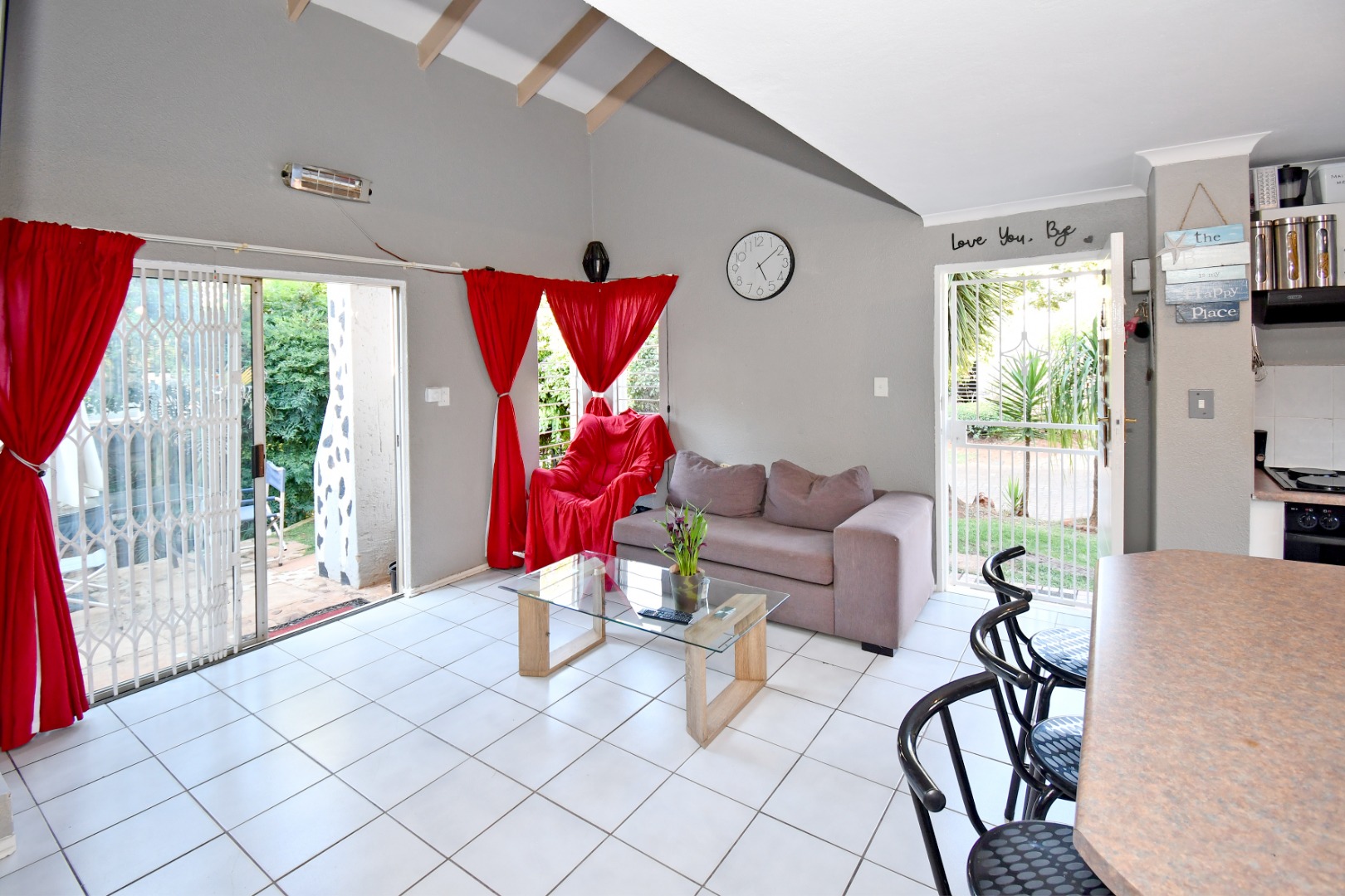 This home offers an open plan lounge with sliders to the patio and garden.
