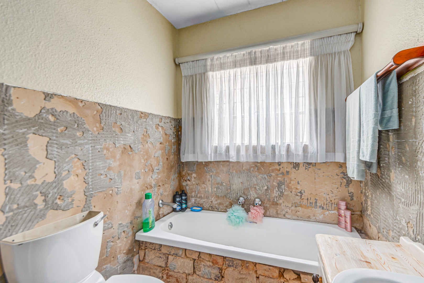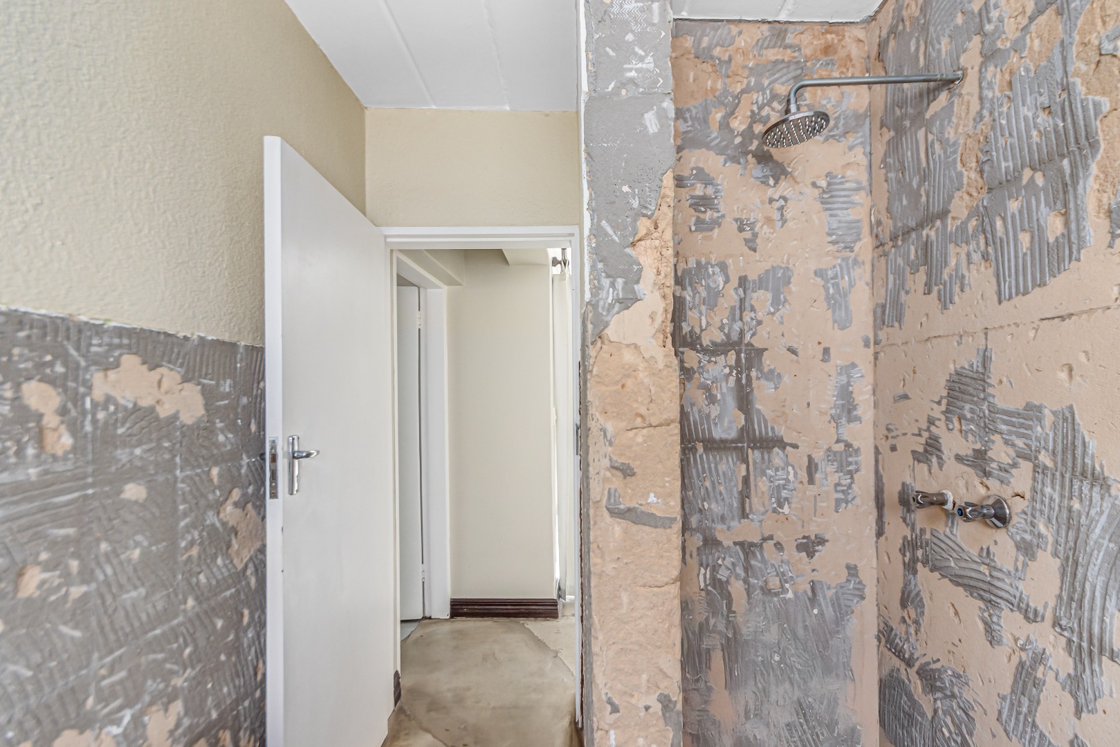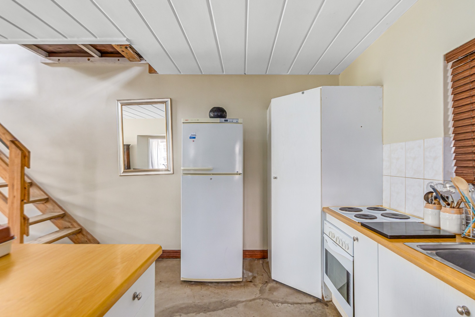 This property is currently stripped of most tiles and flooring, offering a blank canvas for your dream finishes. Please note: the upstairs balcony has experienced leakage, causing water damage to the bedroom ceilings and built-in cupboards, and these will need to be replaced.