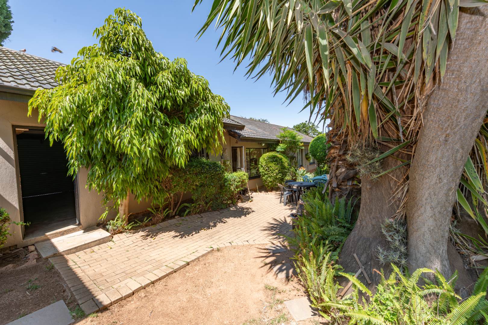 Step into an expansive dining and lounge area that flows seamlessly into a peaceful, bird-filled garden. A sparkling pool sits nestled among the greenery, creating a private oasis to enjoy year-round.