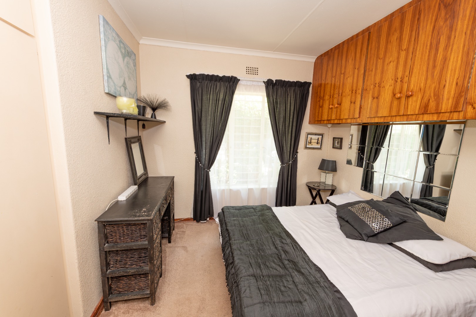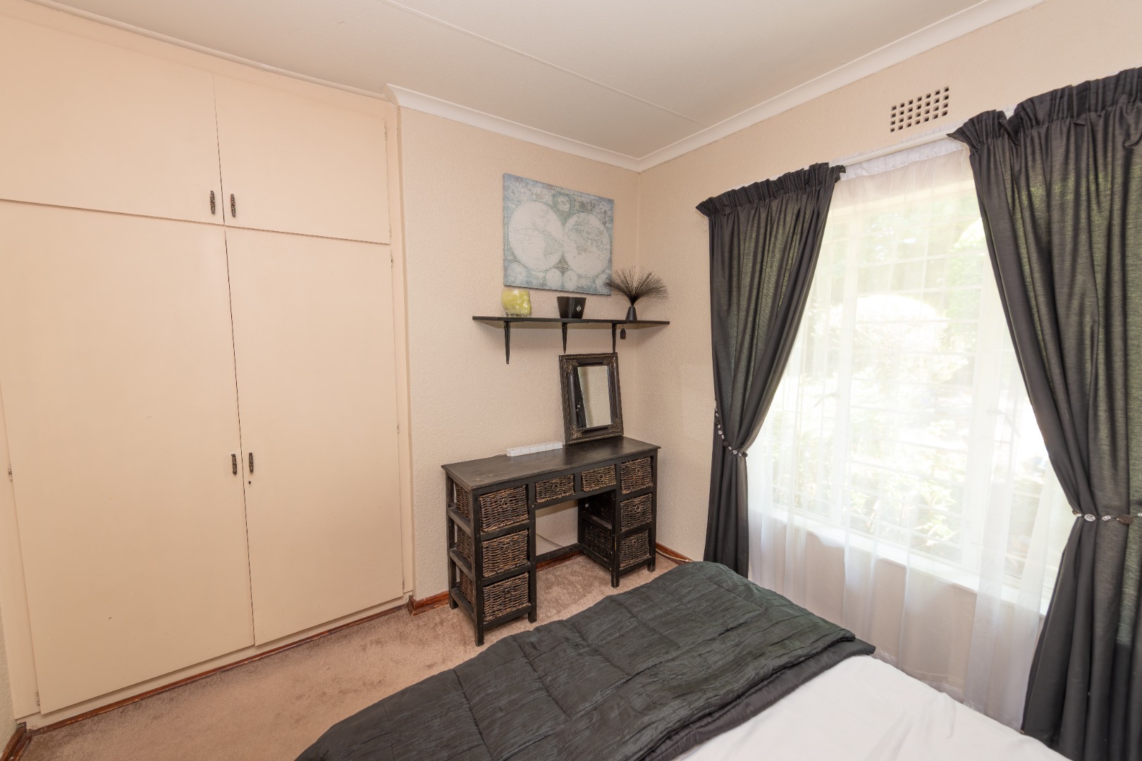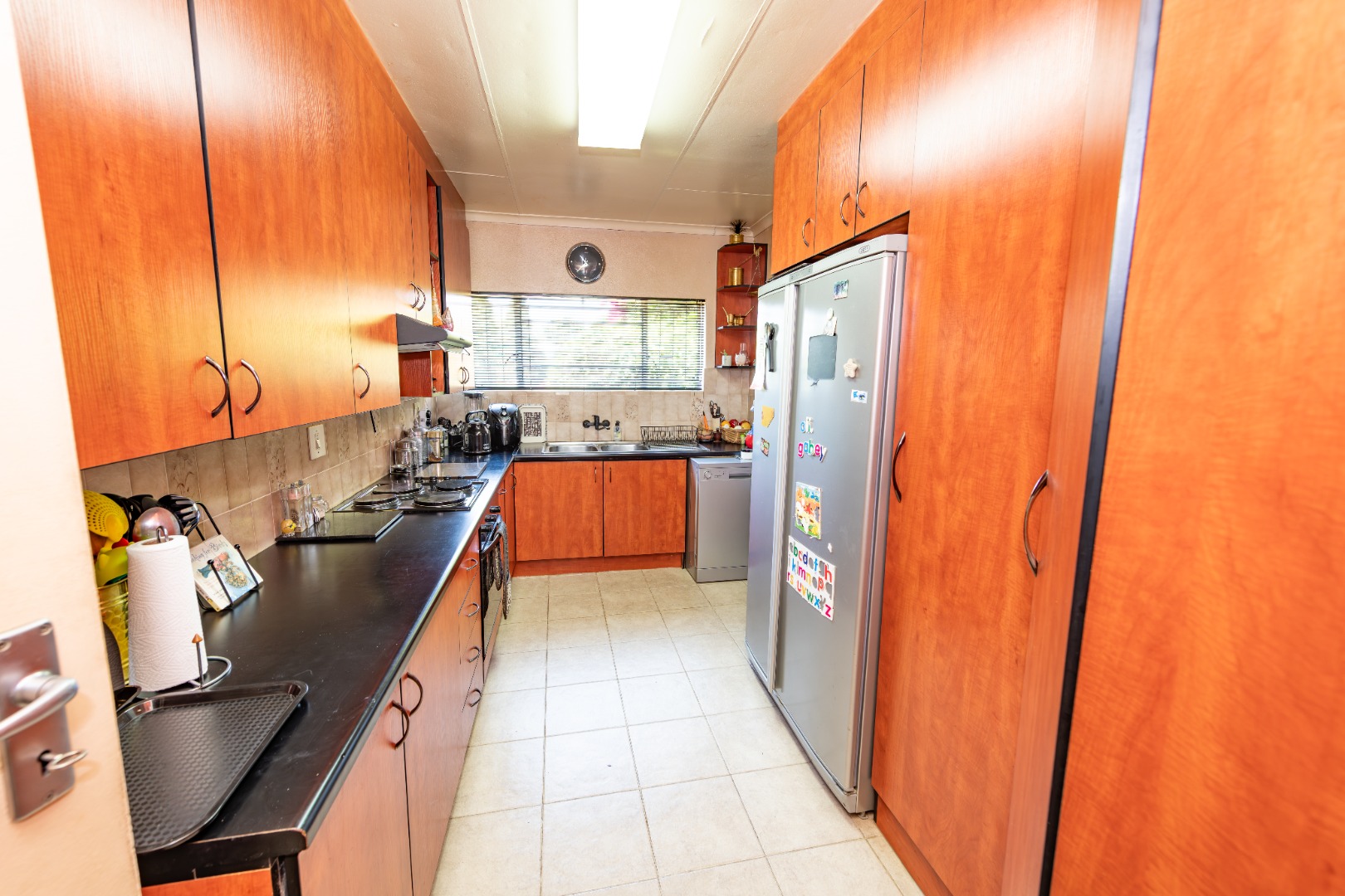 - A well-appointed kitchen with built-in cupboards that reach to the ceiling