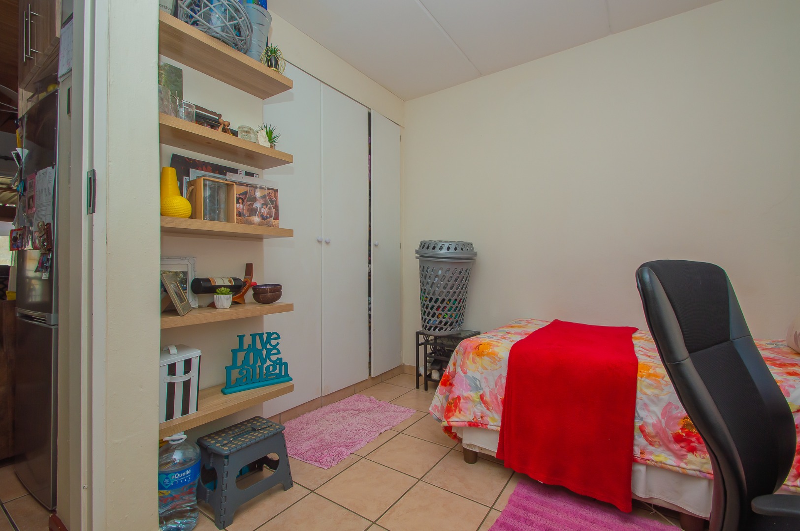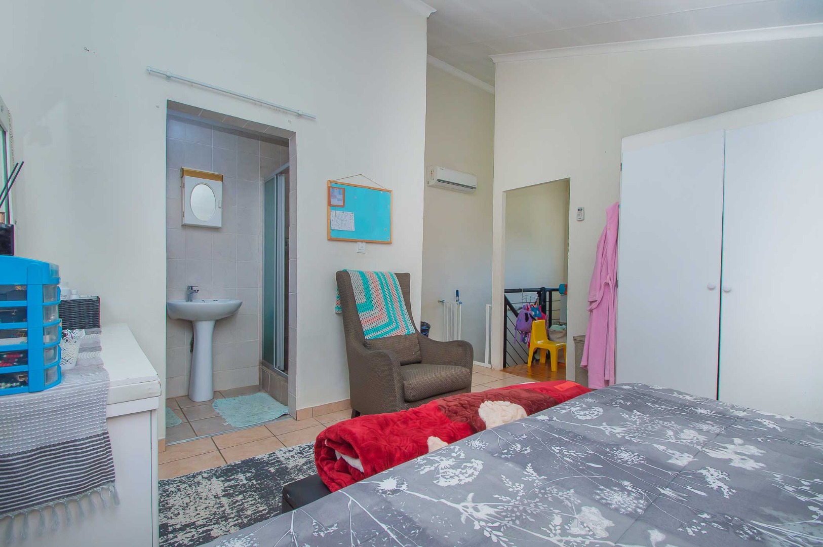 Featuring three bedrooms with built-in cupboards, the main bedroom and second bedroom have en-suite bathrooms. The main bedroom is privately situated upstairs, complemented by an adjacent study or can be used as a third bedroom — ideal for those working from home. The second bedroom is conveniently located on the ground floor.