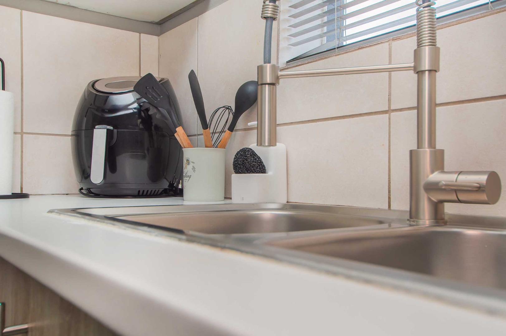 Modern gourmet kitchen with additional cupboards and a wine rack, a corner pantry, a breakfast nook and space for two under counter appliances and a fridge. The kitchen overlooks the spacious living areas that is fibre ready and has stunning light fixtures. This leads out onto the patio that has built in seating, a lush green garden that wraps around the Home and is pet friendly.