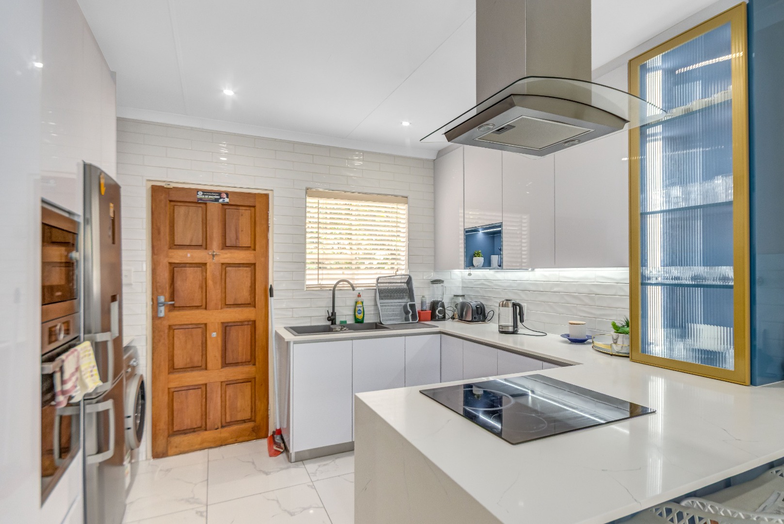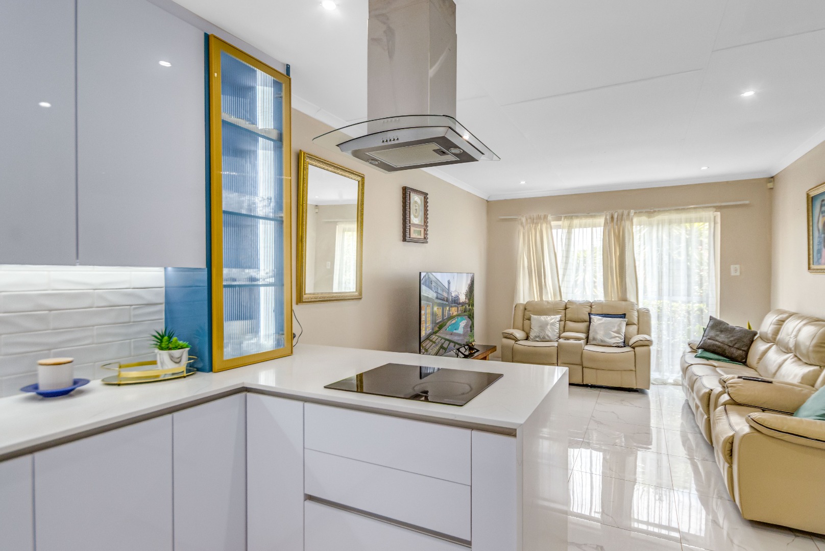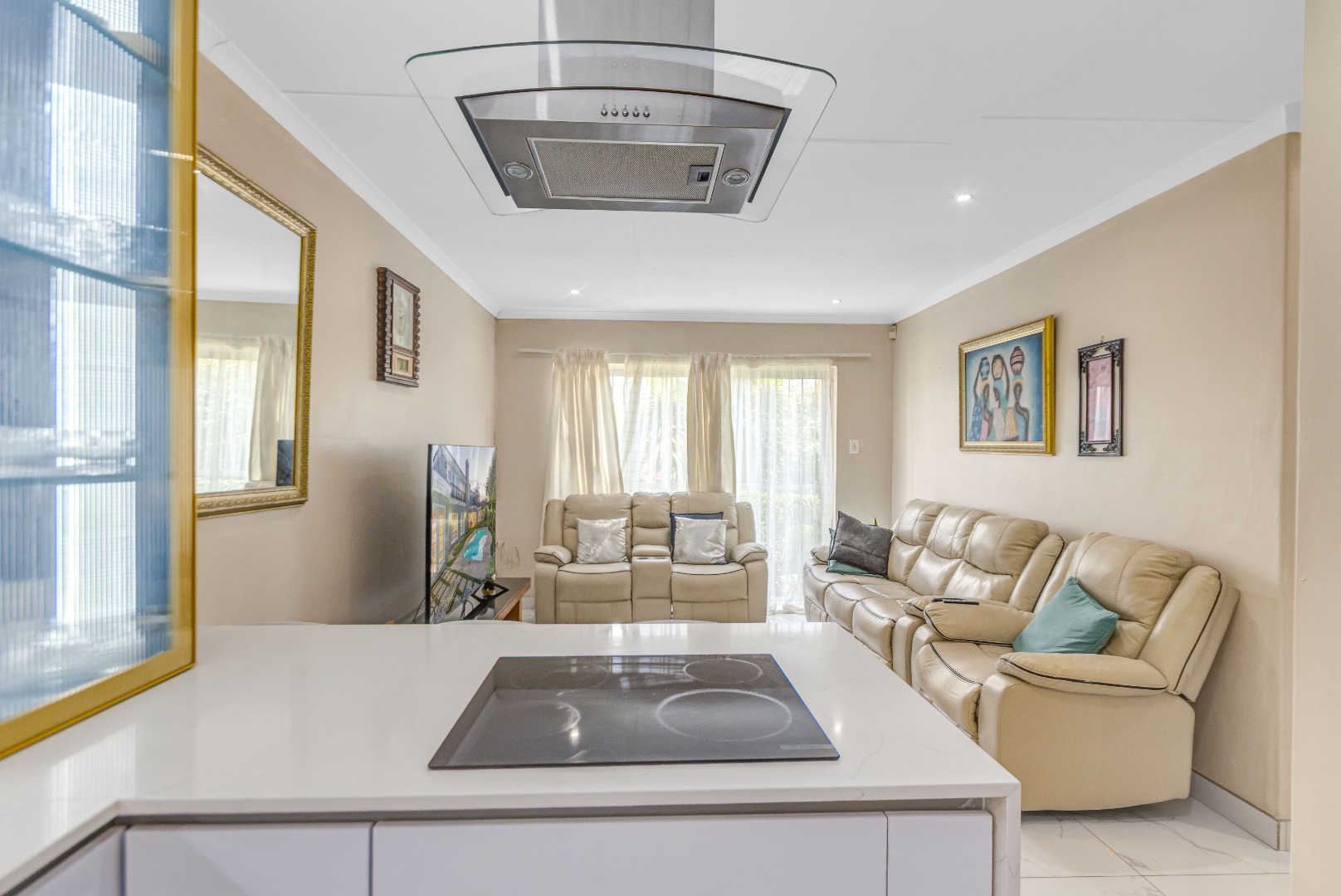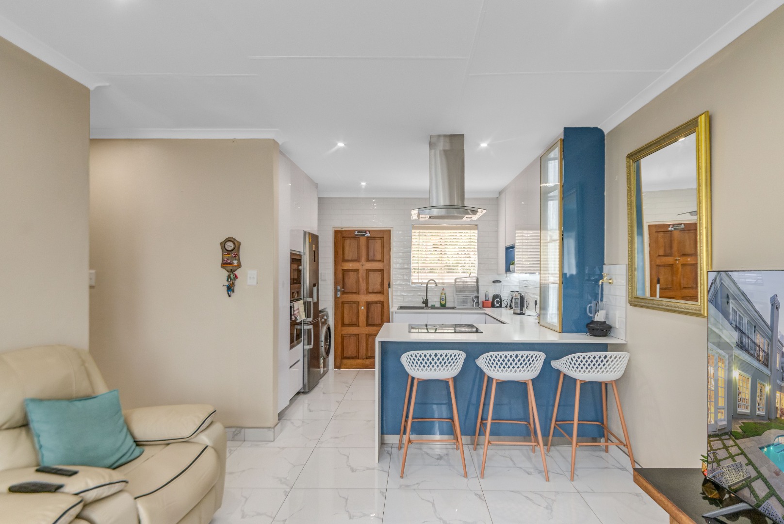 The home features three well-sized bedrooms with built-in cupboards and two bathrooms, including a main en-suite. The layout is practical and welcoming, with a neat, modern kitchen offering ample cupboard space and a breakfast counter that flows seamlessly into the living area — perfect for everyday living and entertaining.