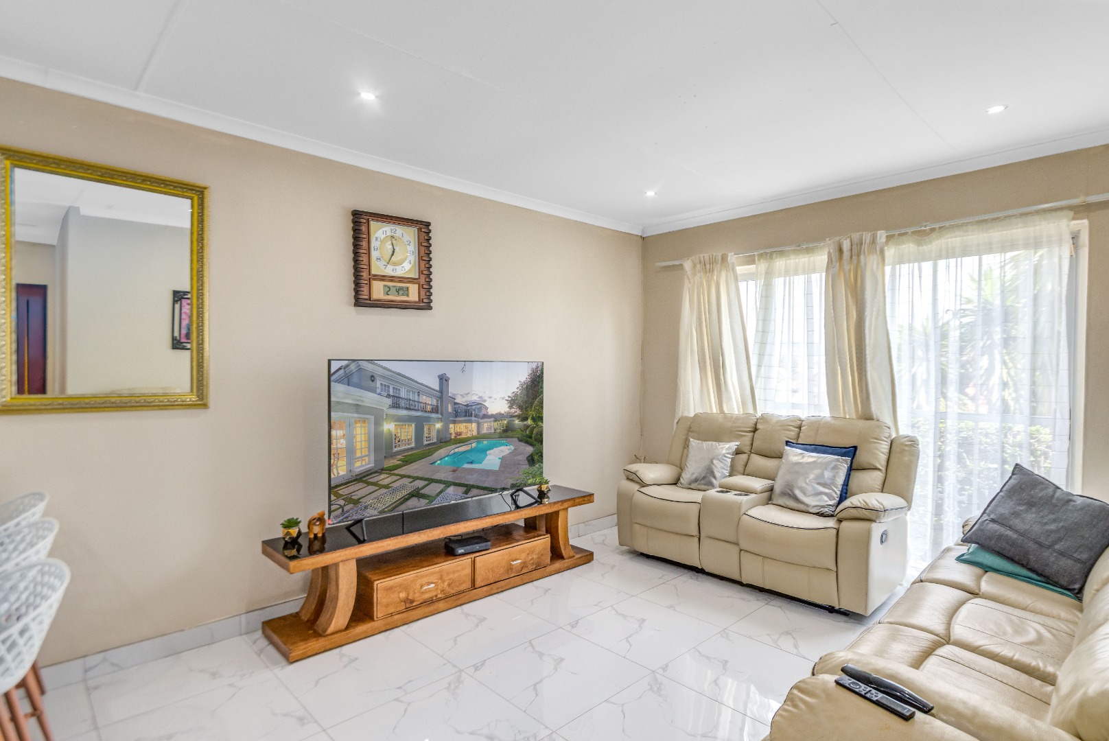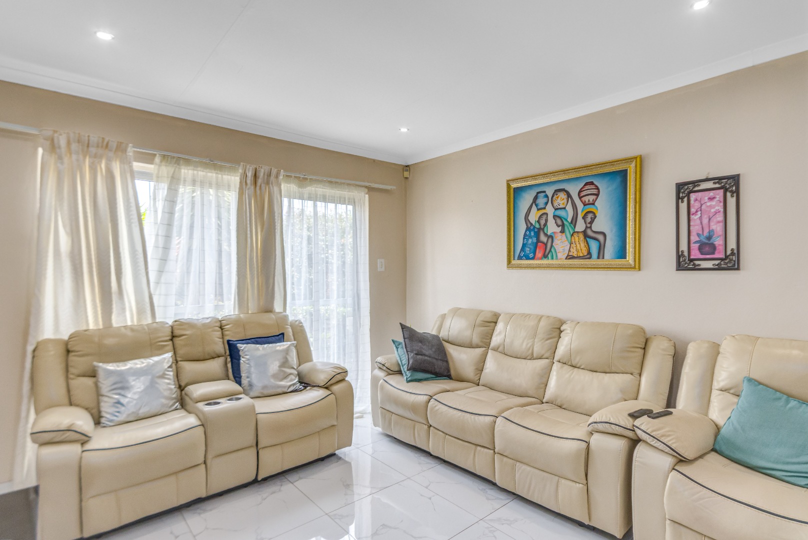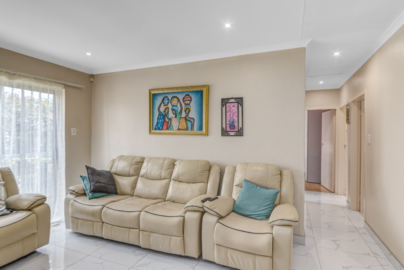 The home features three well-sized bedrooms with built-in cupboards and two bathrooms, including a main en-suite. The layout is practical and welcoming, with a neat, modern kitchen offering ample cupboard space and a breakfast counter that flows seamlessly into the living area — perfect for everyday living and entertaining.