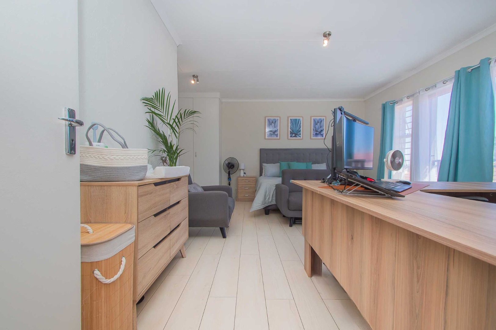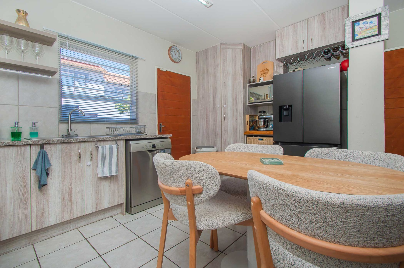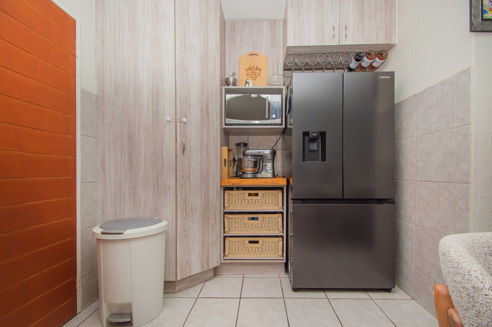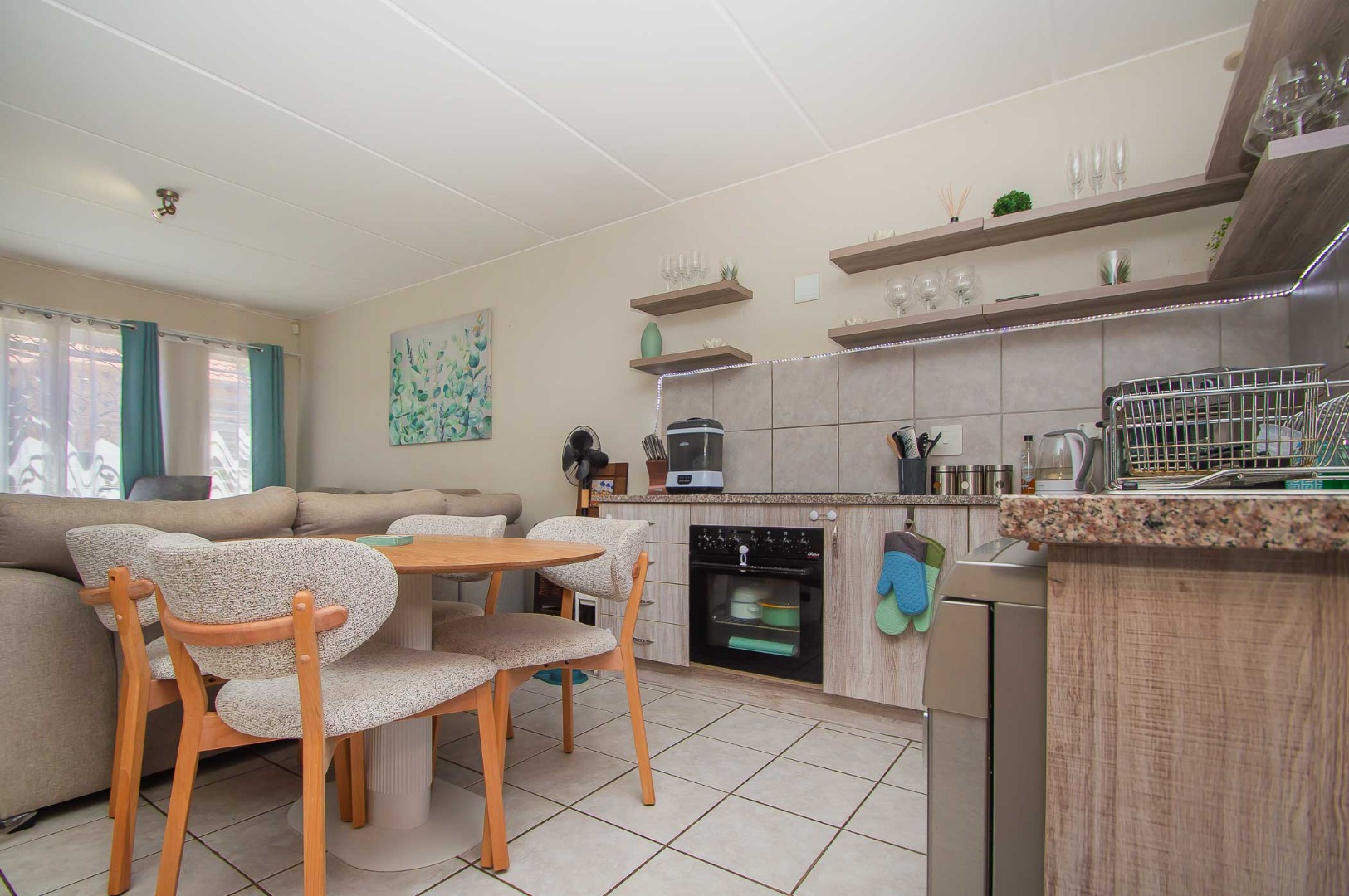 Security is well taken care of with an access gate, electric fencing, and an intercom system, ensuring peace of mind in the secure complex. Modern sustainability features include a rental solar system with 8 panels, a 5kVA inverter, and a 10kW battery. The complex also allows generators, is fibre-ready, and the home includes a heat pump geyser and a double automated garage with direct access into the house.