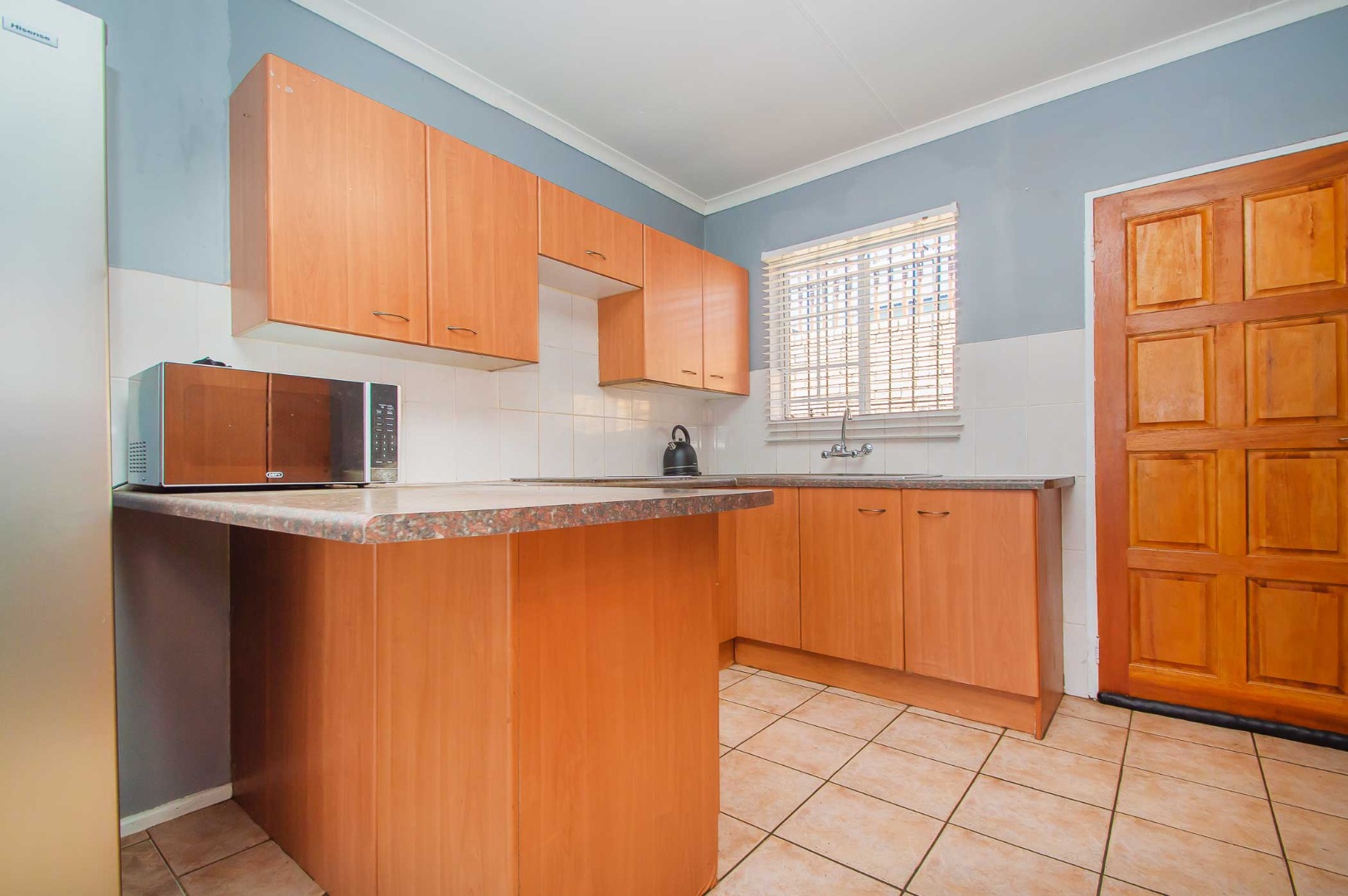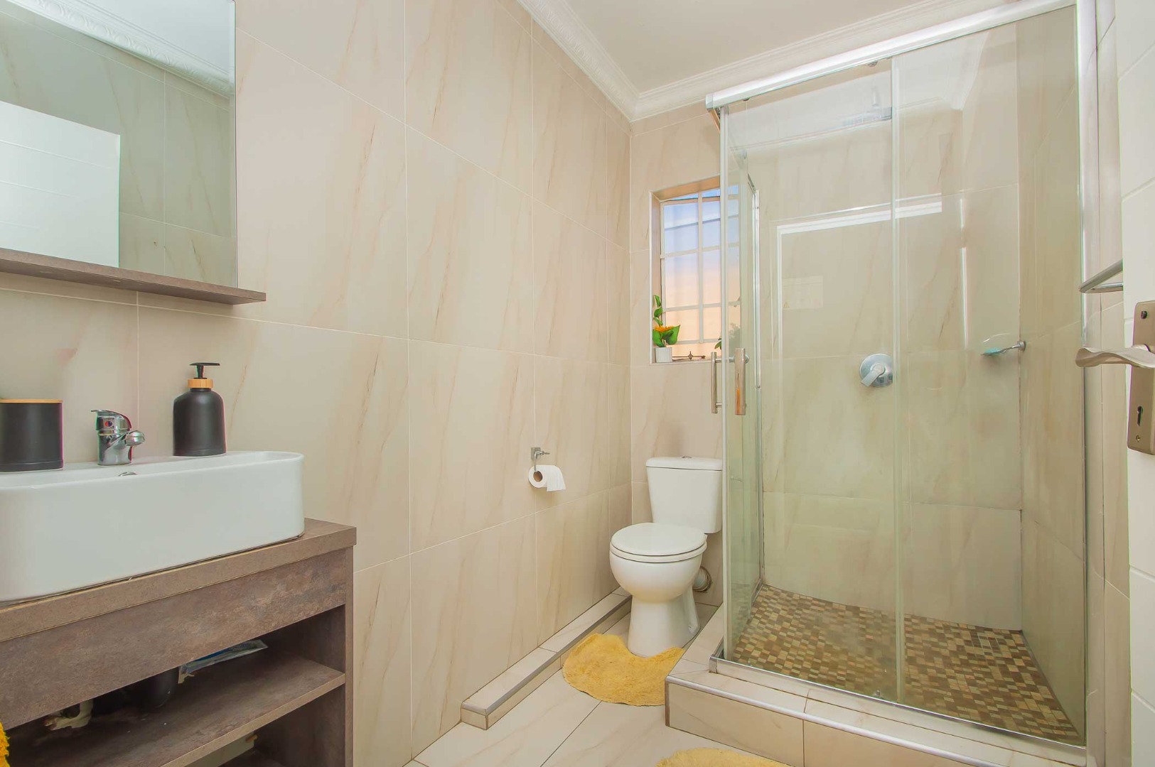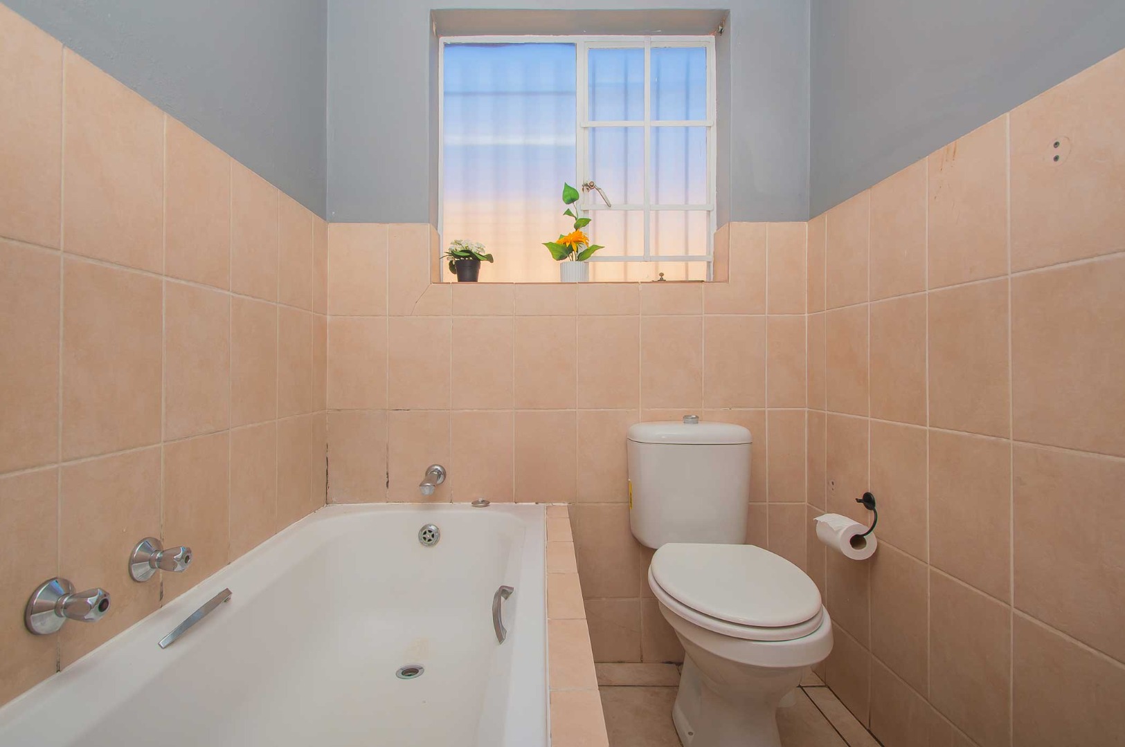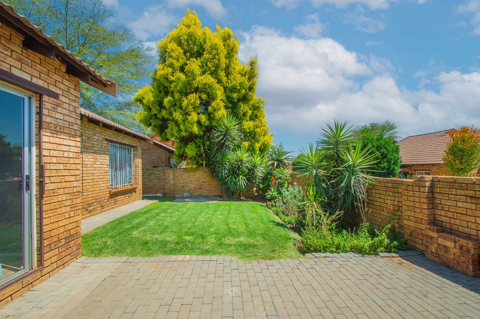 3 bedrooms that are well appointed. The main bedroom has ample cupboards, and has an en suite bathroom with a bath, toilet and basin – the bathroom is tiled to the roof. The second and third bedrooms are large and have built-in cupboards and are complimented by the second bathroom that is modern and has a shower, toilet and basin.