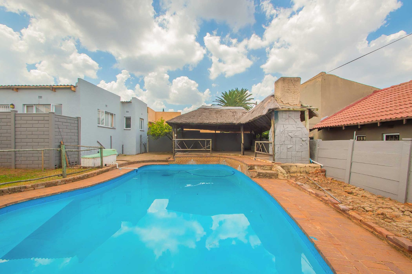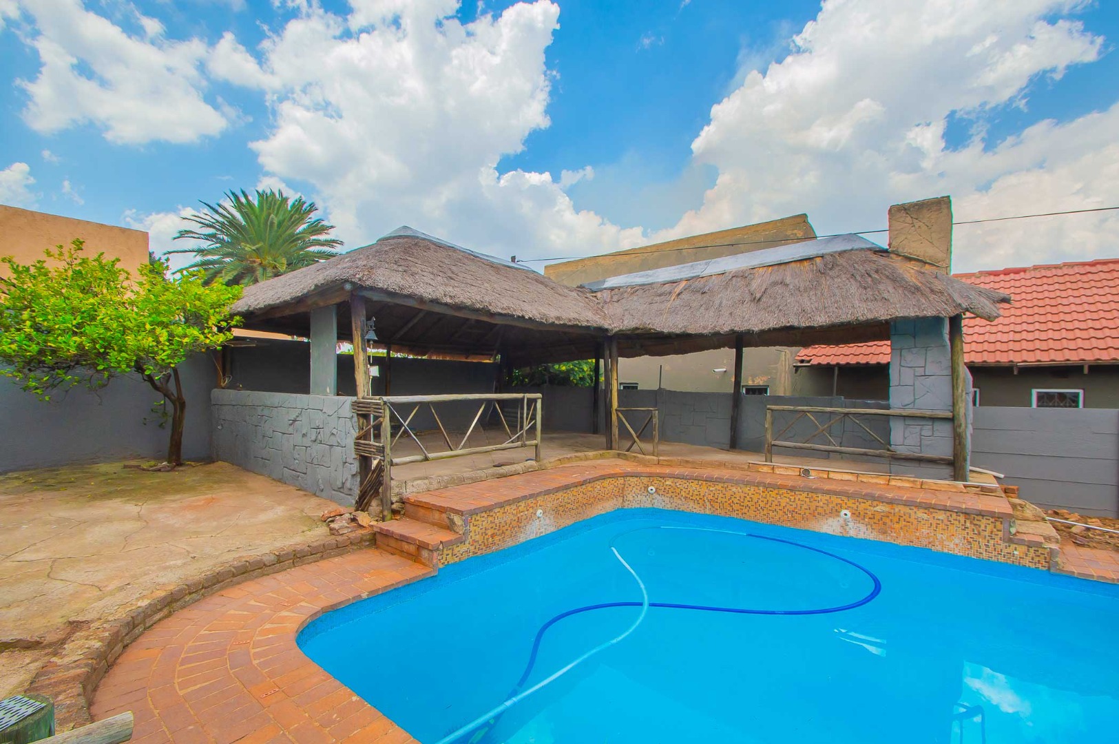 Outside is a wrap around garden with a blue sparkling swimming pool, a large entertaining lapa with a built-in braai for all those get-togethers and an outside storge area and a additional under cover patio on the other side of this Home.