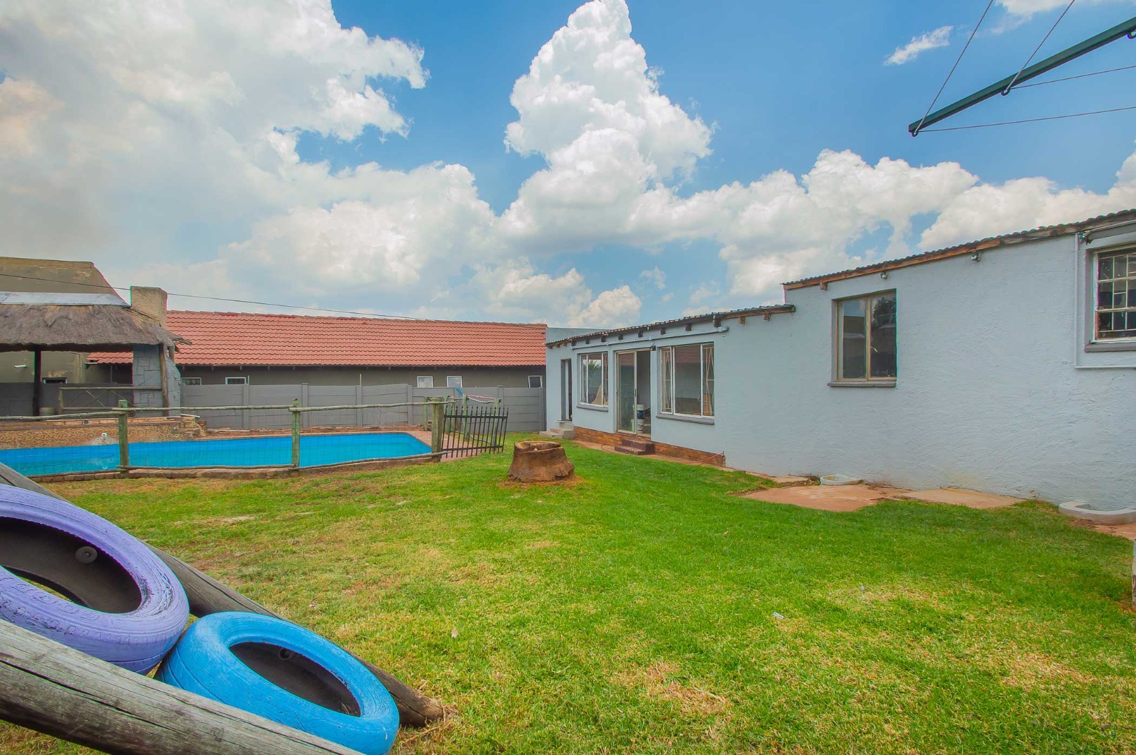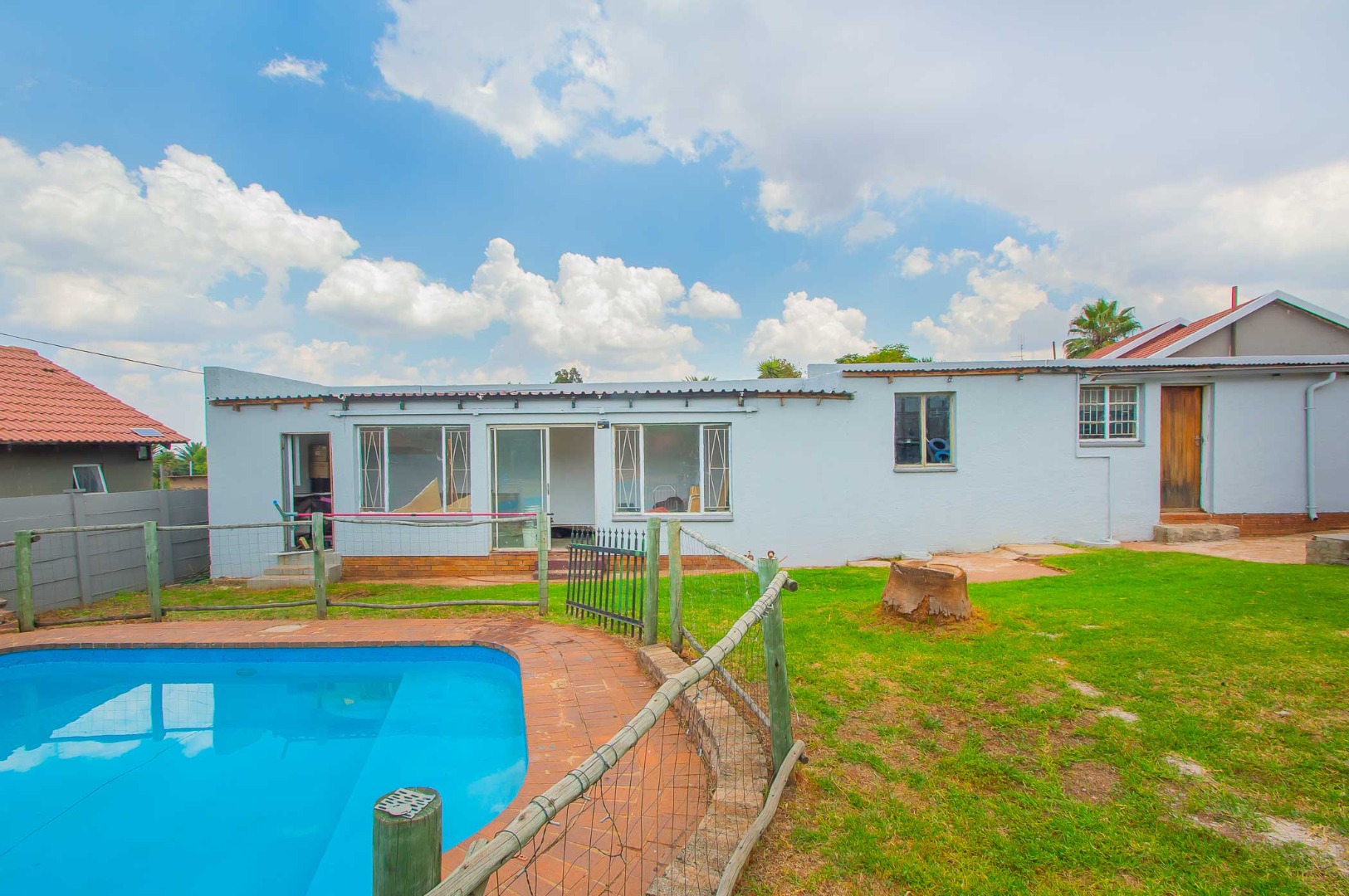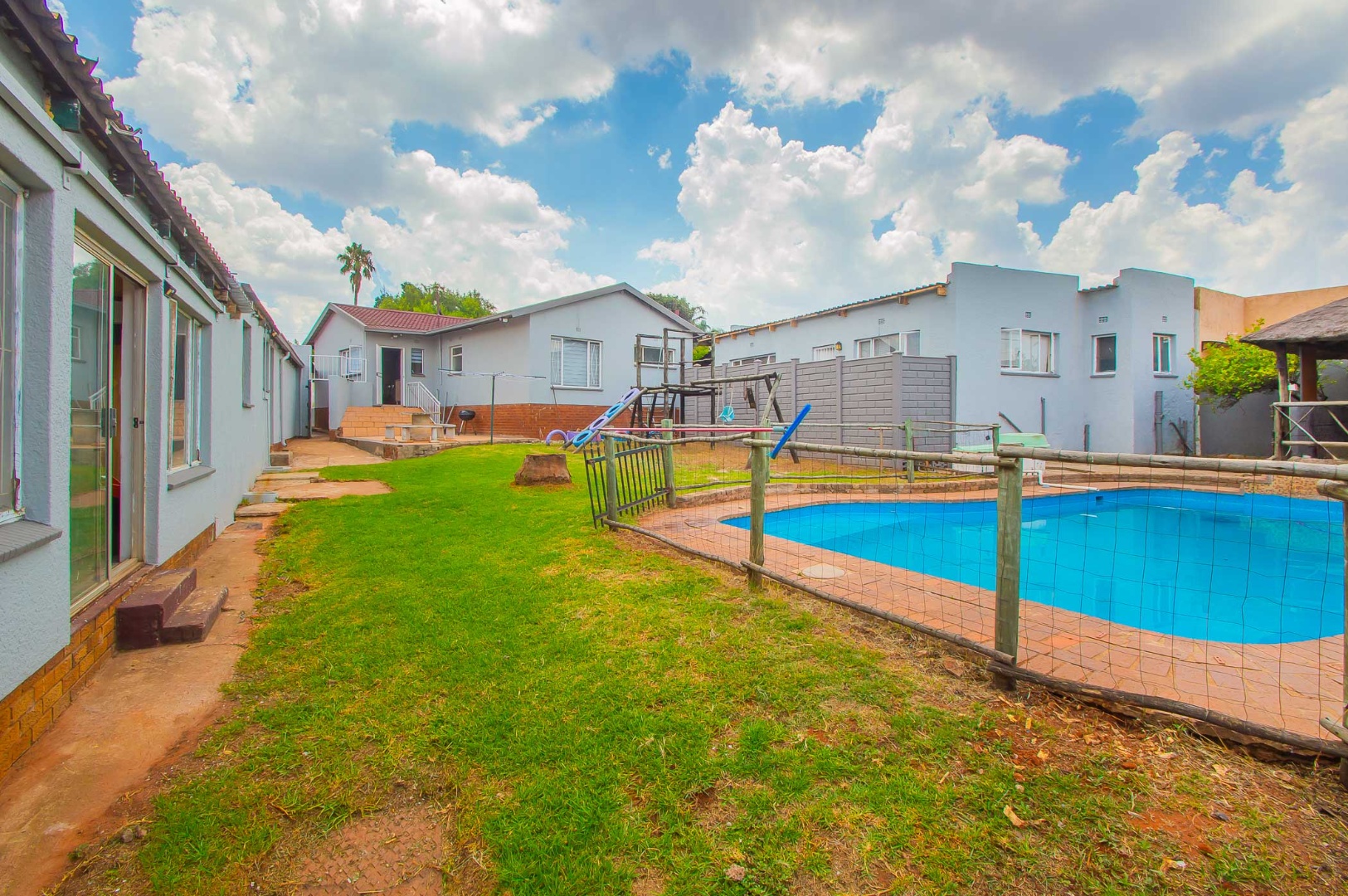 Outside is a wrap around garden with a blue sparkling swimming pool, a large entertaining lapa with a built-in braai for all those get-togethers and an outside storge area and a additional under cover patio on the other side of this Home.