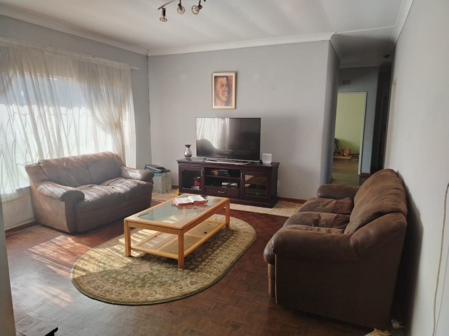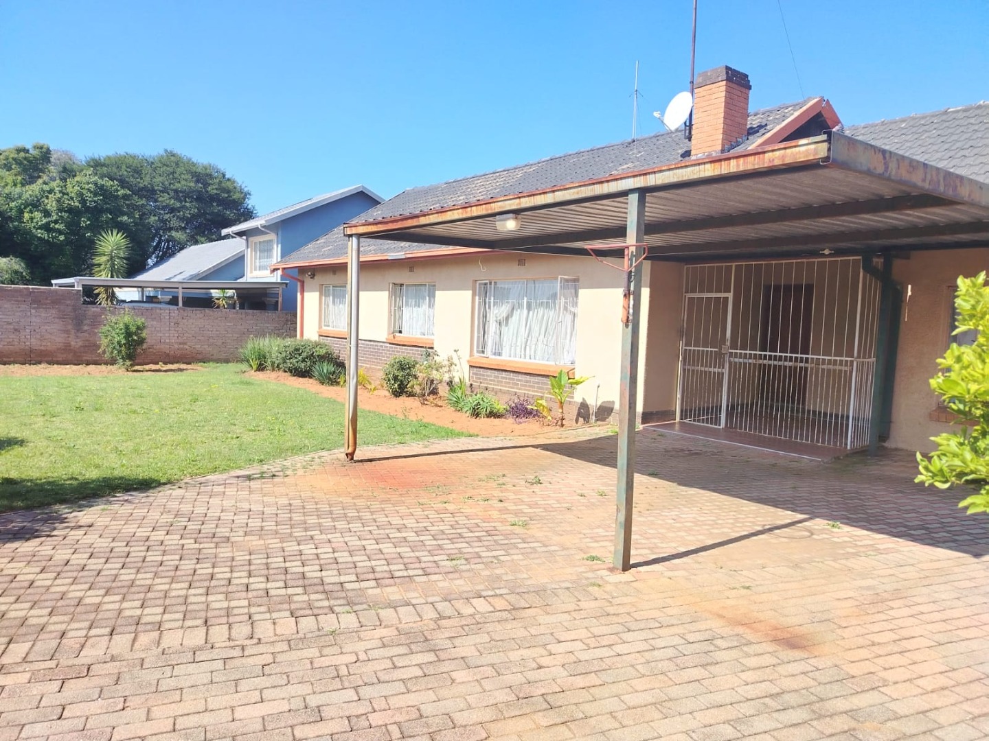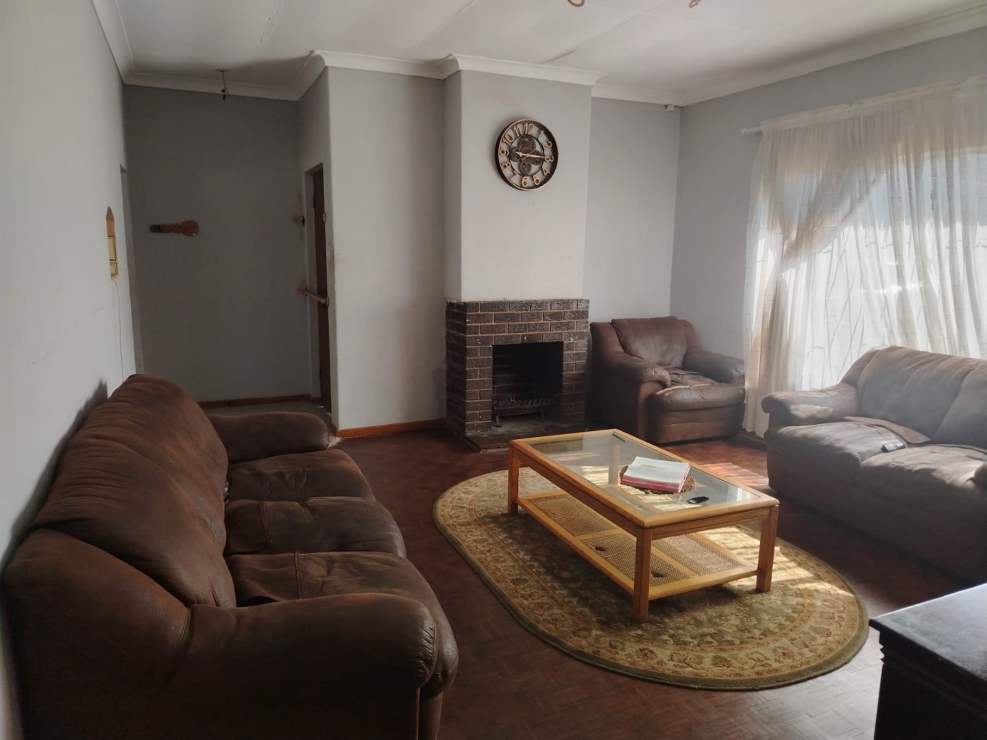 The home boasts three bedrooms with built-in cupboards and beautiful parquet flooring. The bathroom includes a shower and toilet, with a separate bath and basin for added convenience. A welcoming lounge with a fireplace adds warmth and character to the home.