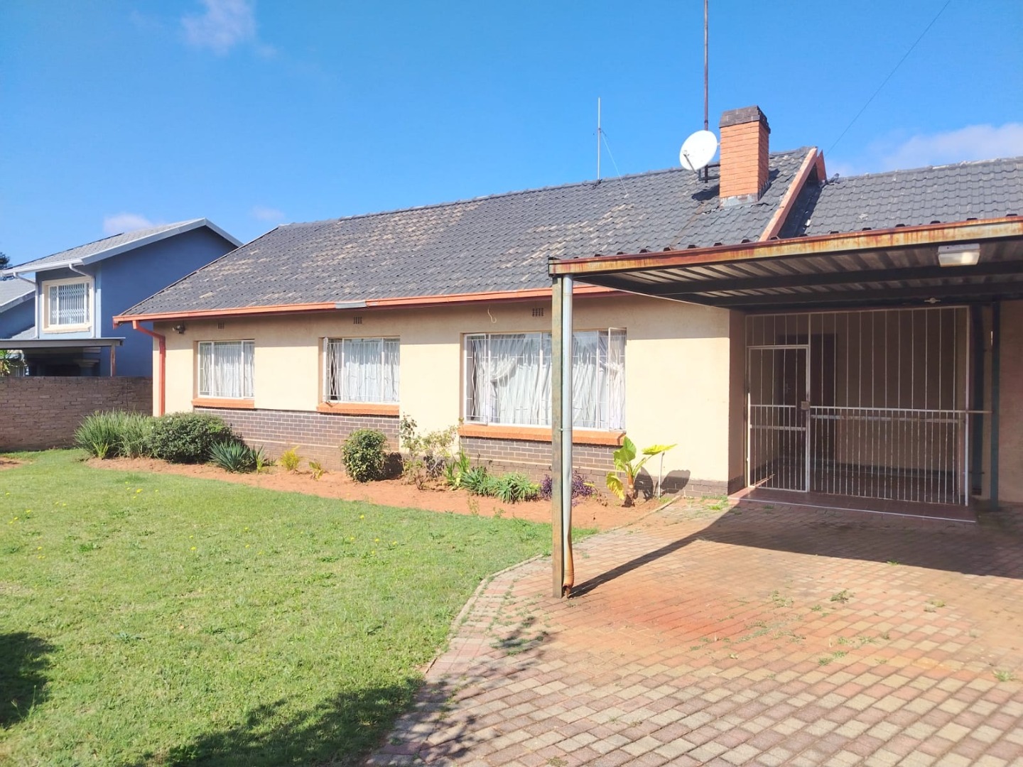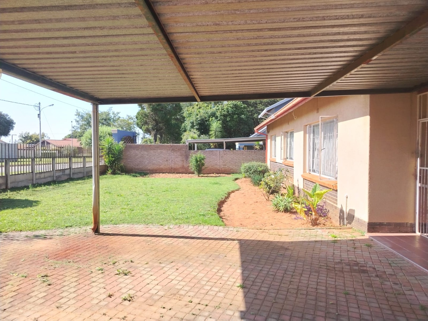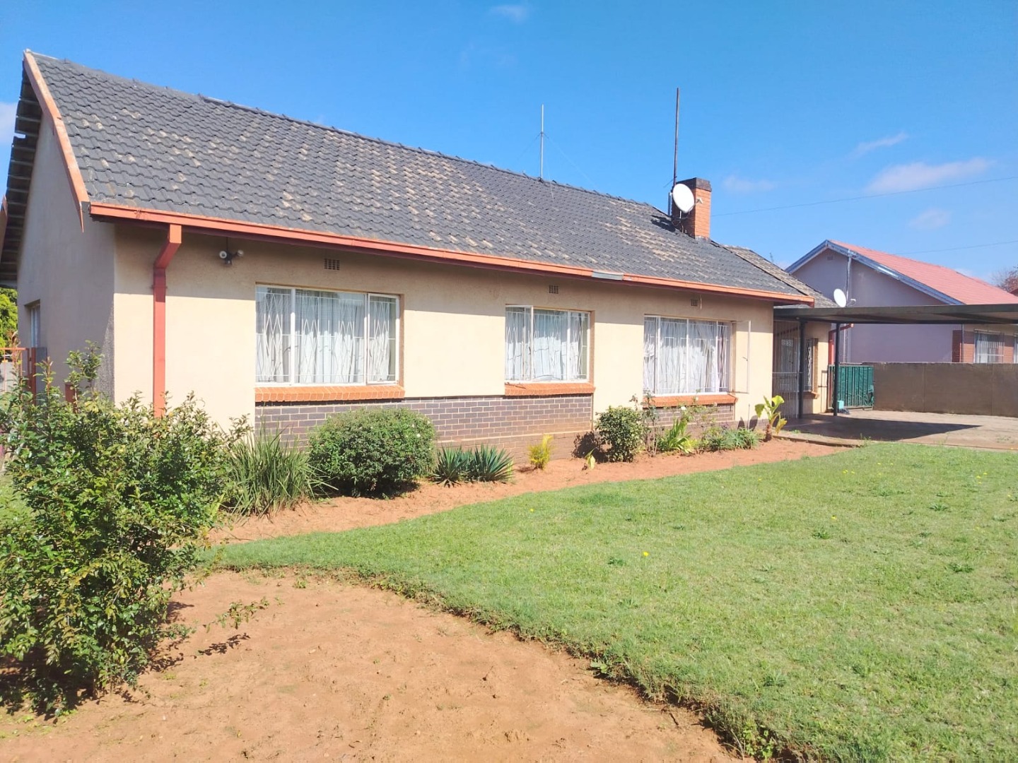 The home boasts three bedrooms with built-in cupboards and beautiful parquet flooring. The bathroom includes a shower and toilet, with a separate bath and basin for added convenience. A welcoming lounge with a fireplace adds warmth and character to the home.