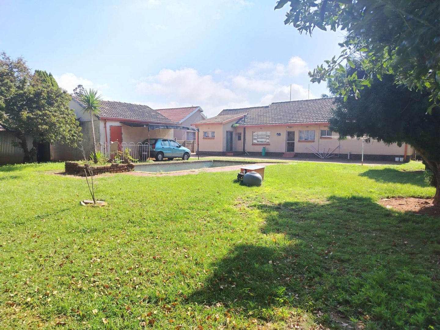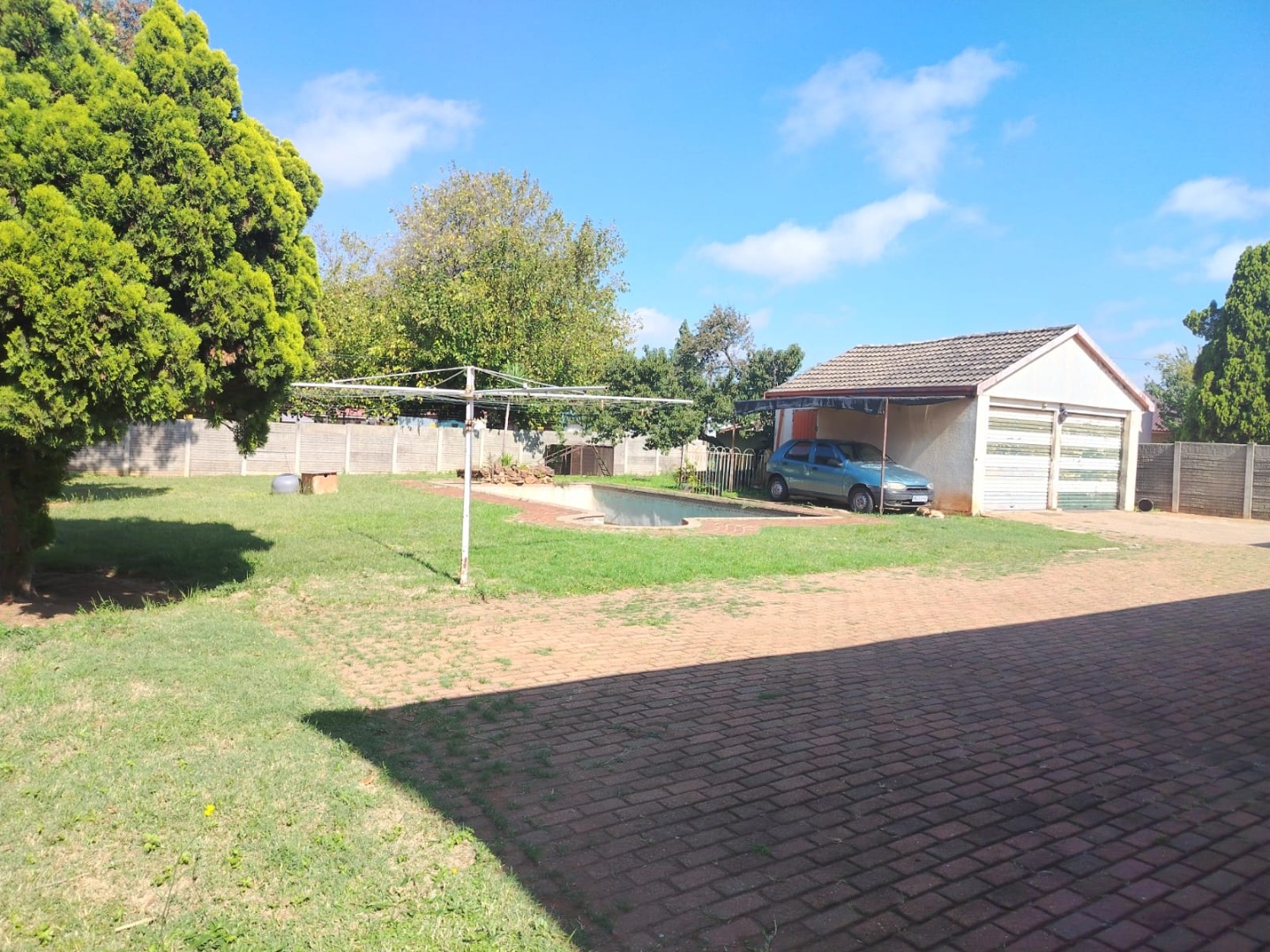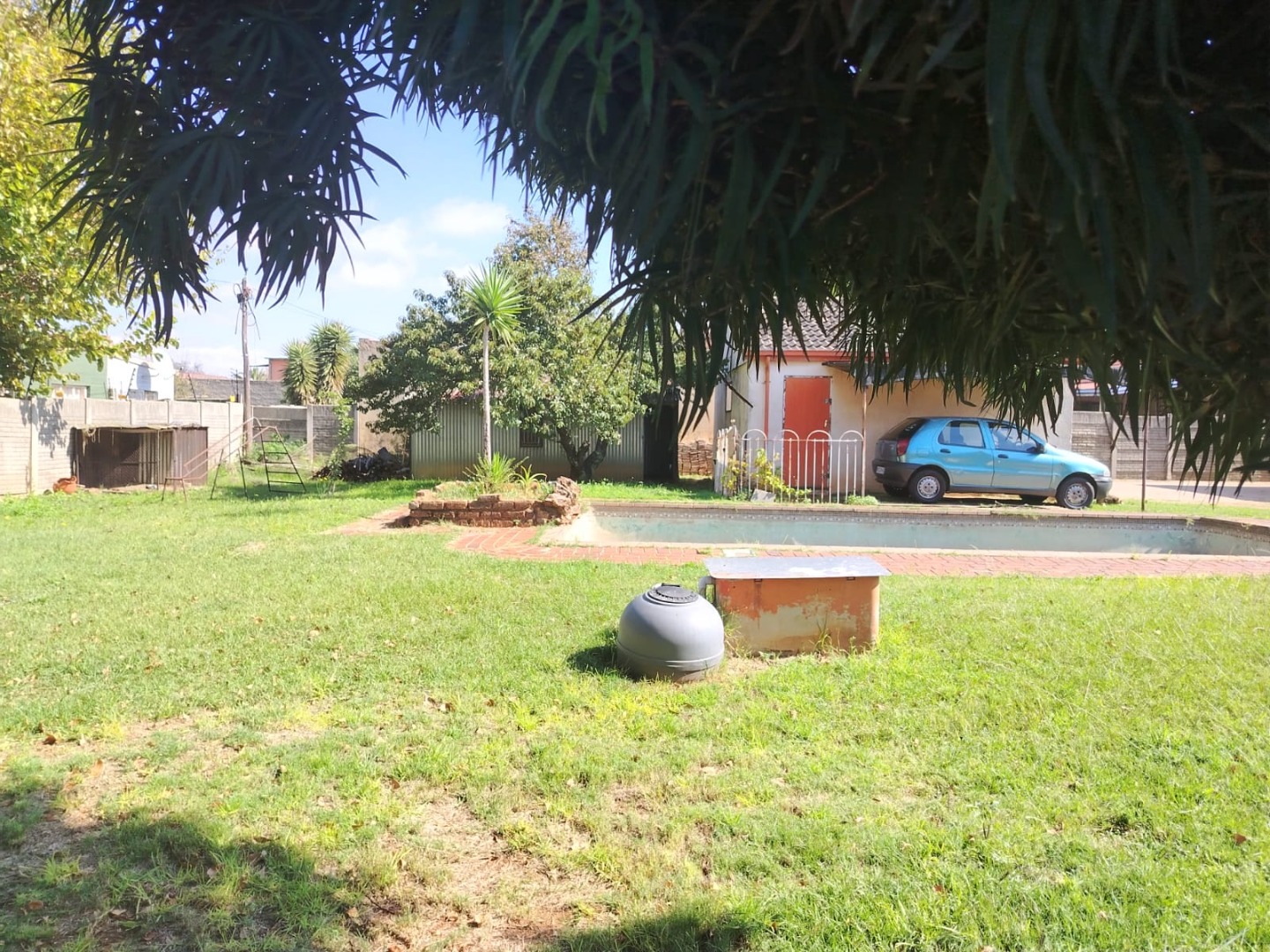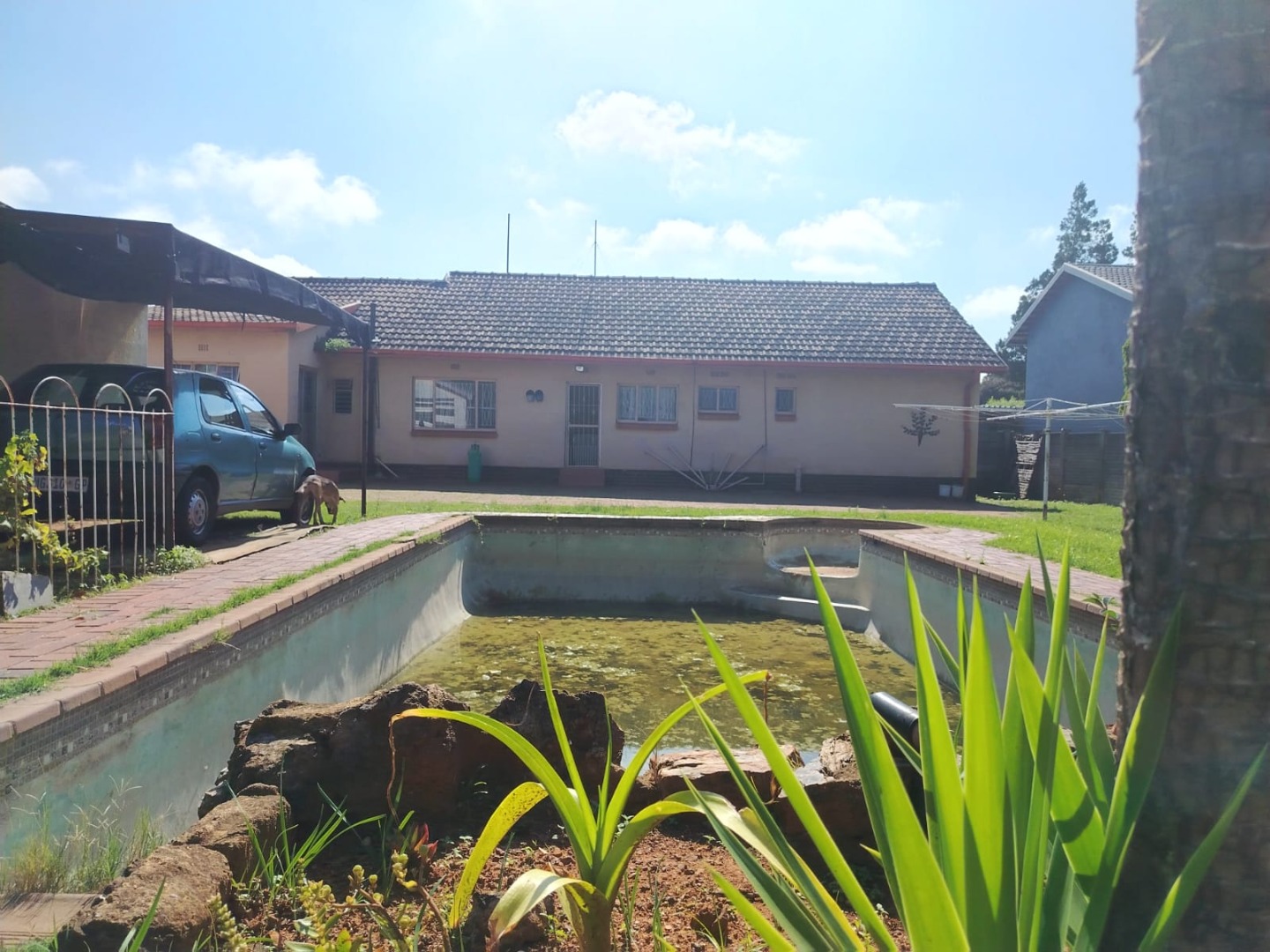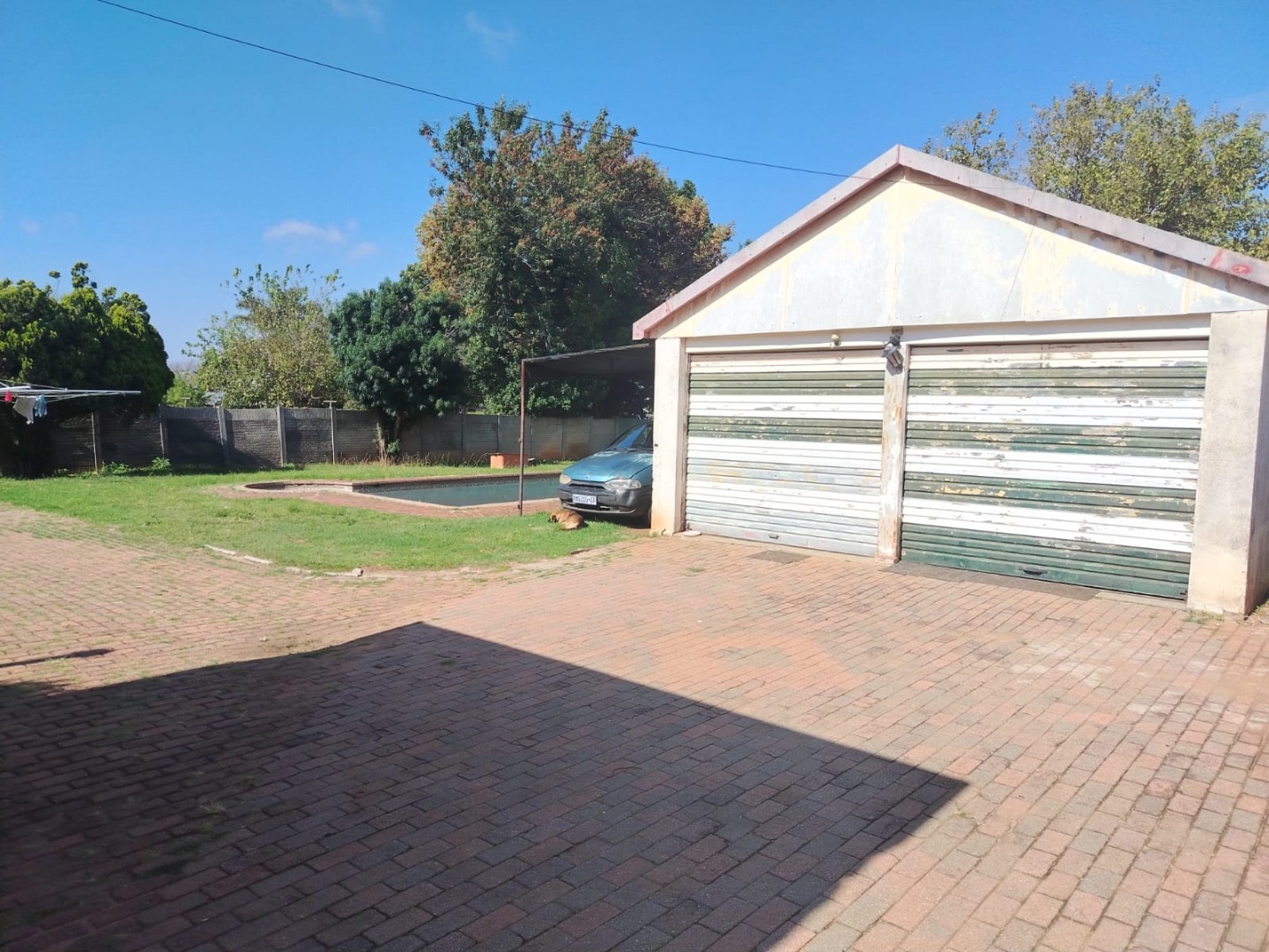 A spacious backyard features a double garage, carports, a tool shed, and a large swimming pool that need some tender loving care.