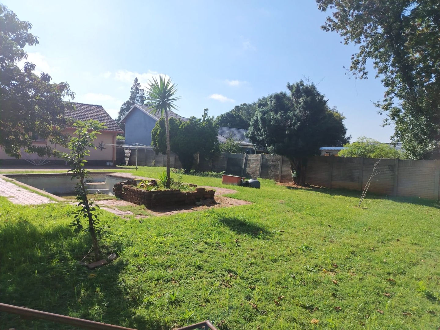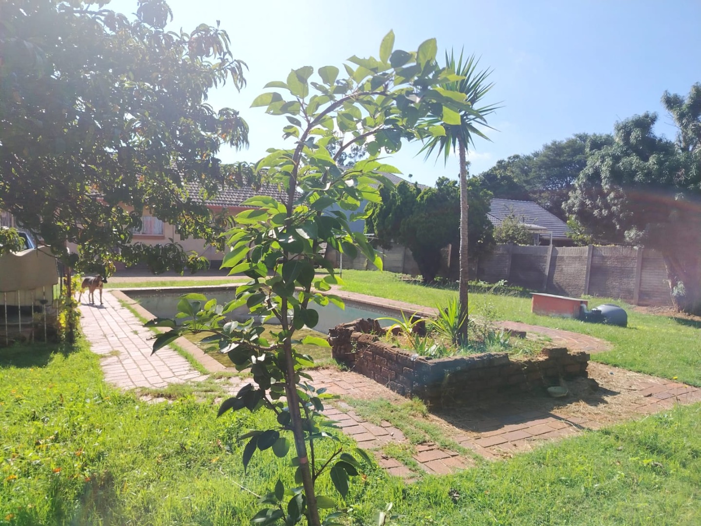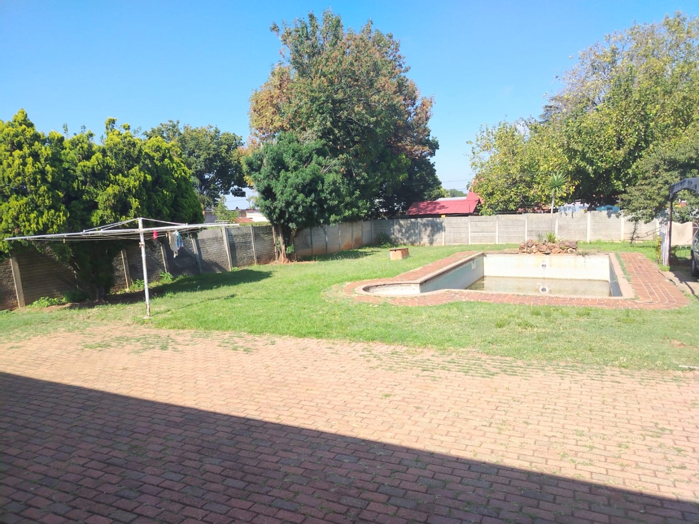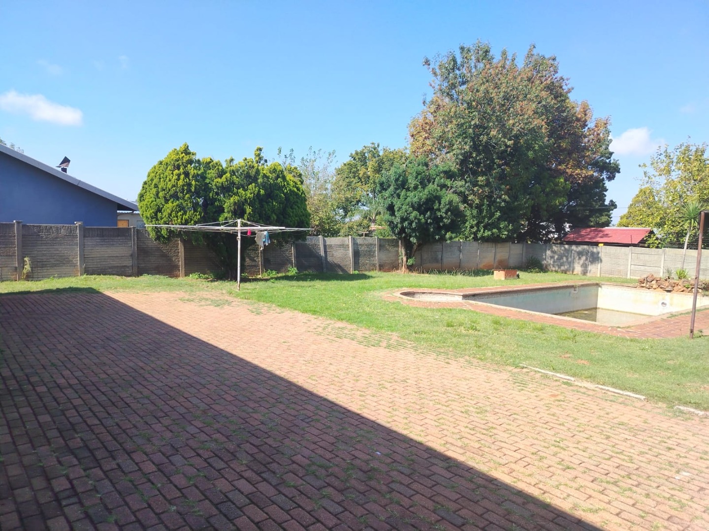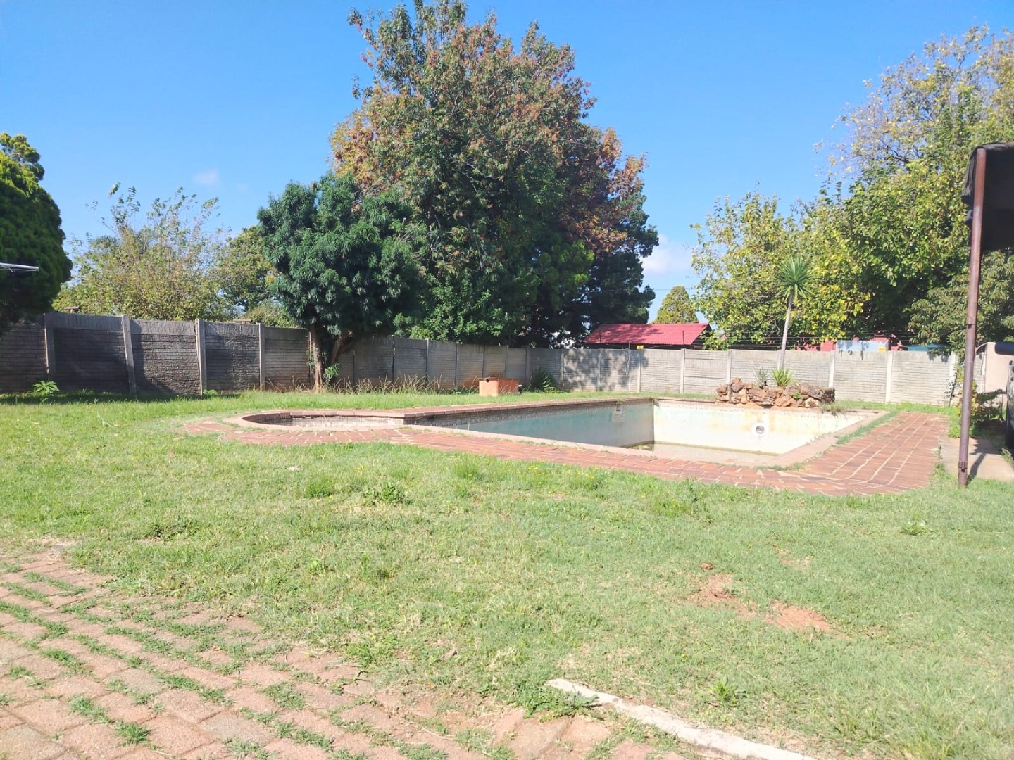 A spacious backyard features a double garage, carports, a tool shed, and a large swimming pool that need some tender loving care.