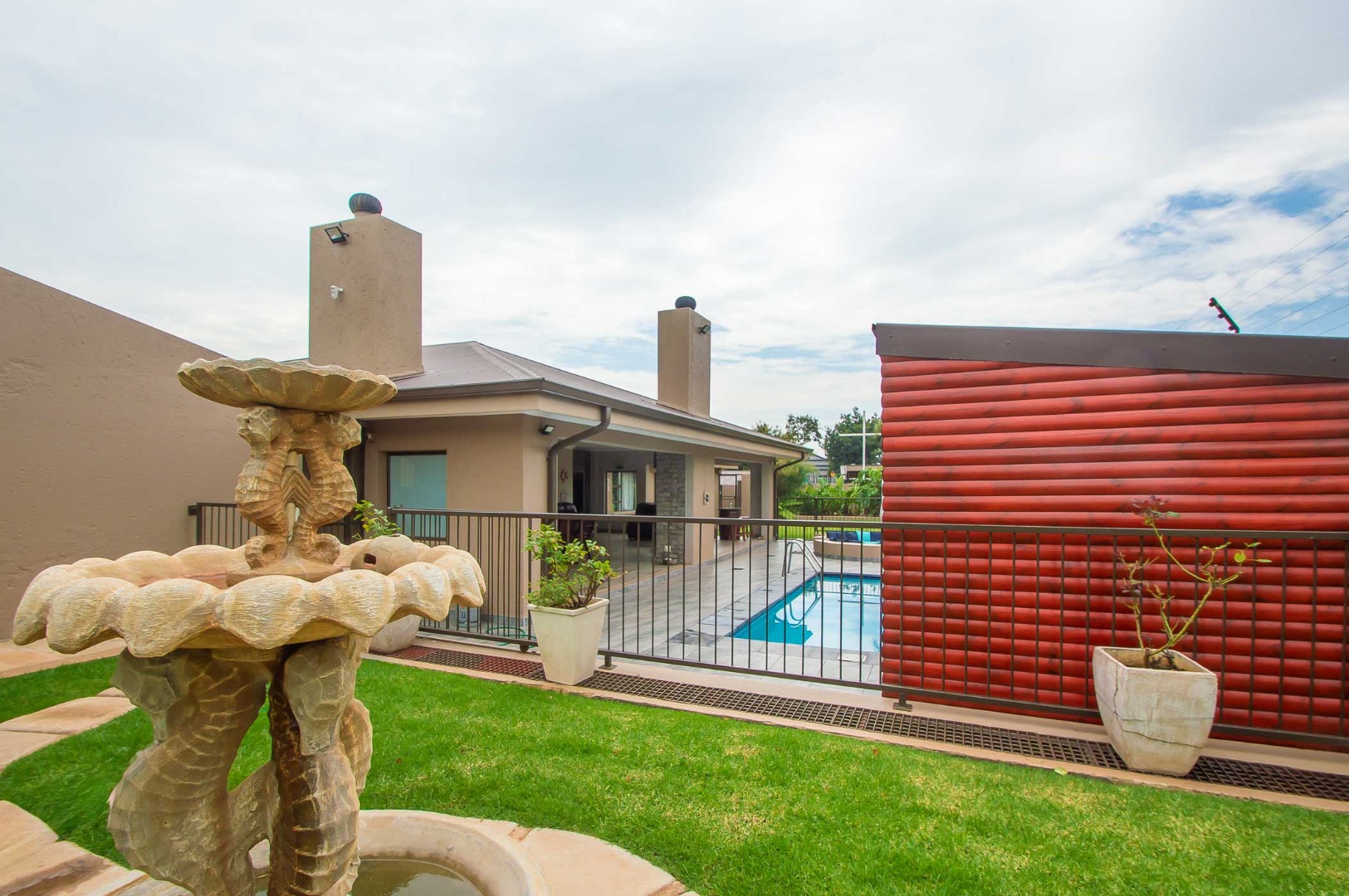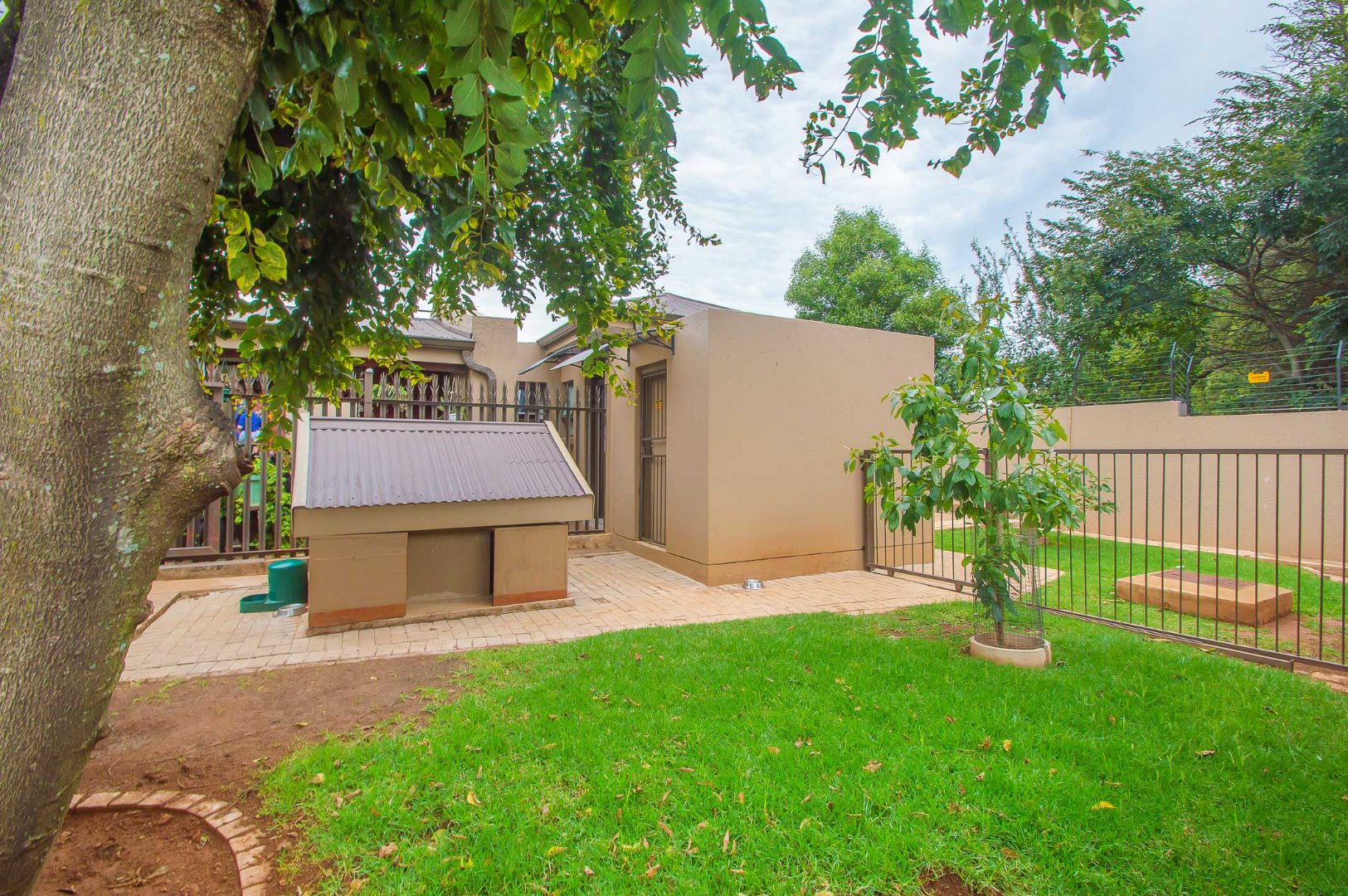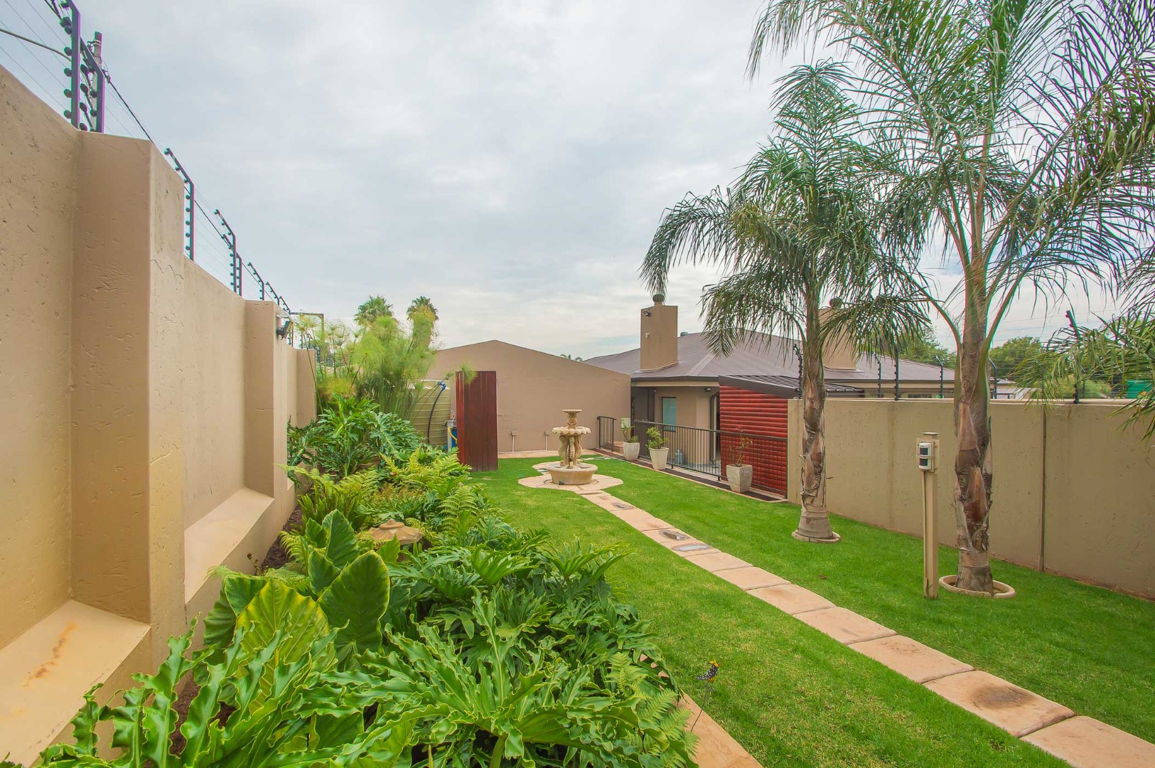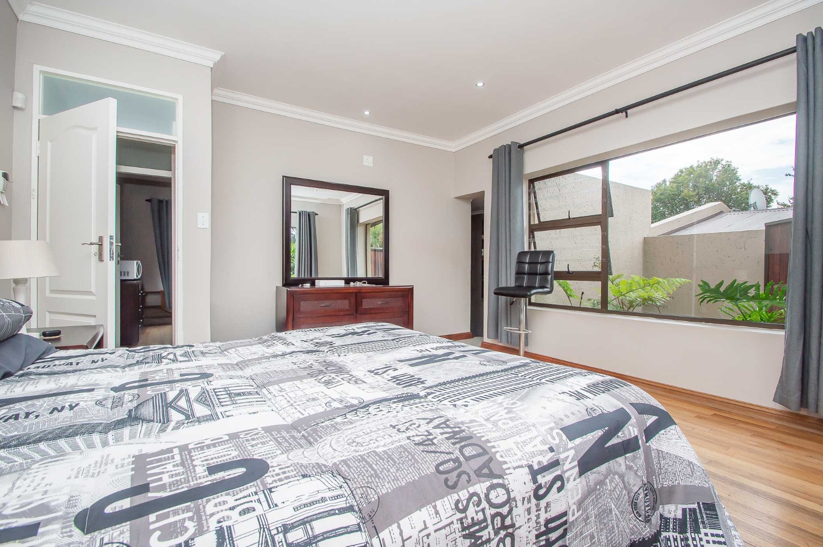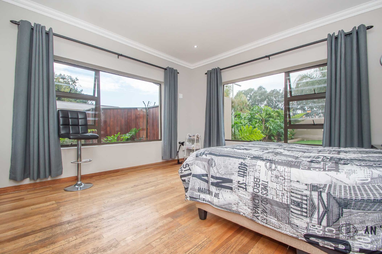 Four bedrooms complete this Abode – the main bedroom is double volume in size and has a view of the lush green garden, it has wooden flooring, led lighting, a walk-in wardrobe, and a modern full en suite bathroom that is tiled to the roof. The remaining three bedrooms are large in size, have modern built-in cupboards and are complimented by the second bathroom that is modern with a walk-in shower, toilet and his and hers basin. There is also a guest bathroom.