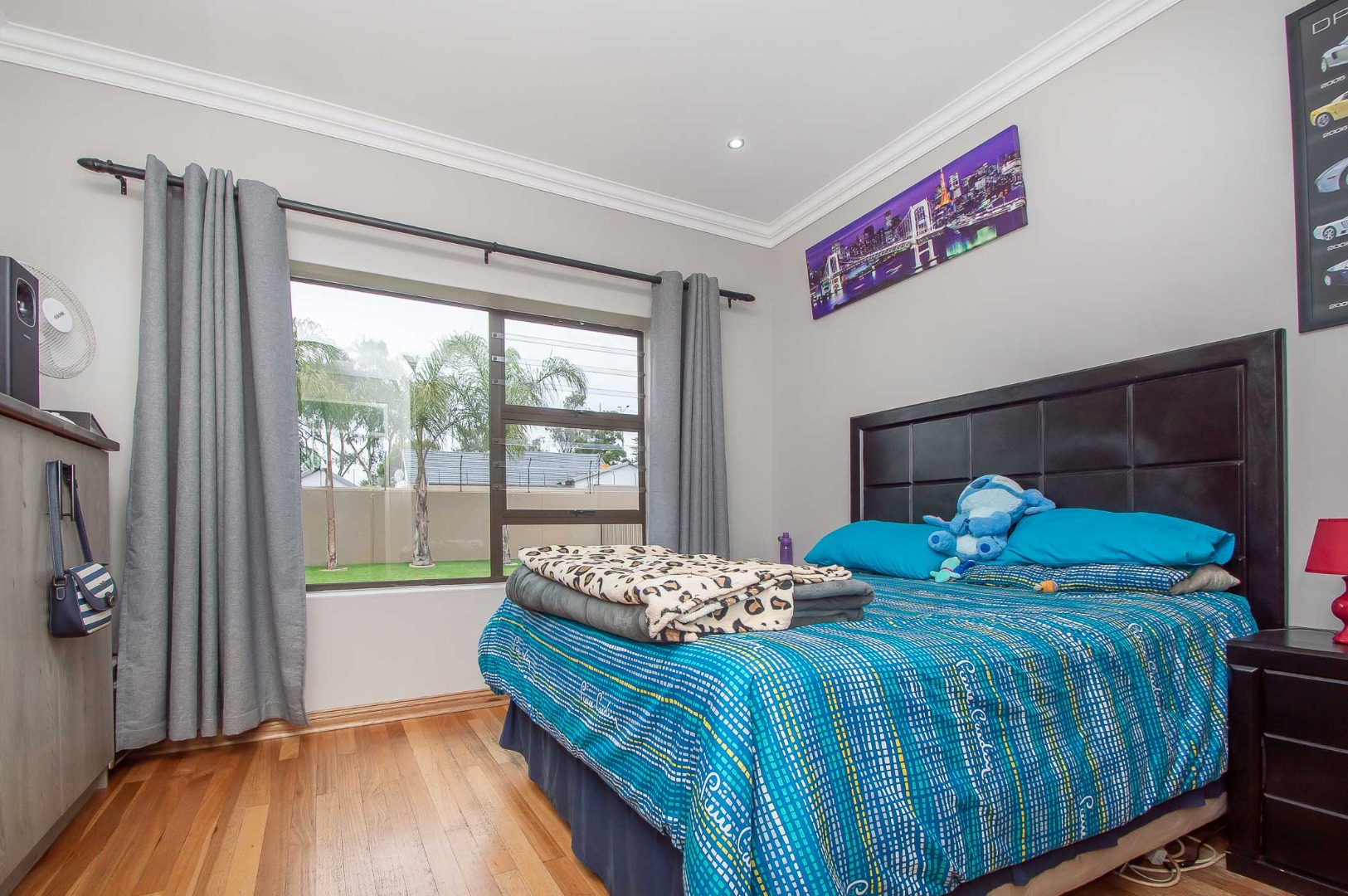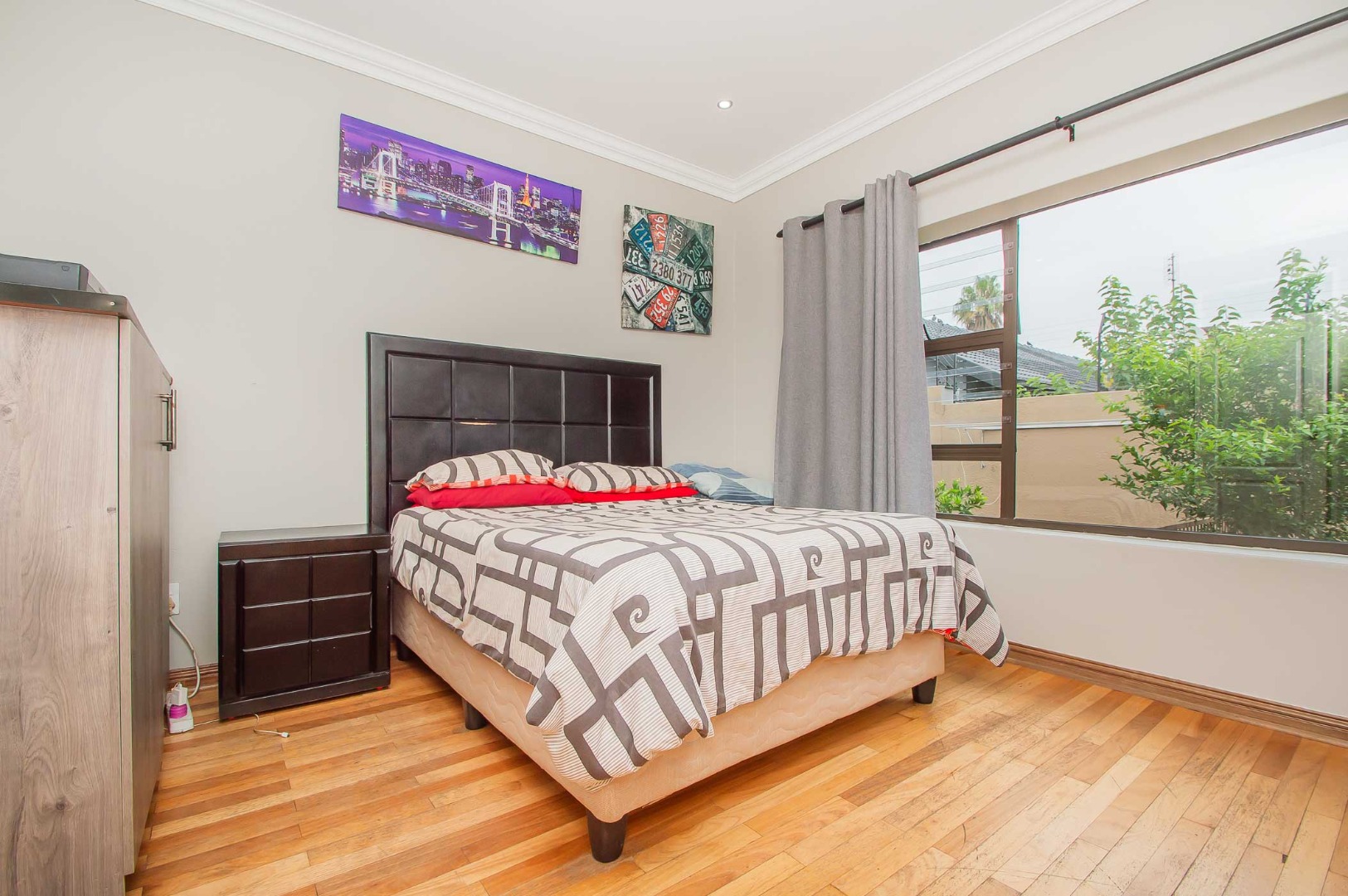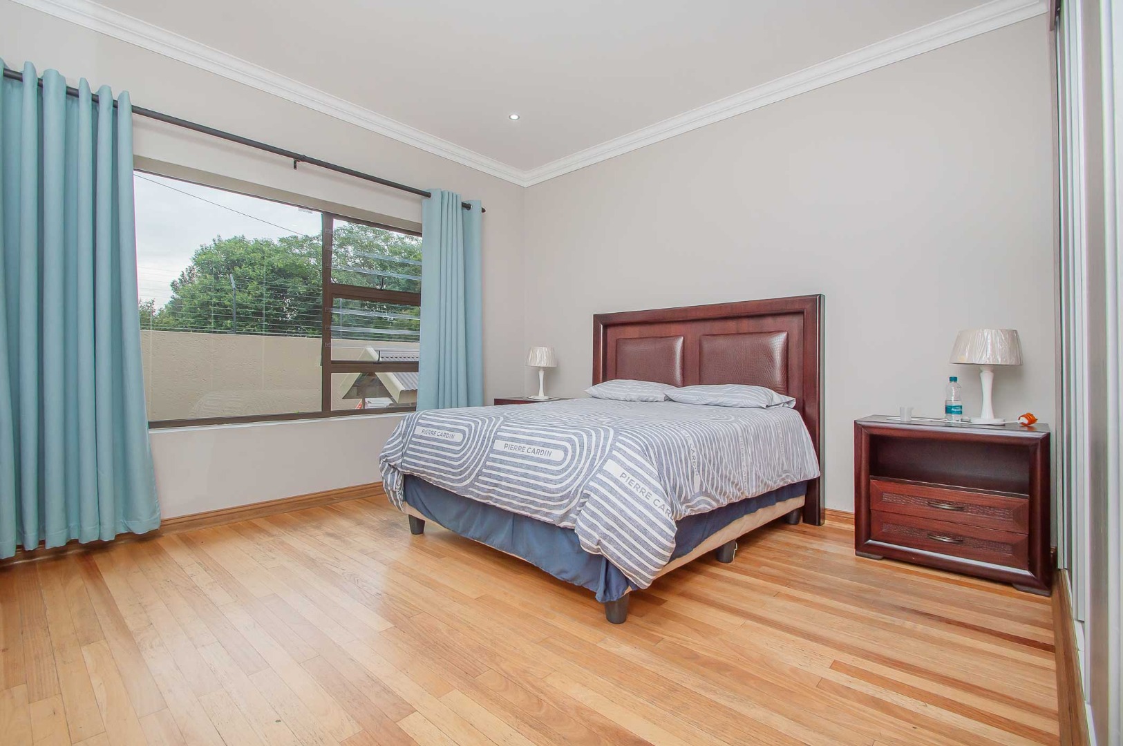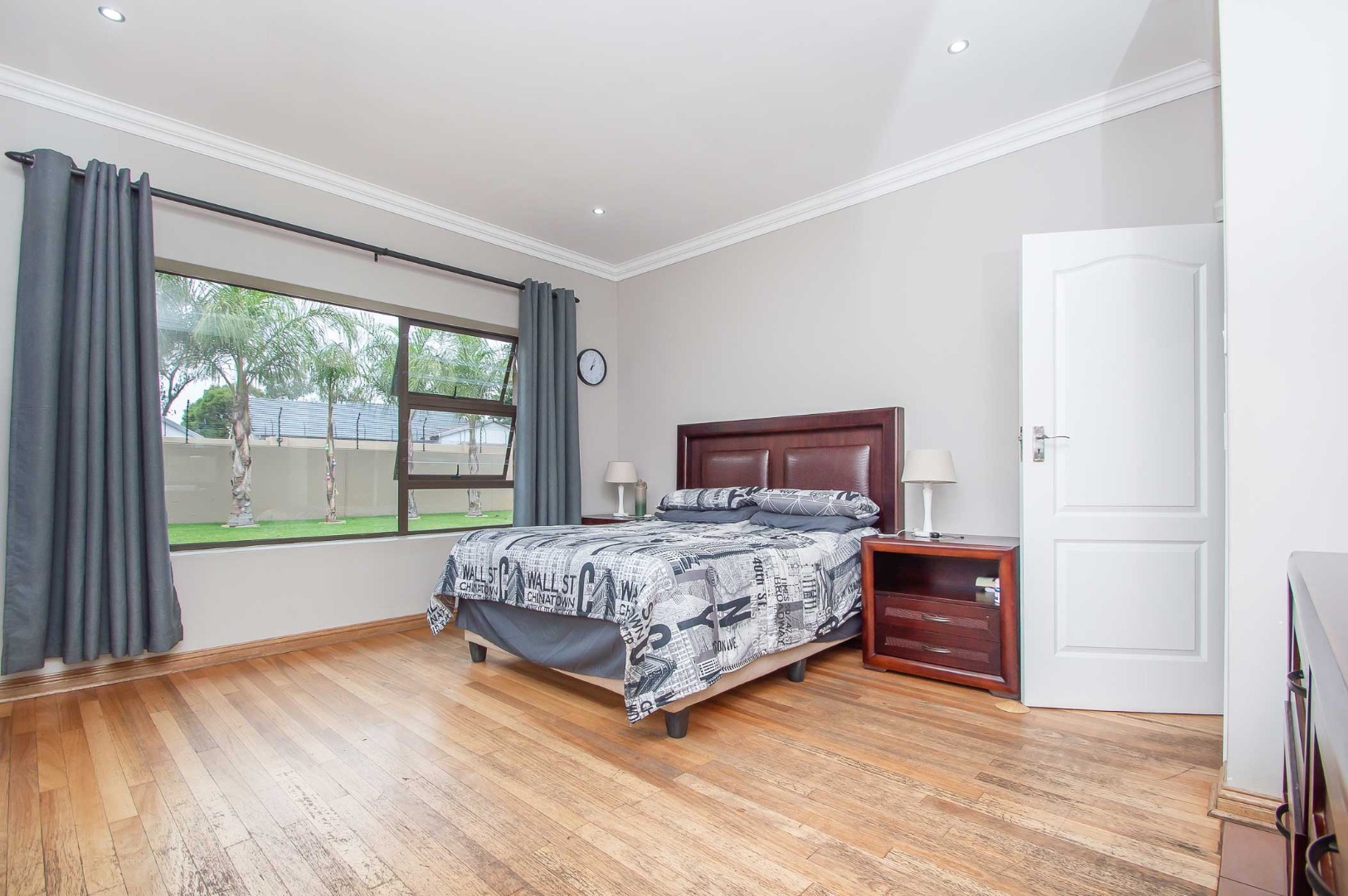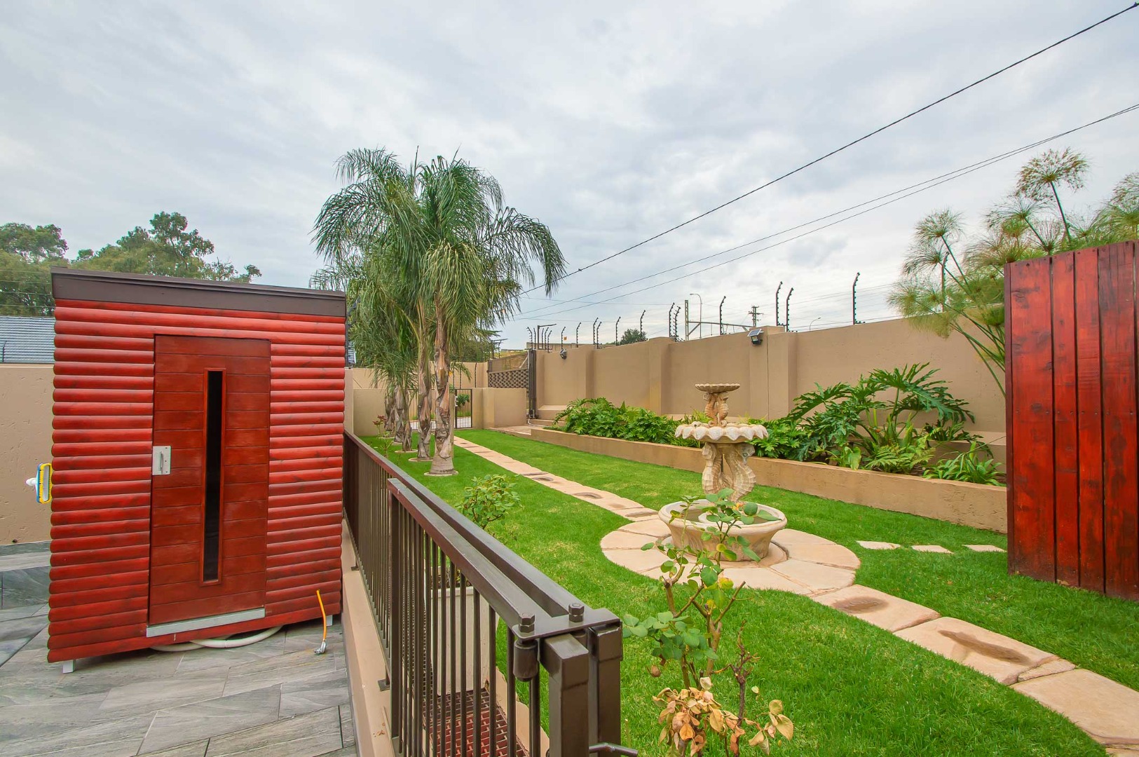 Four bedrooms complete this Abode – the main bedroom is double volume in size and has a view of the lush green garden, it has wooden flooring, led lighting, a walk-in wardrobe, and a modern full en suite bathroom that is tiled to the roof. The remaining three bedrooms are large in size, have modern built-in cupboards and are complimented by the second bathroom that is modern with a walk-in shower, toilet and his and hers basin. There is also a guest bathroom.