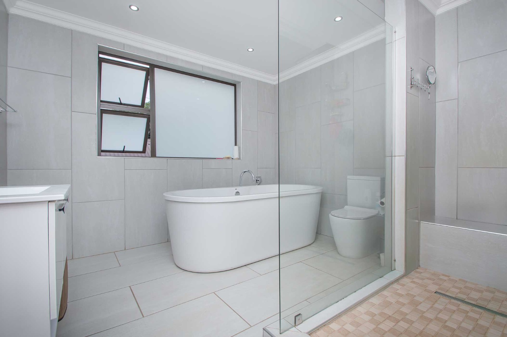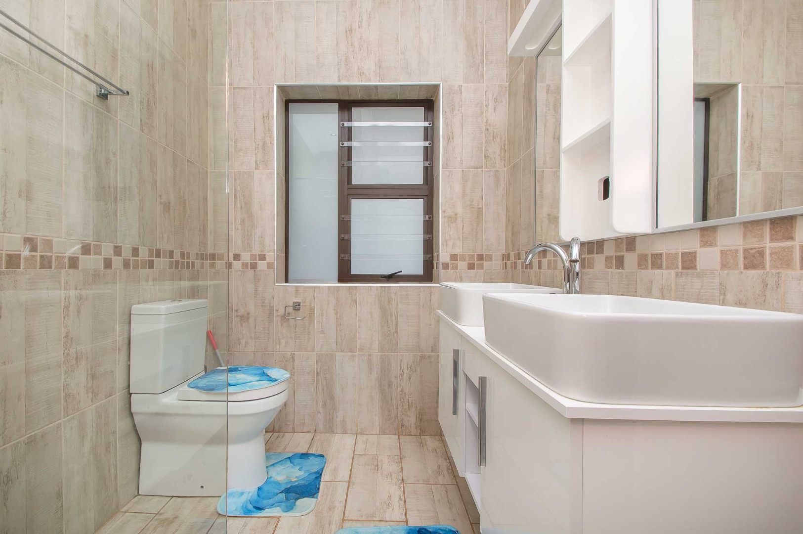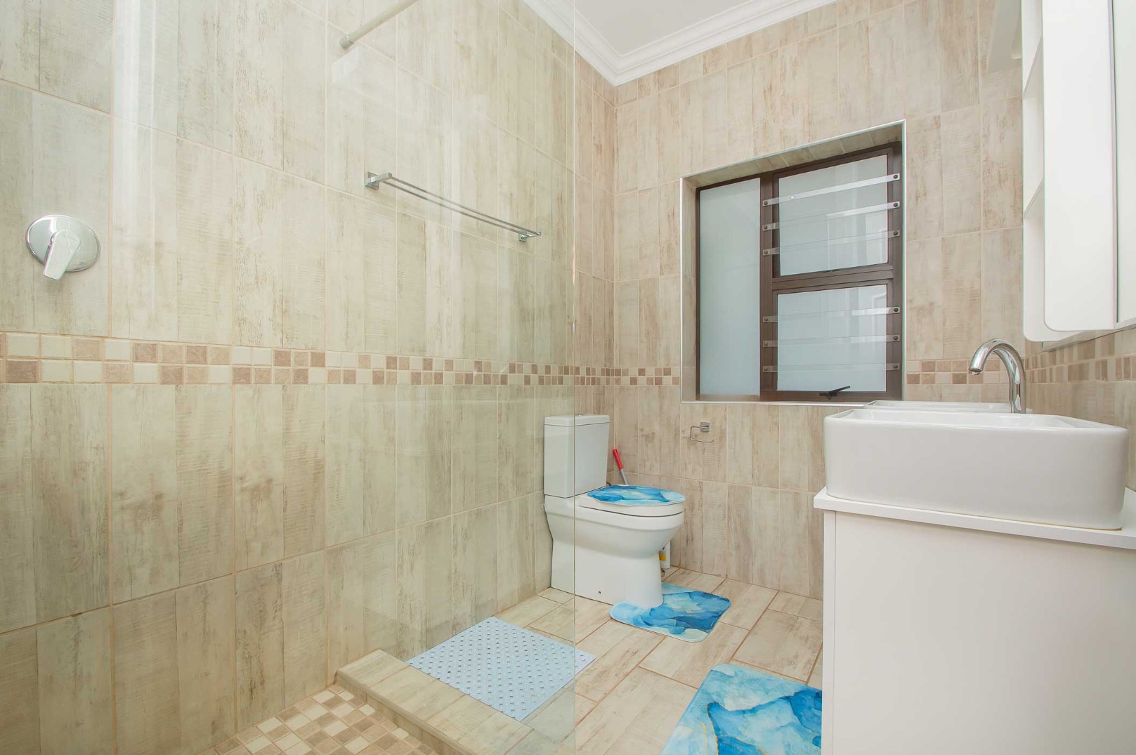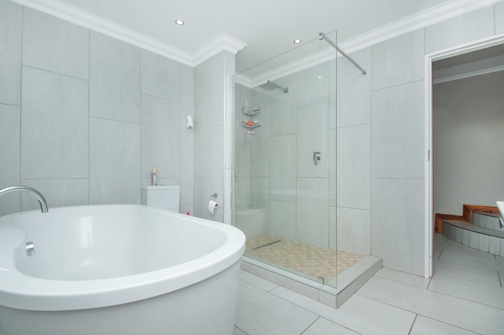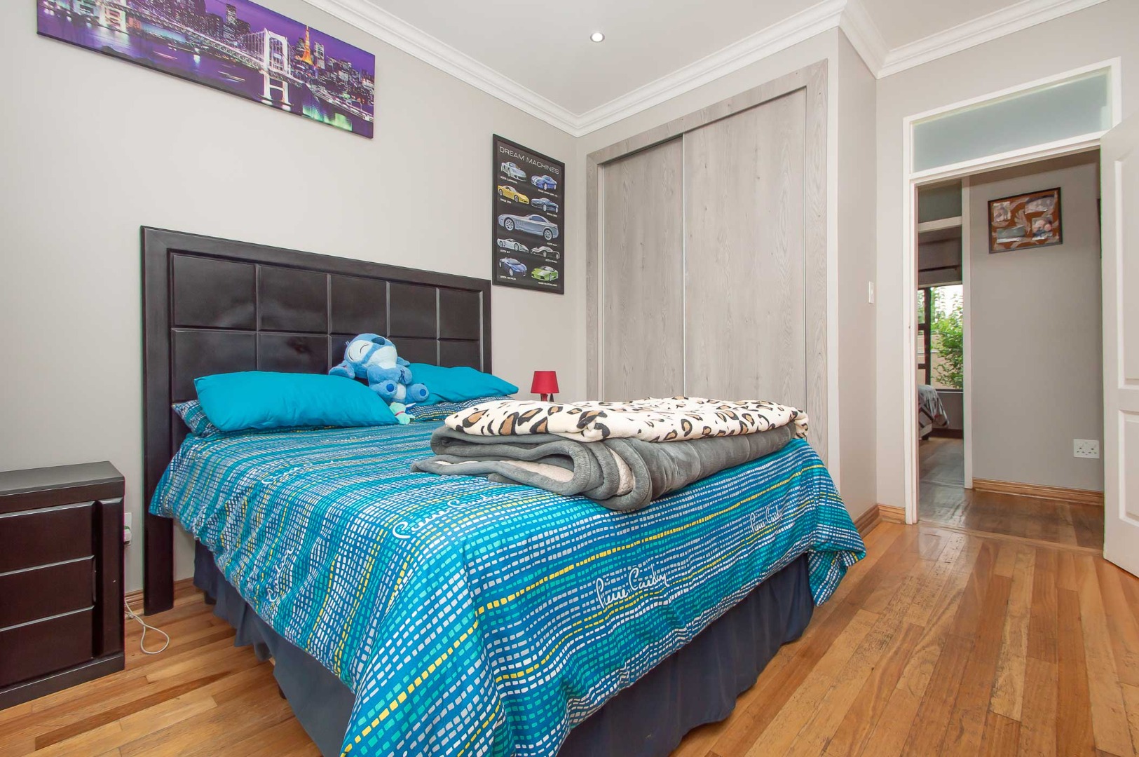 Four bedrooms complete this Abode – the main bedroom is double volume in size and has a view of the lush green garden, it has wooden flooring, led lighting, a walk-in wardrobe, and a modern full en suite bathroom that is tiled to the roof. The remaining three bedrooms are large in size, have modern built-in cupboards and are complimented by the second bathroom that is modern with a walk-in shower, toilet and his and hers basin. There is also a guest bathroom.