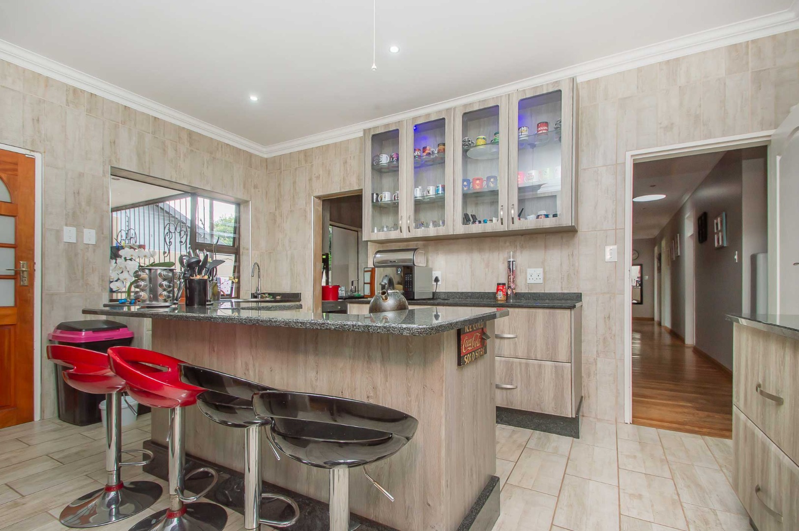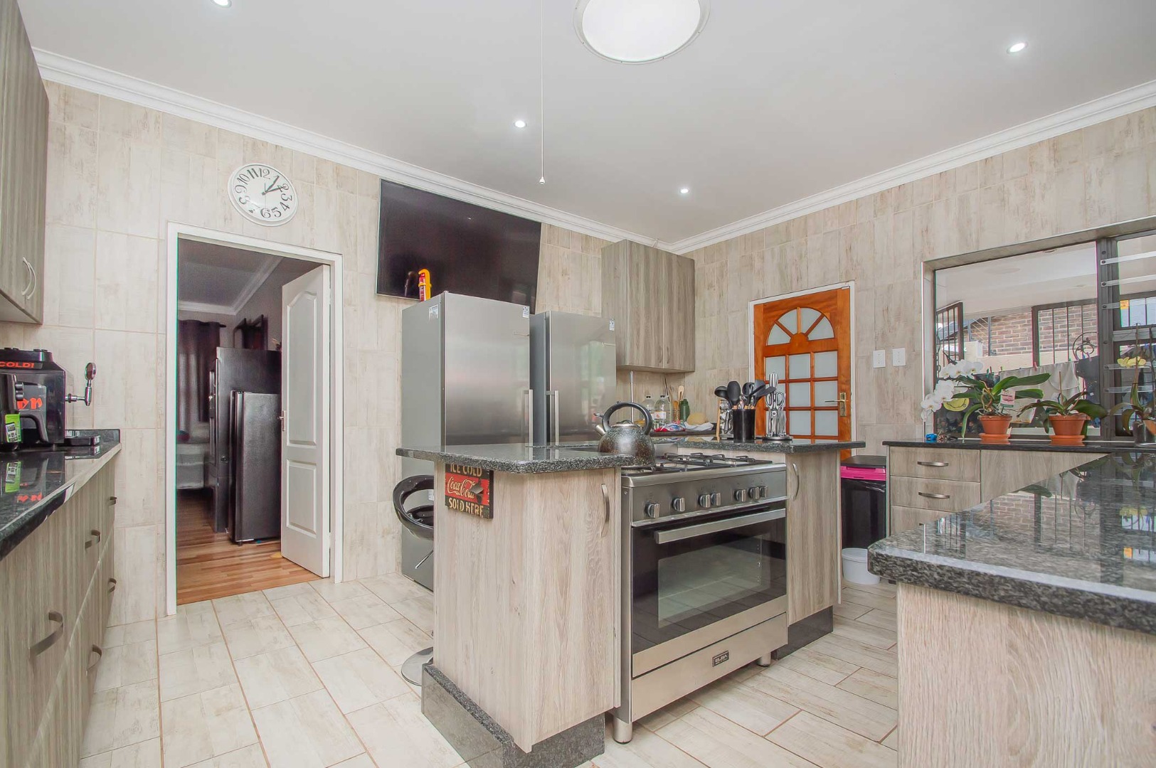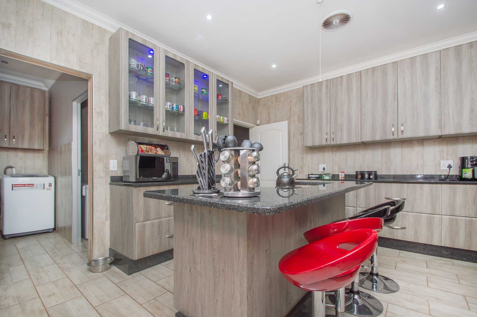 Expansive gourmet kitchen with a centre island, gas hob and oven, granite tops, ample cupboard space, space for a double door fridge, extractor fan, led lights, a skylight, separate scullery and a pantry. The kitchen leads out to the back patio with direct access from the double automated garage.