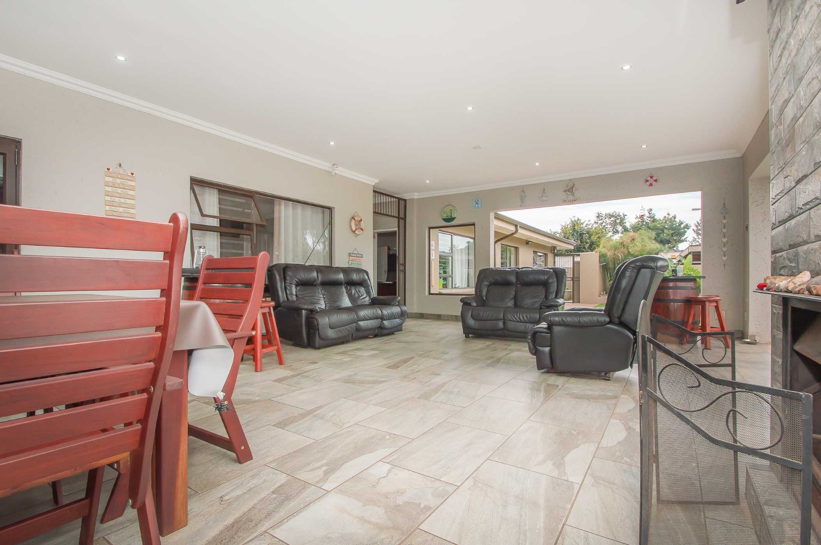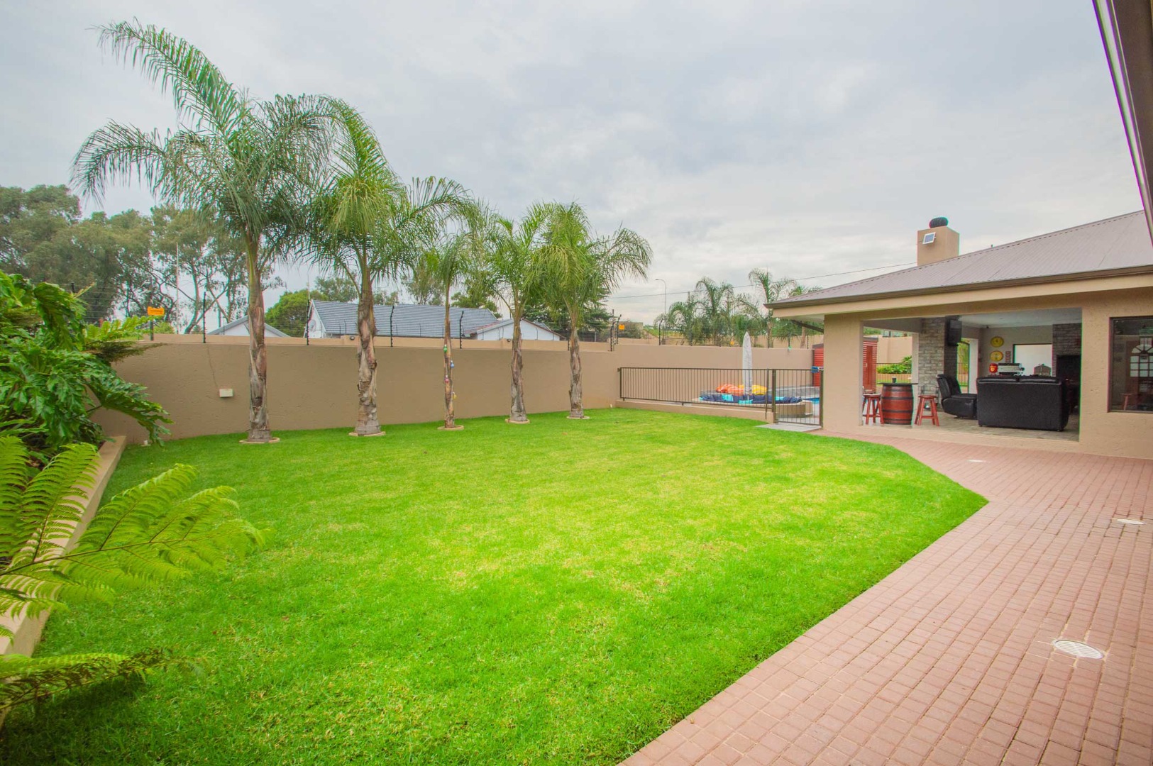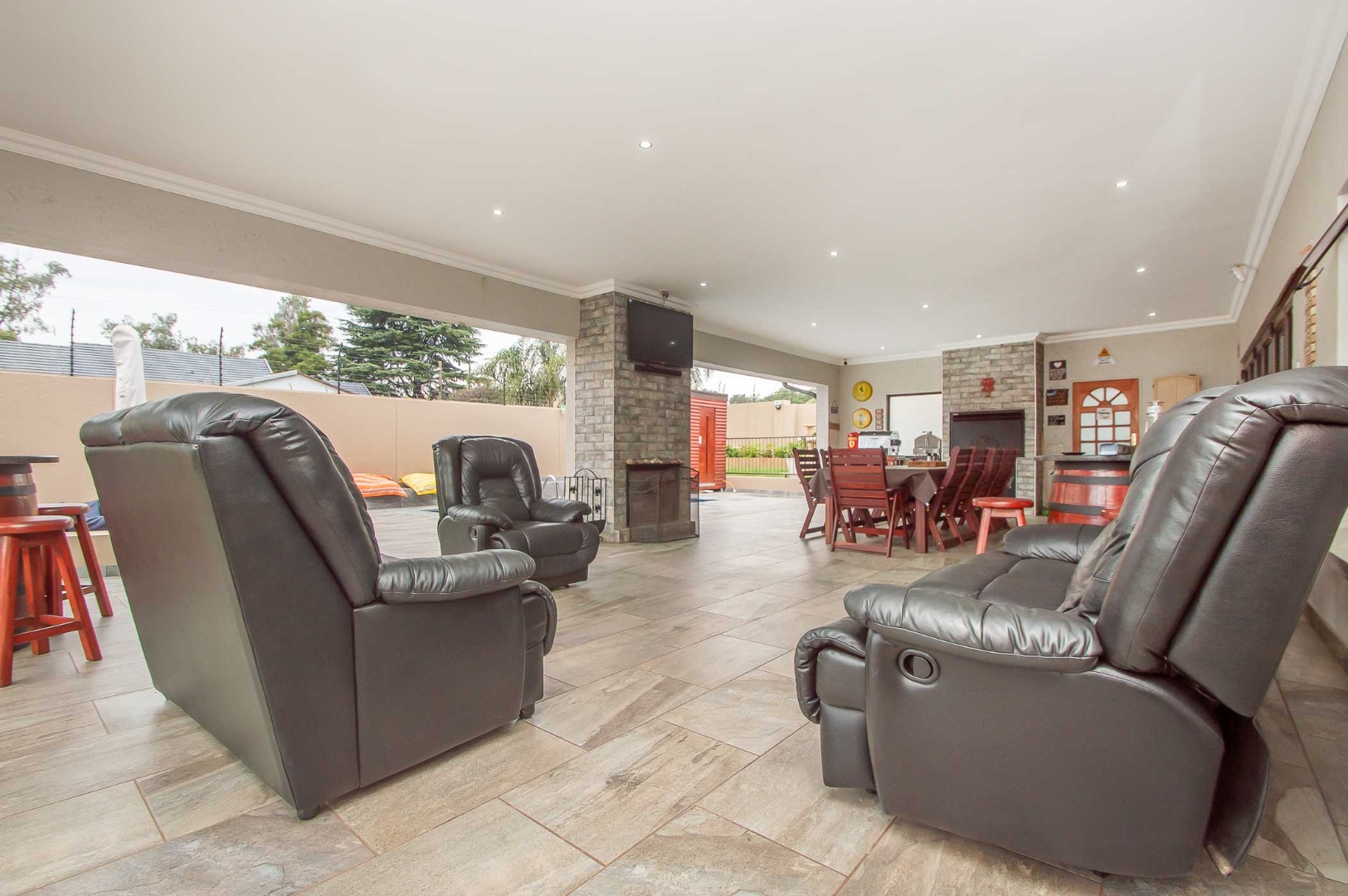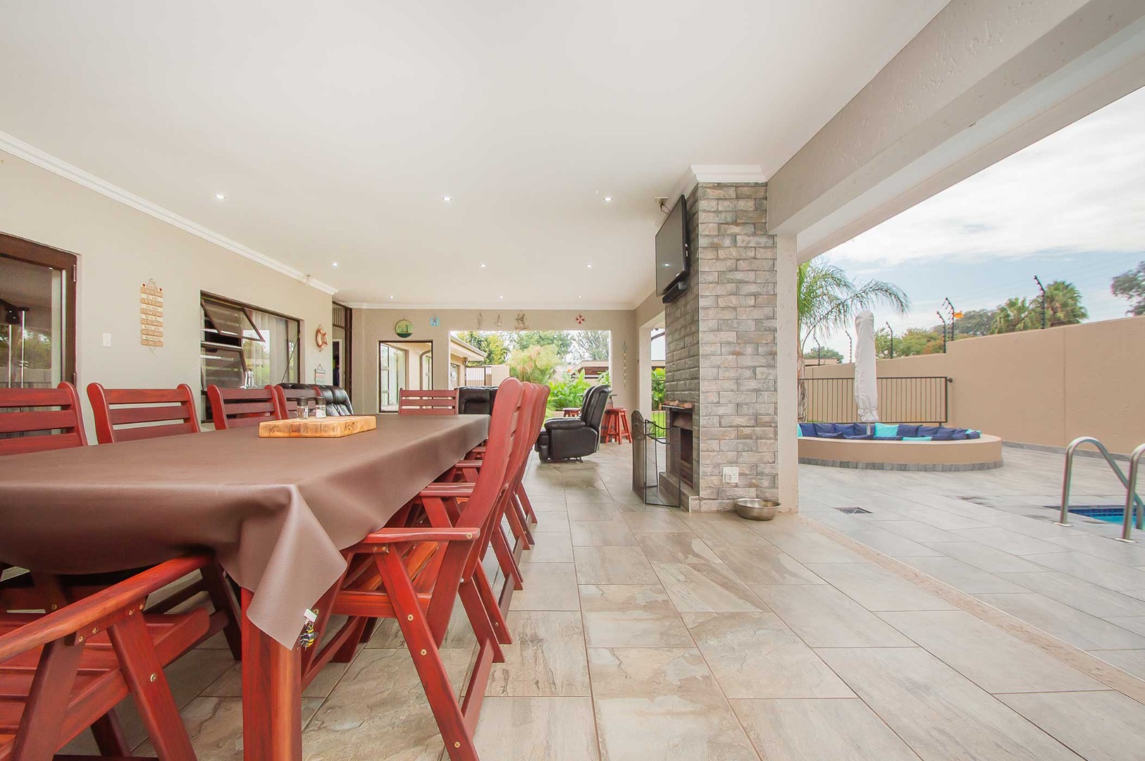 The first lounge is situated as you come into the Home, across from it is a large office. The main living area is expansive, has wooden flooring, led lighting and aluminium stacking doors that open on to the undercover patio. The patio is tiled, has led lighting, a built-in braai, a fireplace and overlooks the blue sparkling pool with a sauna and manicured green garden.