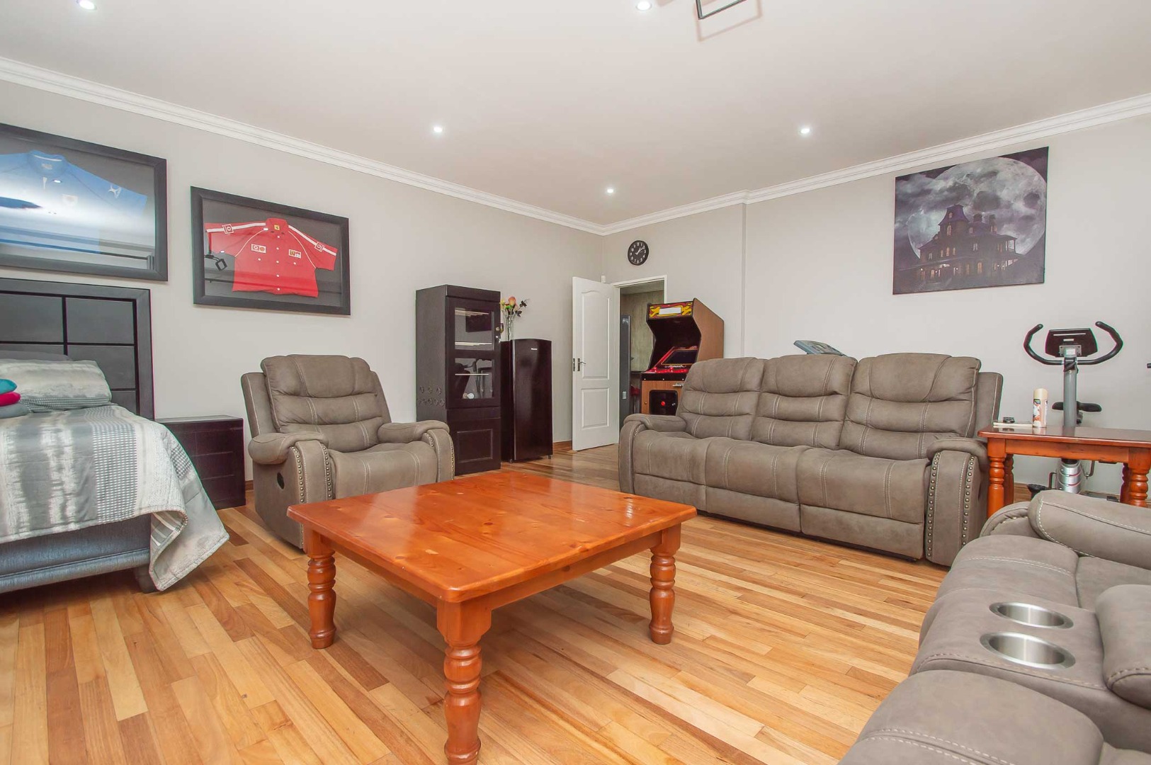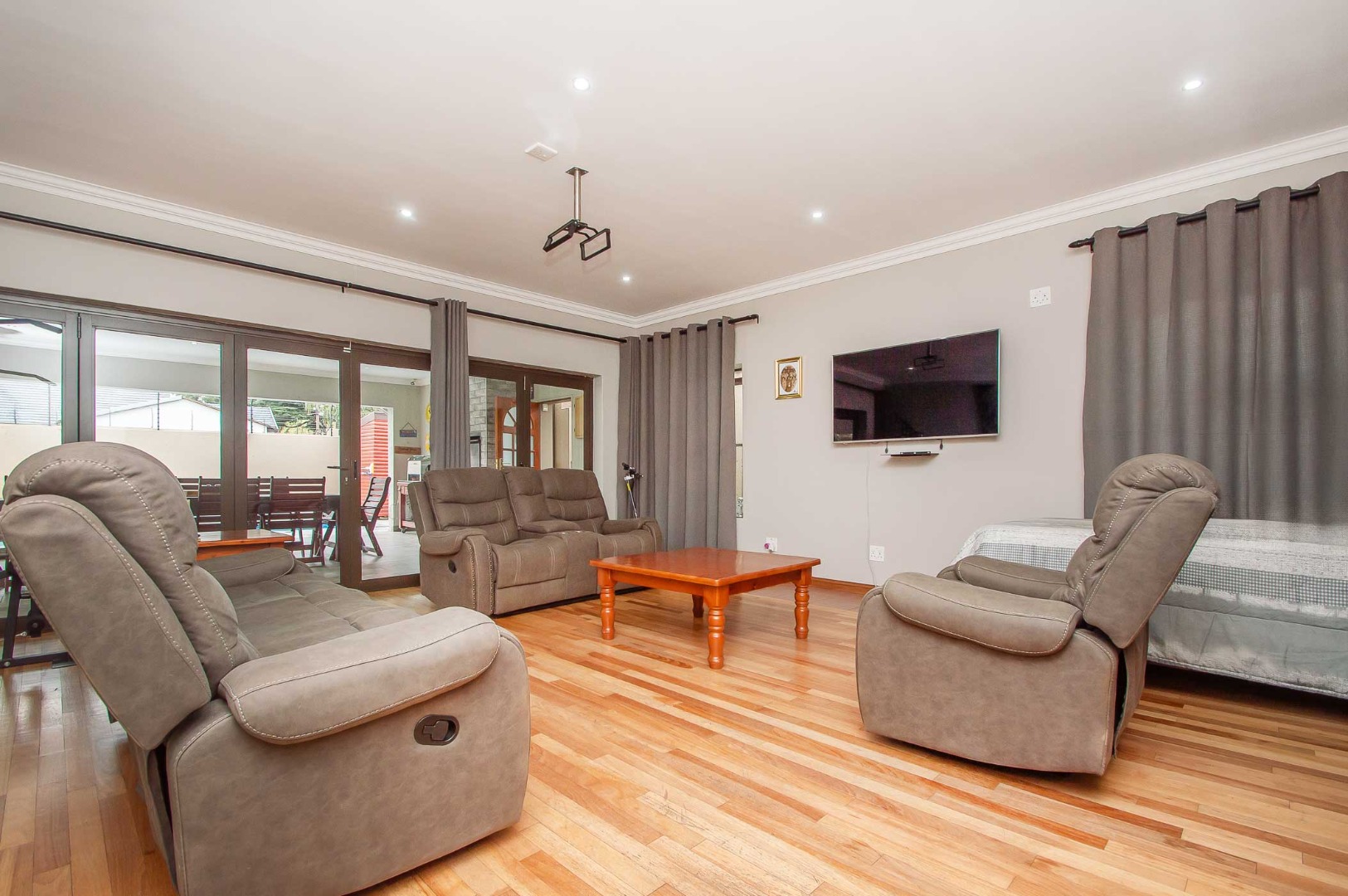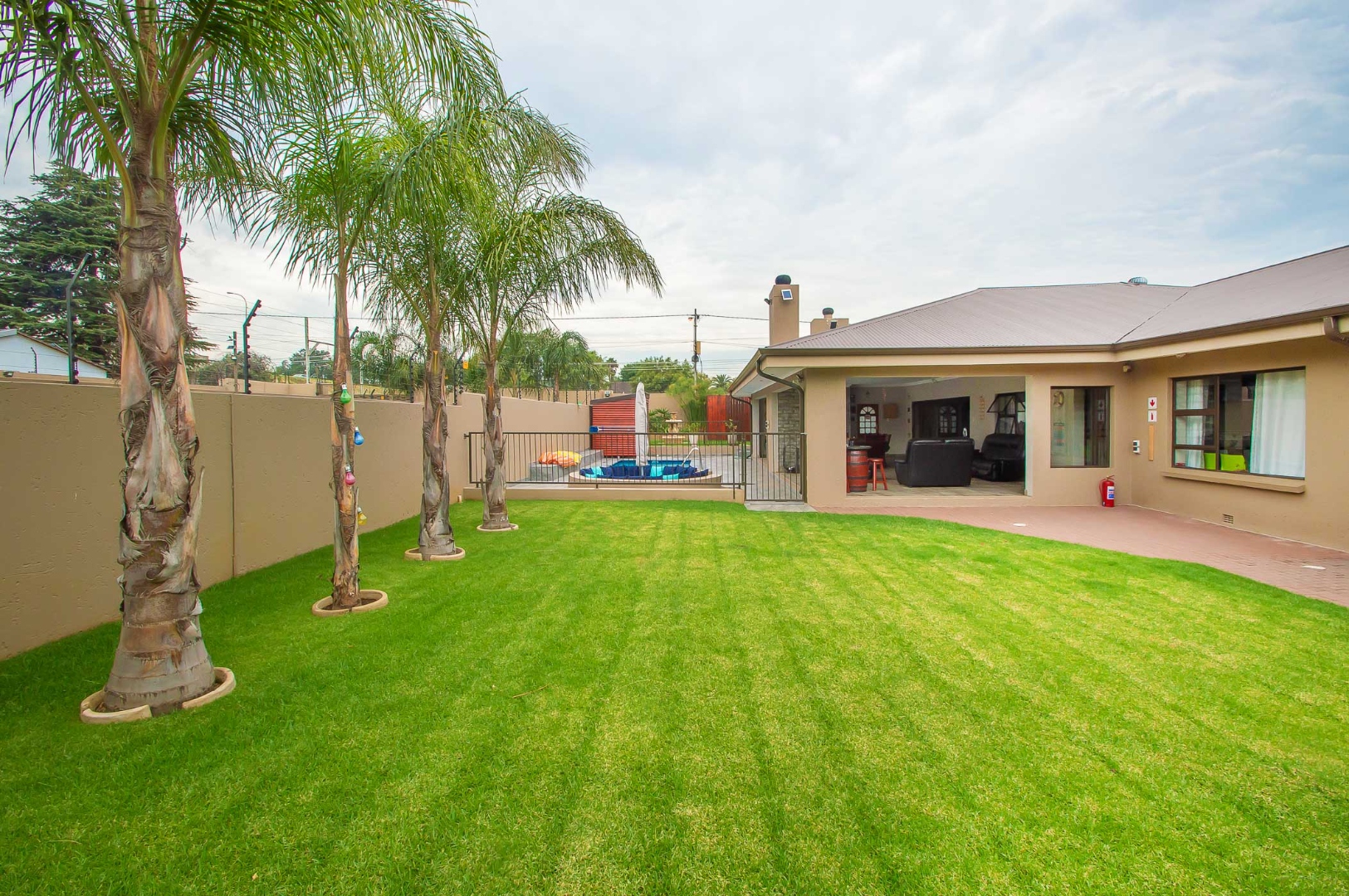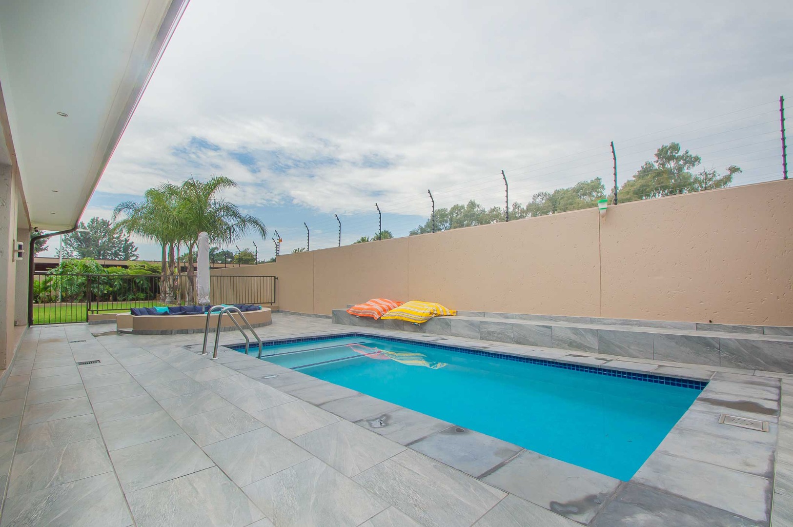 The first lounge is situated as you come into the Home, across from it is a large office. The main living area is expansive, has wooden flooring, led lighting and aluminium stacking doors that open on to the undercover patio. The patio is tiled, has led lighting, a built-in braai, a fireplace and overlooks the blue sparkling pool with a sauna and manicured green garden.