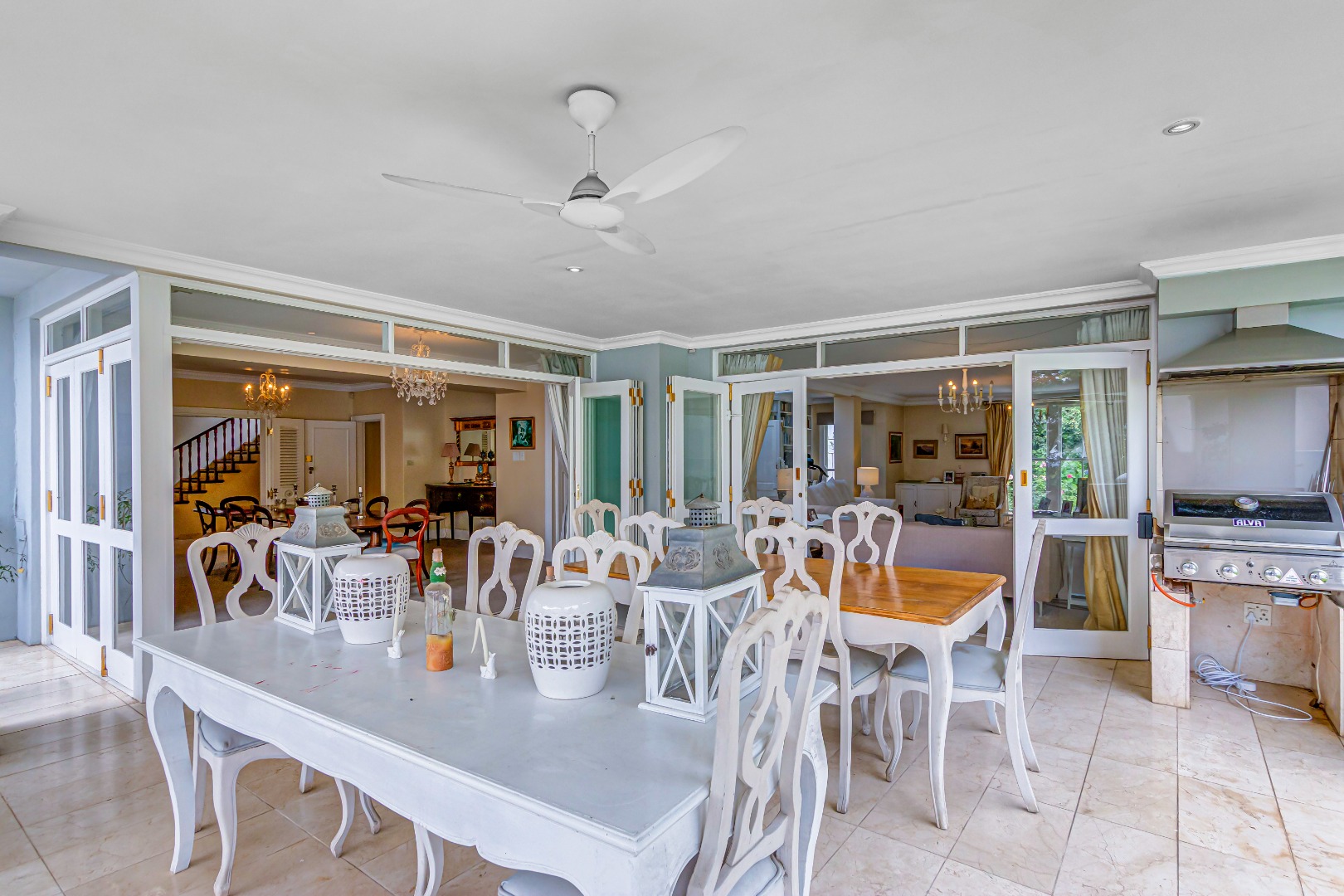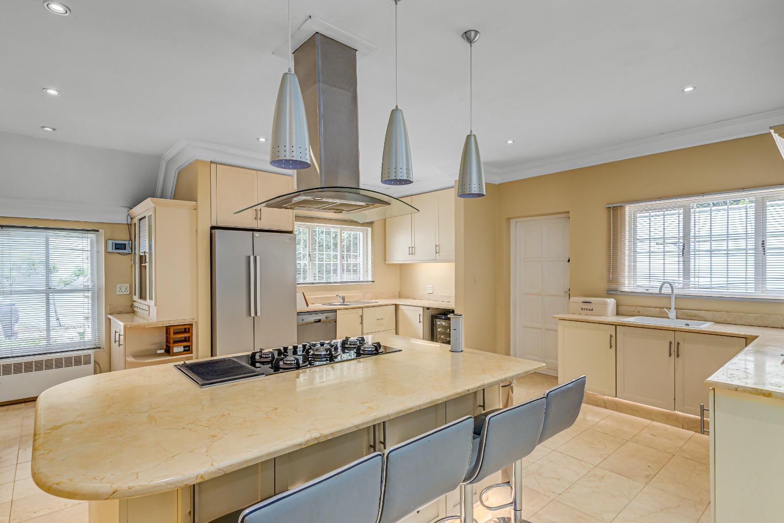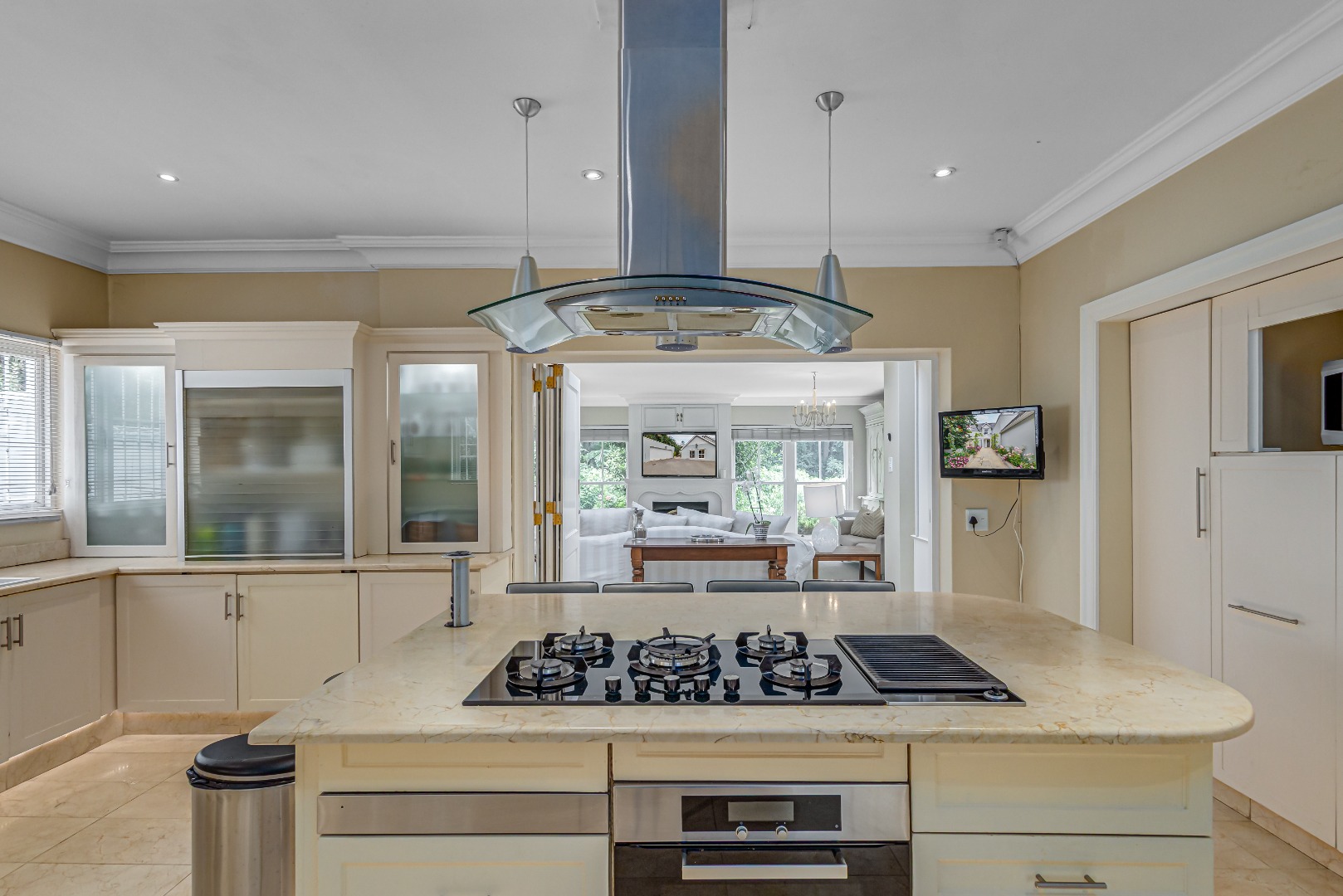 At the heart of the home is a luxurious open-plan gourmet kitchen featuring a substantial central island with integrated gas hob and oven, cream cabinetry, Crema Marfil marble floor tiles and countertops, and premium appliances, perfectly suited to both sophisticated entertaining and everyday living.